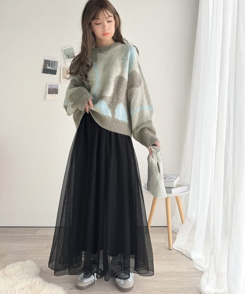 ふわふわのシャギーニットやモヘアニットとの組み合わせで、温かみと女性らしさを両立します。