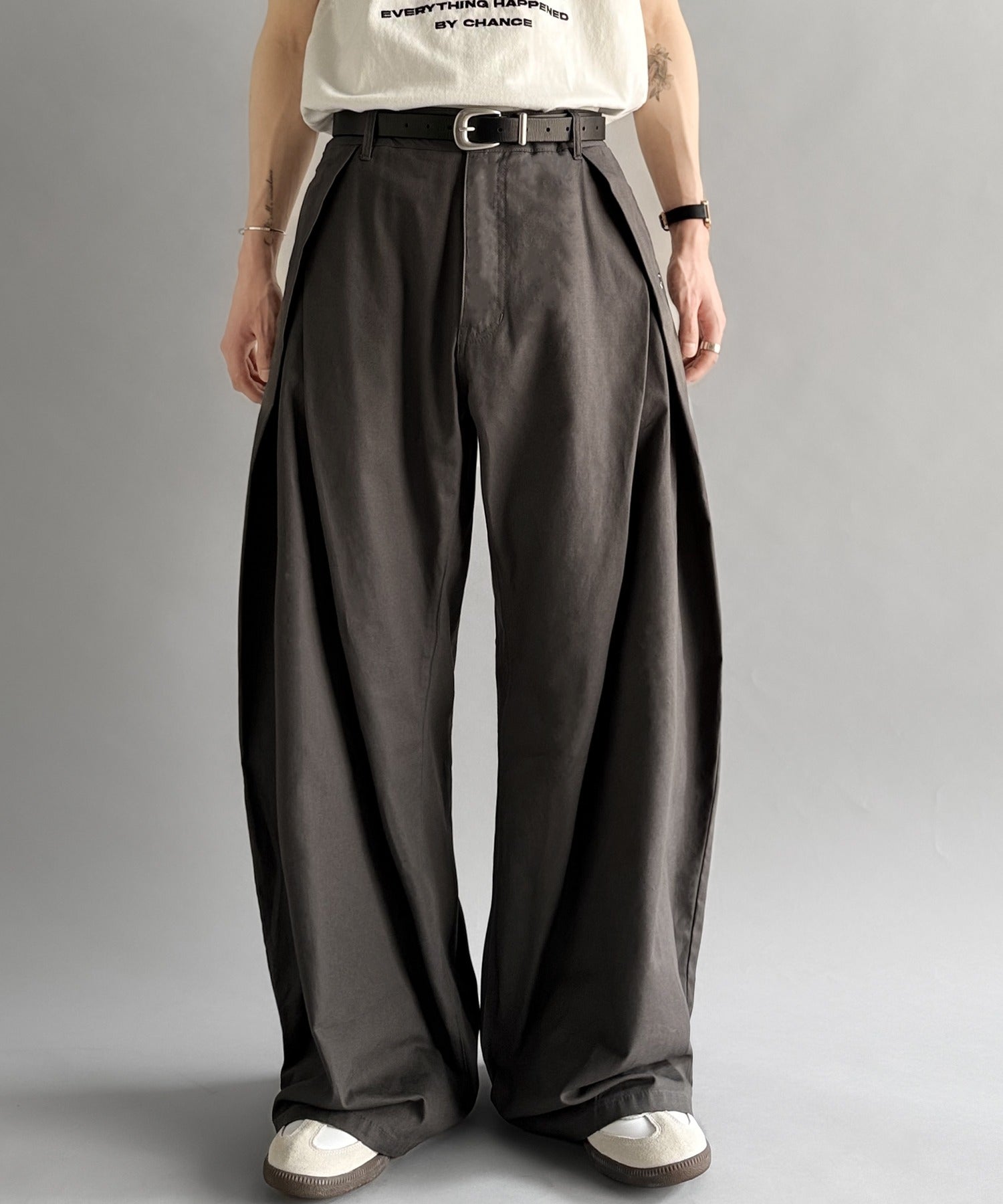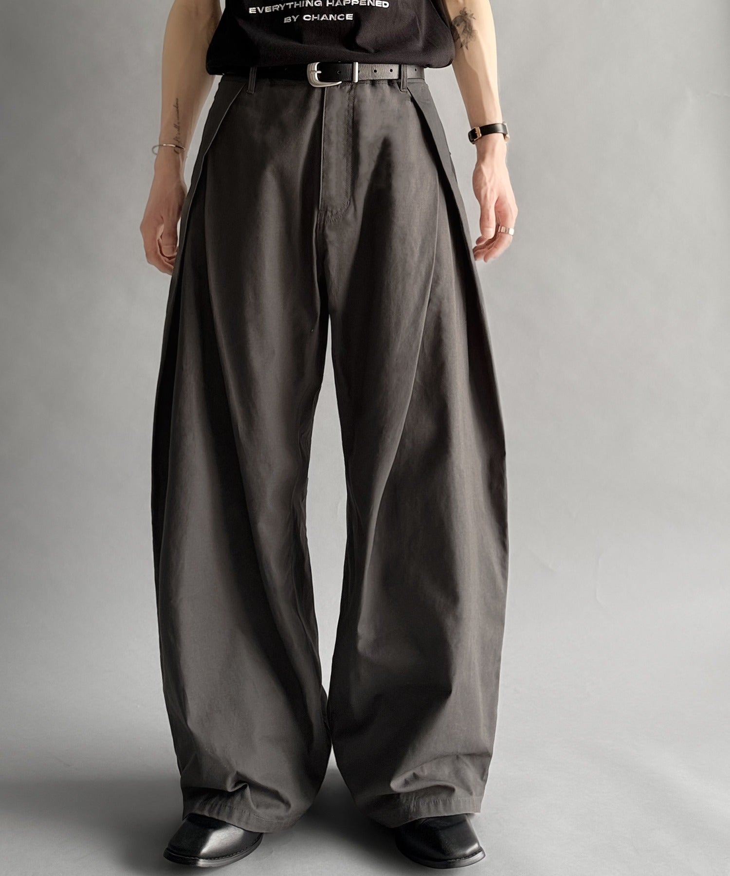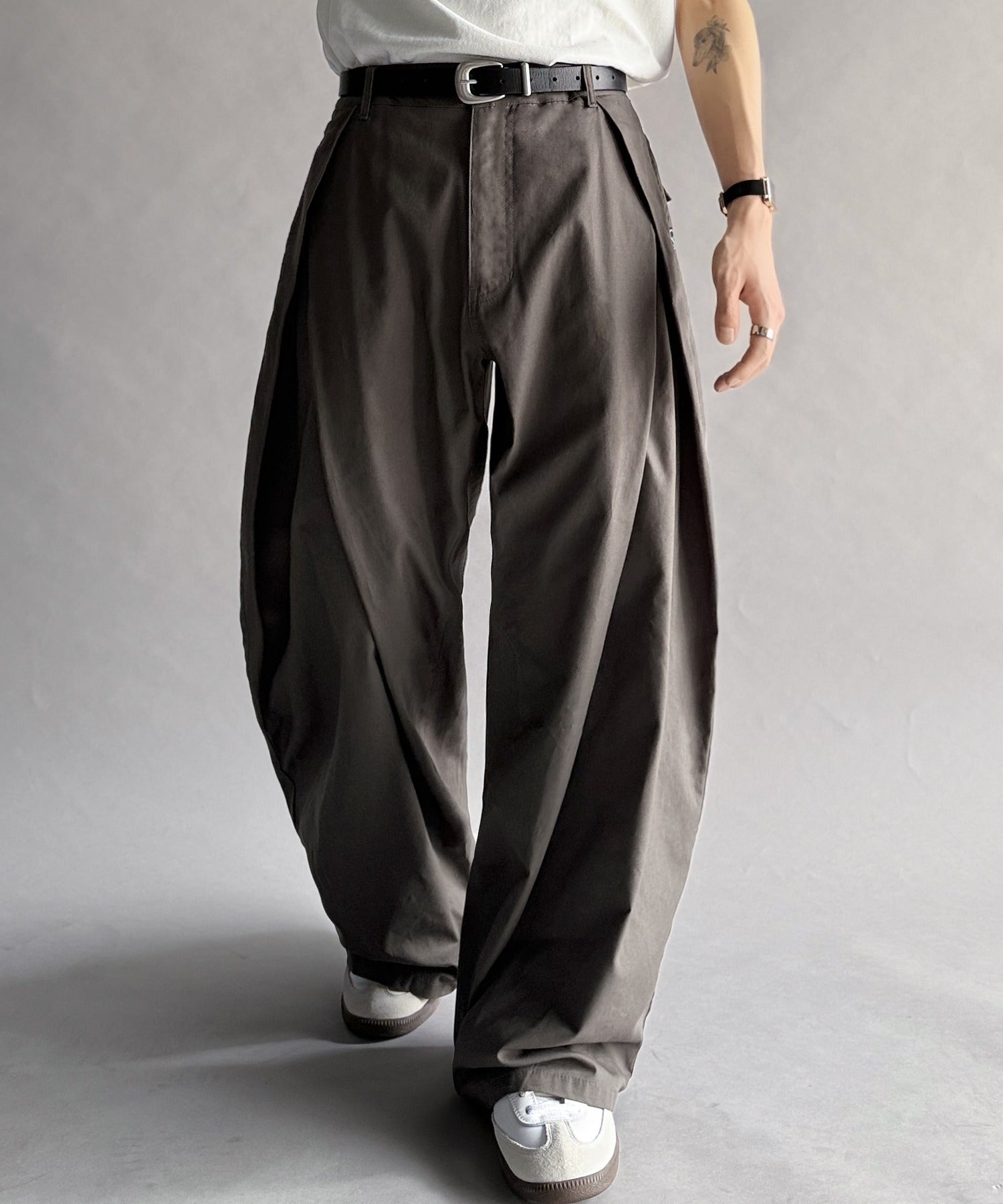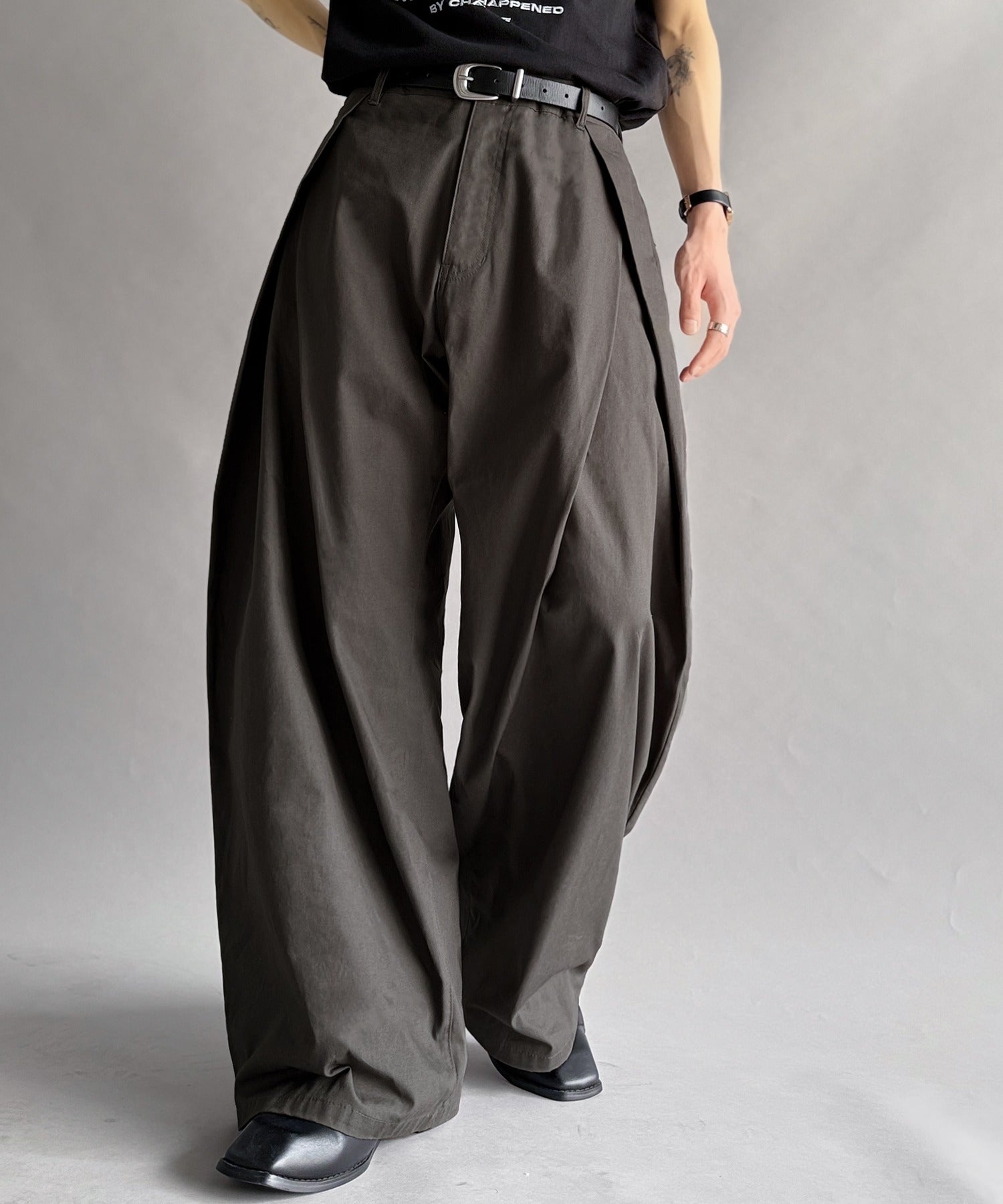 ダブルで施された深めのタックによる美しい立体感のあるワイドスラックスが、