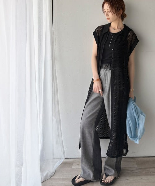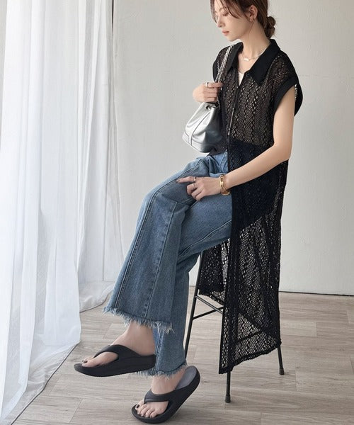 大人のカジュアルを演出するフレンチスリーブロングジレは、春夏にぴったりな一着です。