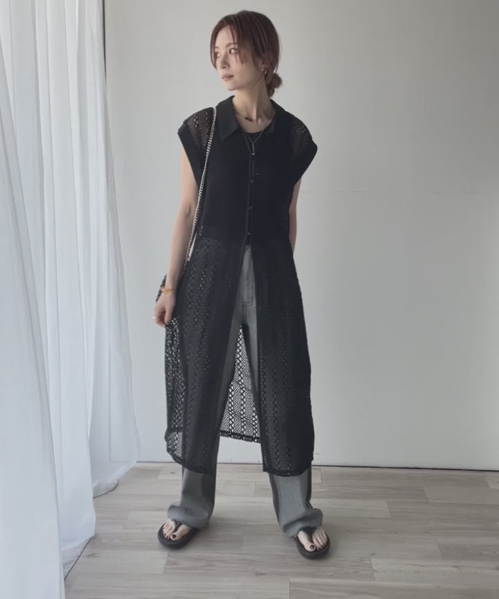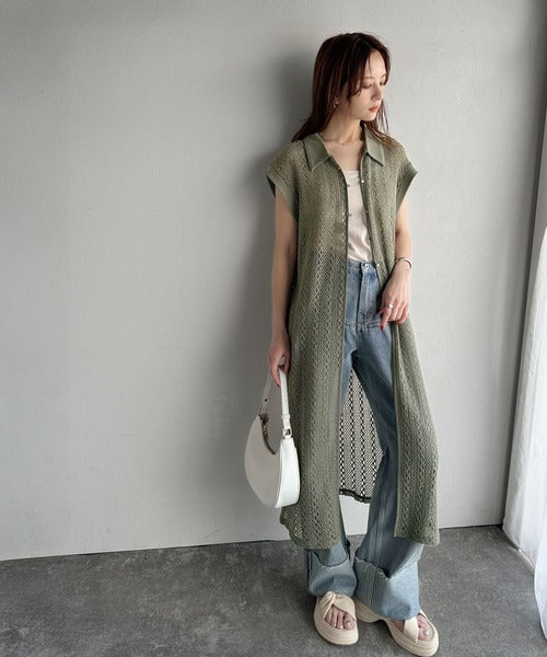 春夏シーズンのコーディネートには軽やかな素材感を活かして、ノースリーブやキャミソールのインナーと合わせるのがおすすめです♪