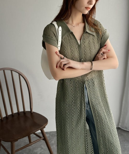 襟付きのクロシェ風レースが華やかさを演出するロングジレ。