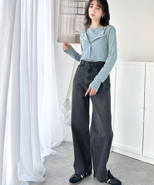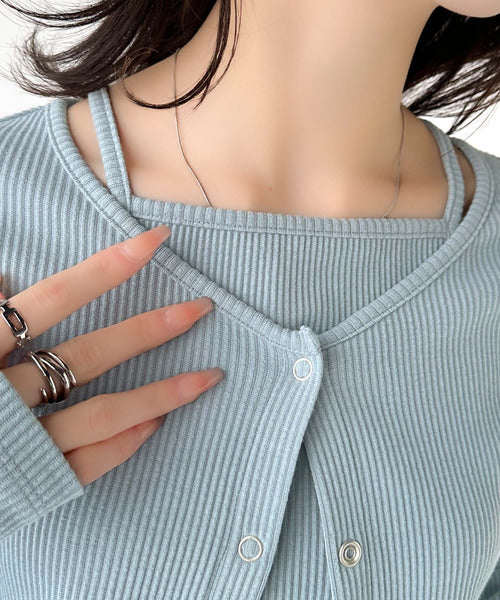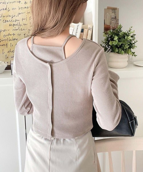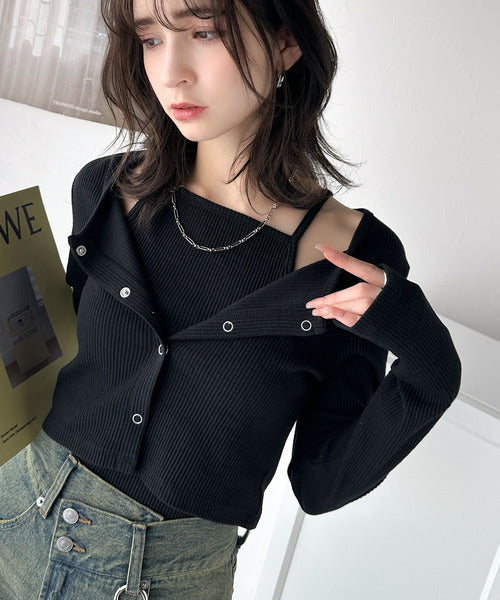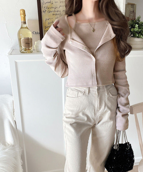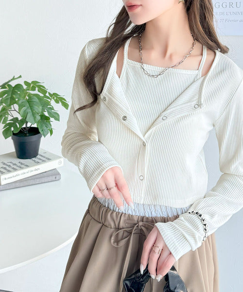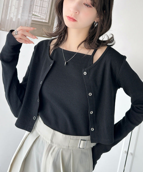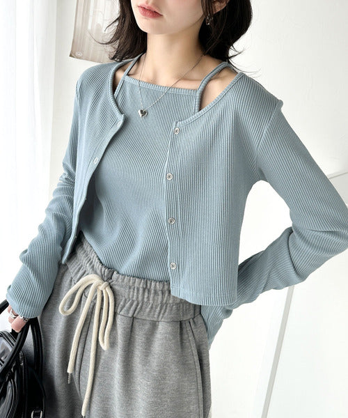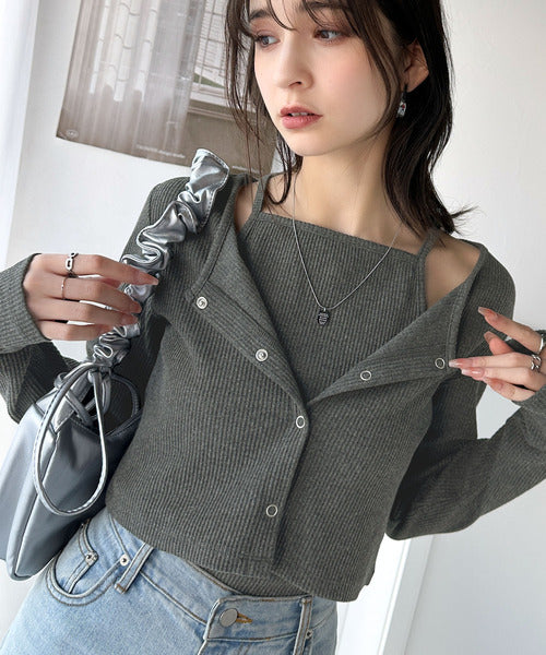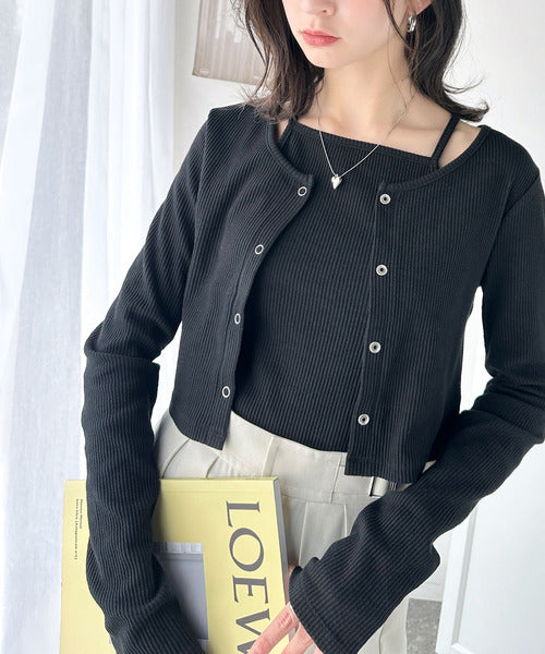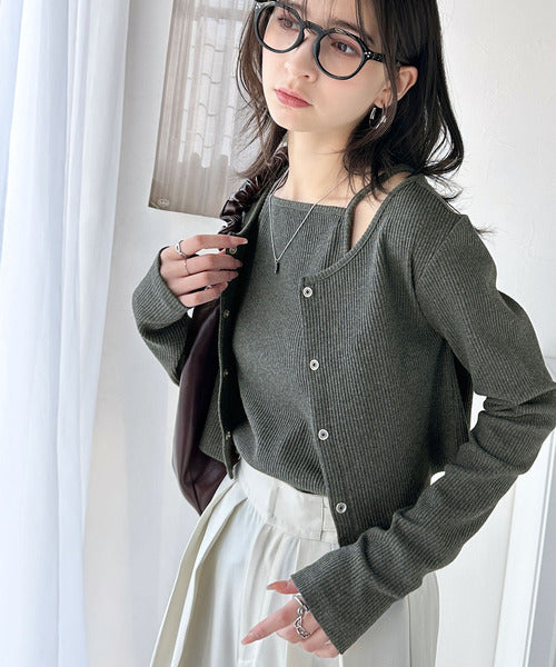 ・コンパクトな丈感のカーディガンにキャミソールが付いた着回し自在なアンサンブル
