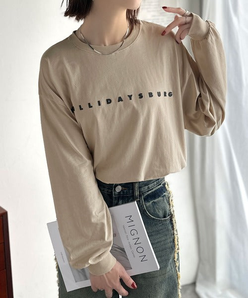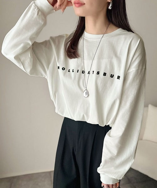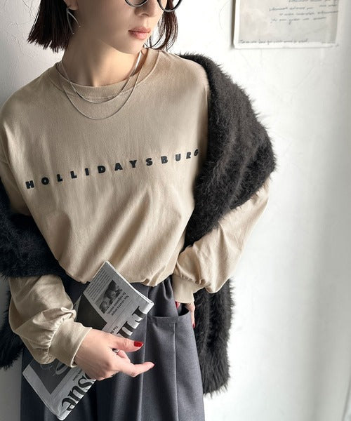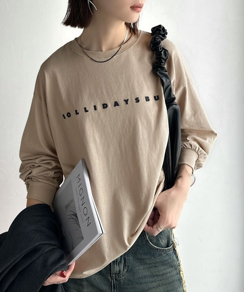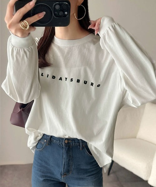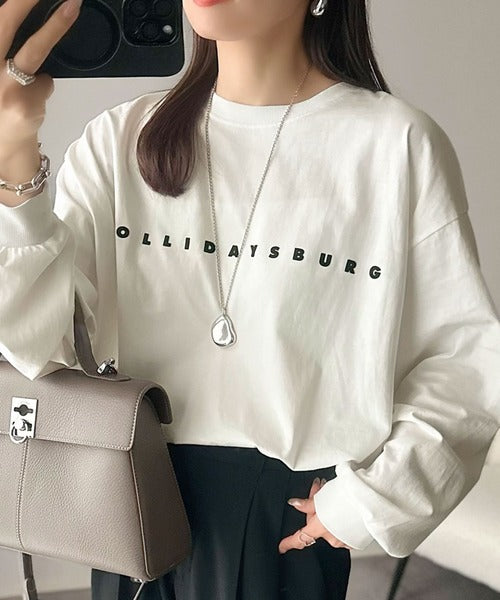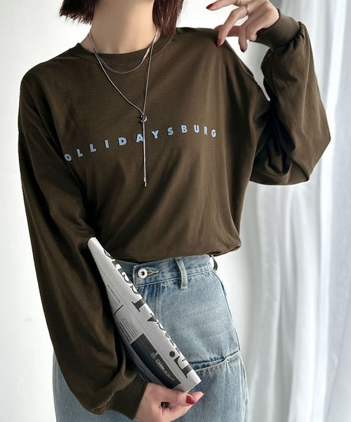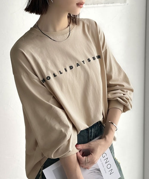 大人の上品カジュアルを楽しむ。ゆったりシルエット 綿100%シルケット風シンプル英字ロゴTシャツ(長袖) ce1330048
