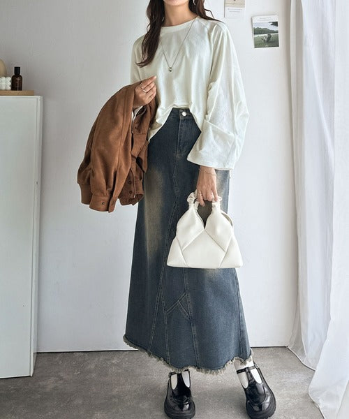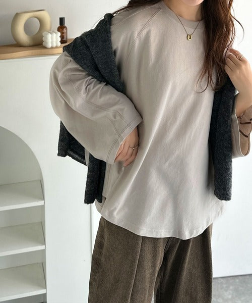 体のラインを拾いにくい、ゆったりシルエットのカットソー。