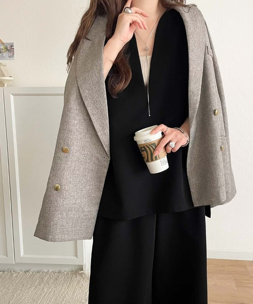 中にブラウスをレイヤードしてセットアップパンツと合わせれば、