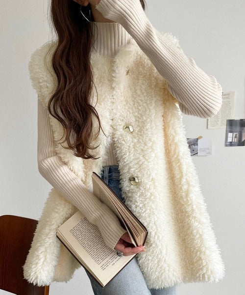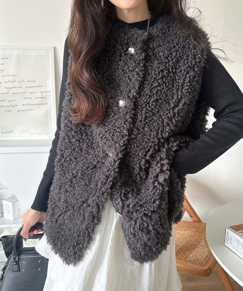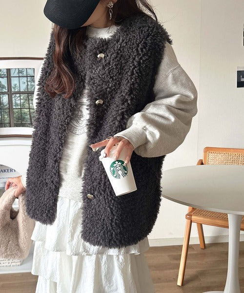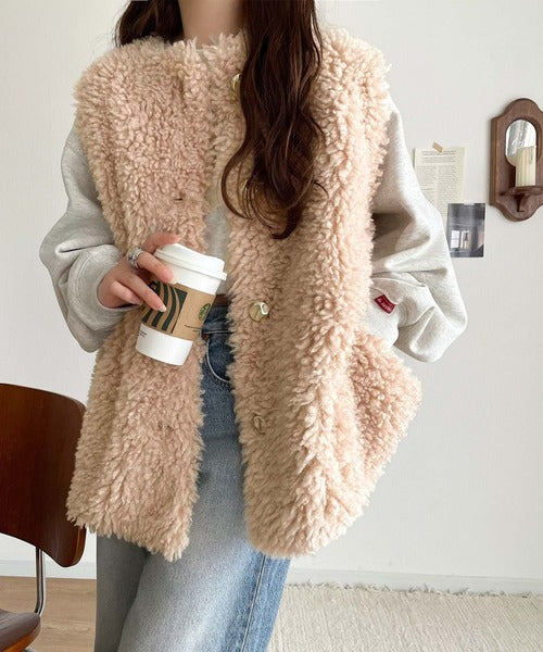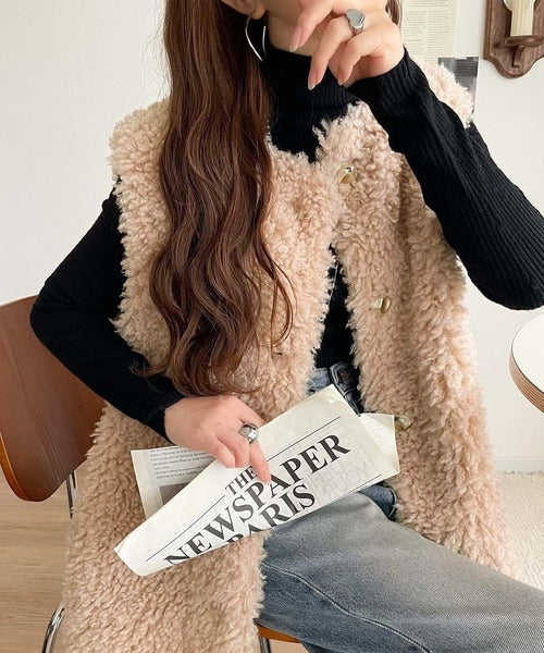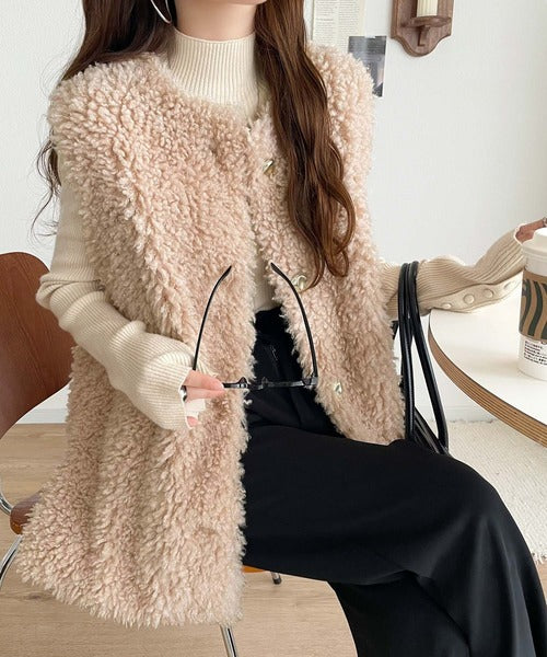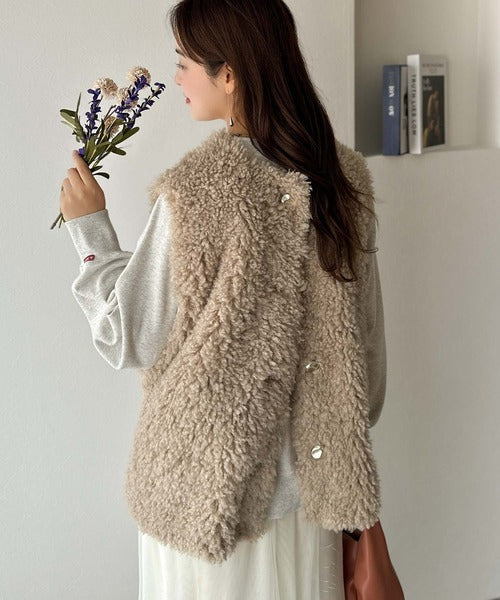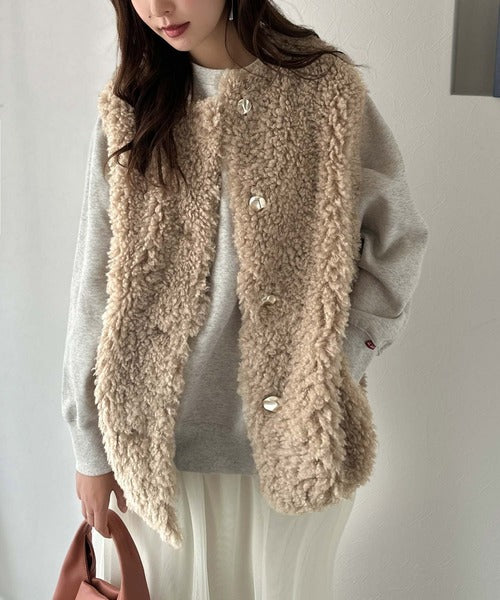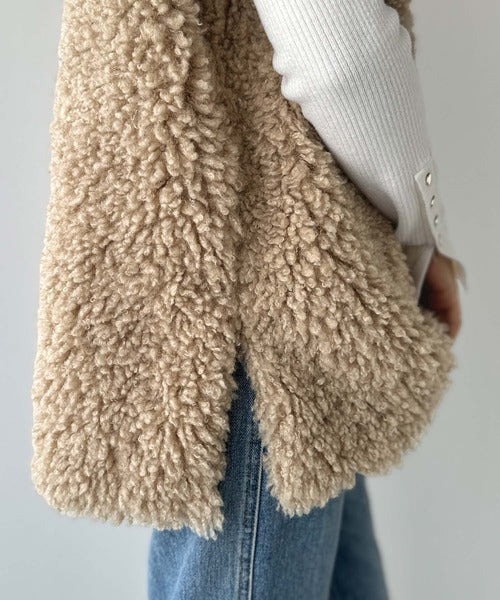 ふわふわのプードルボア素材で仕立てた、見た目も暖かさも文句なしの2wayベスト。