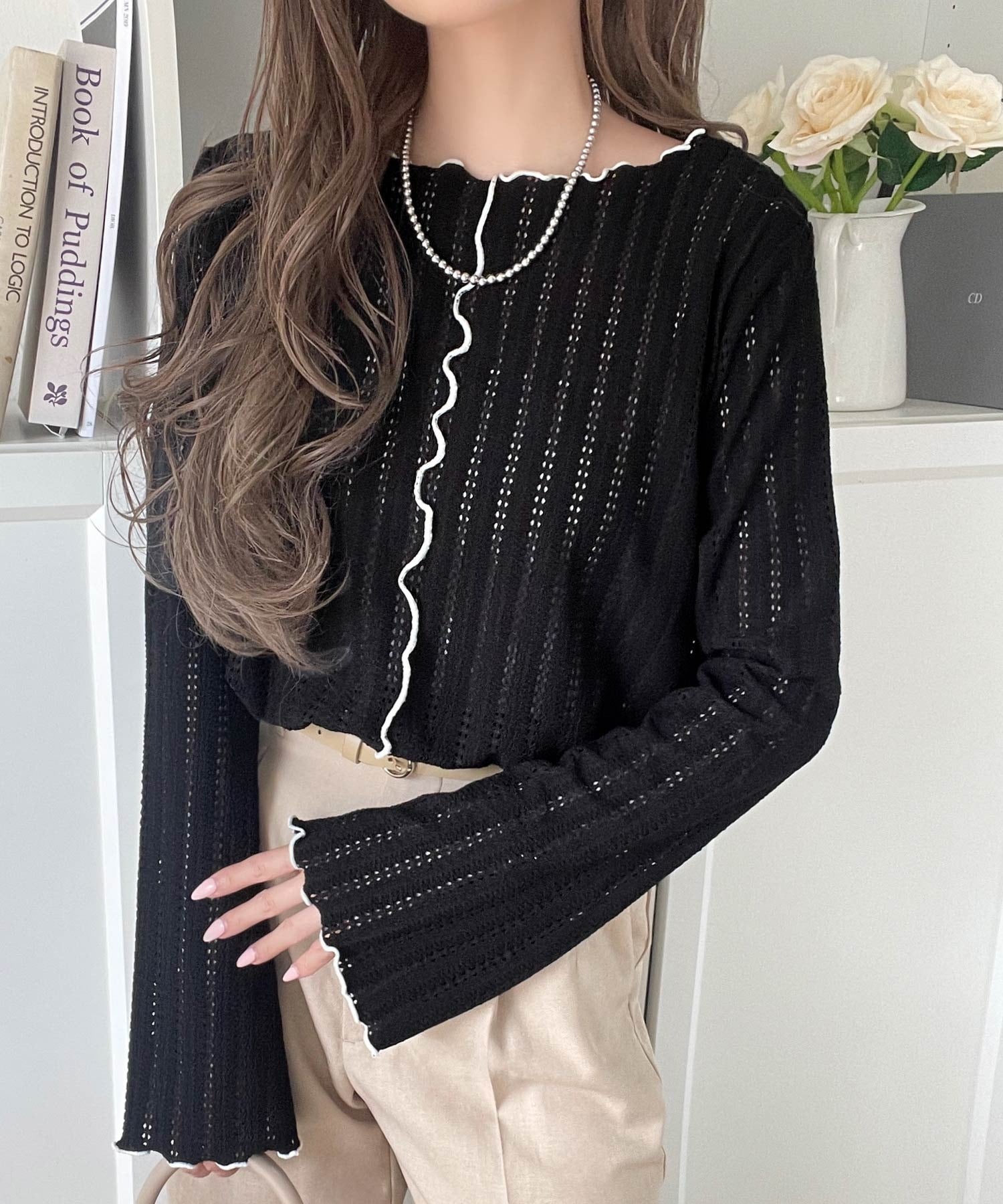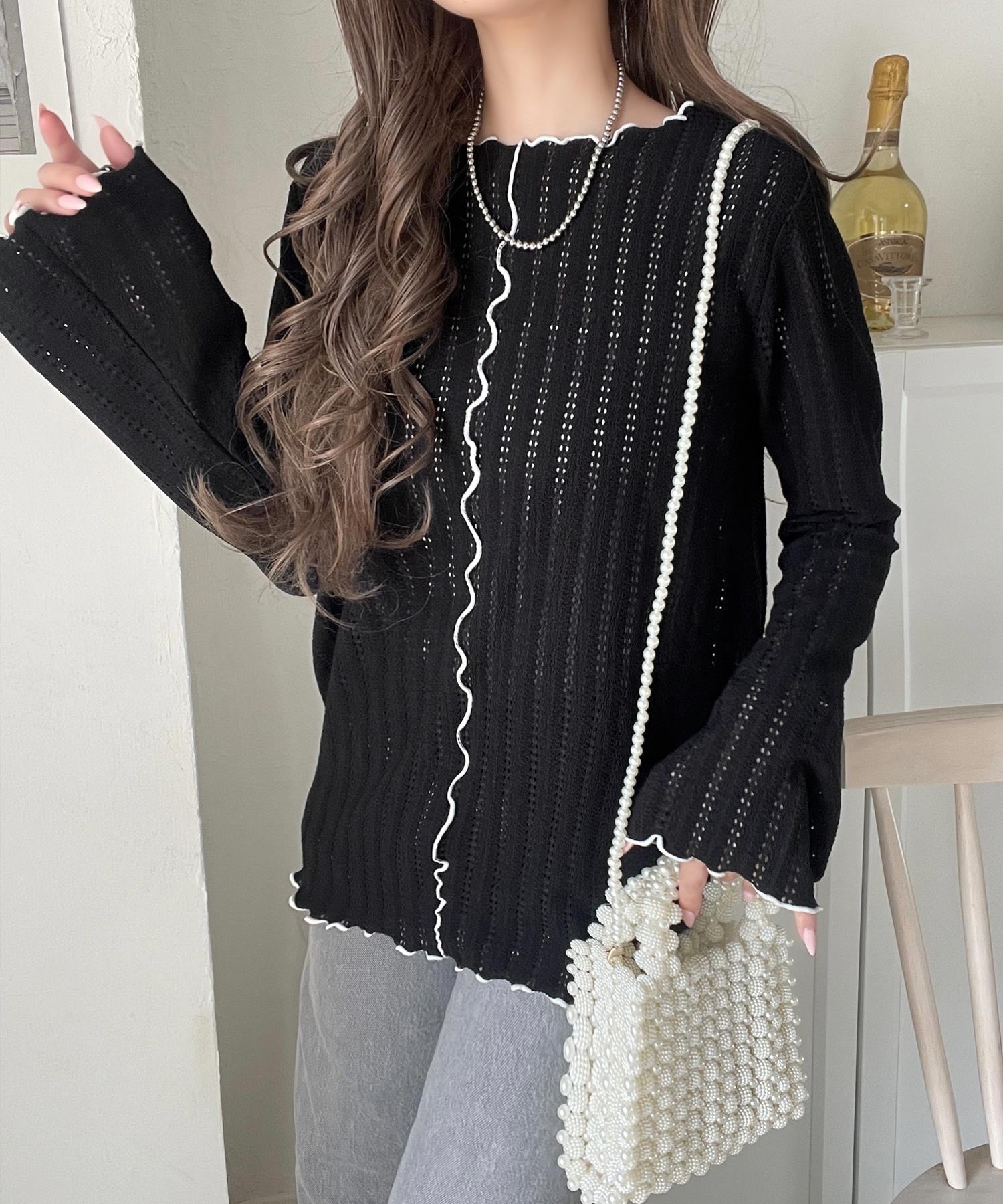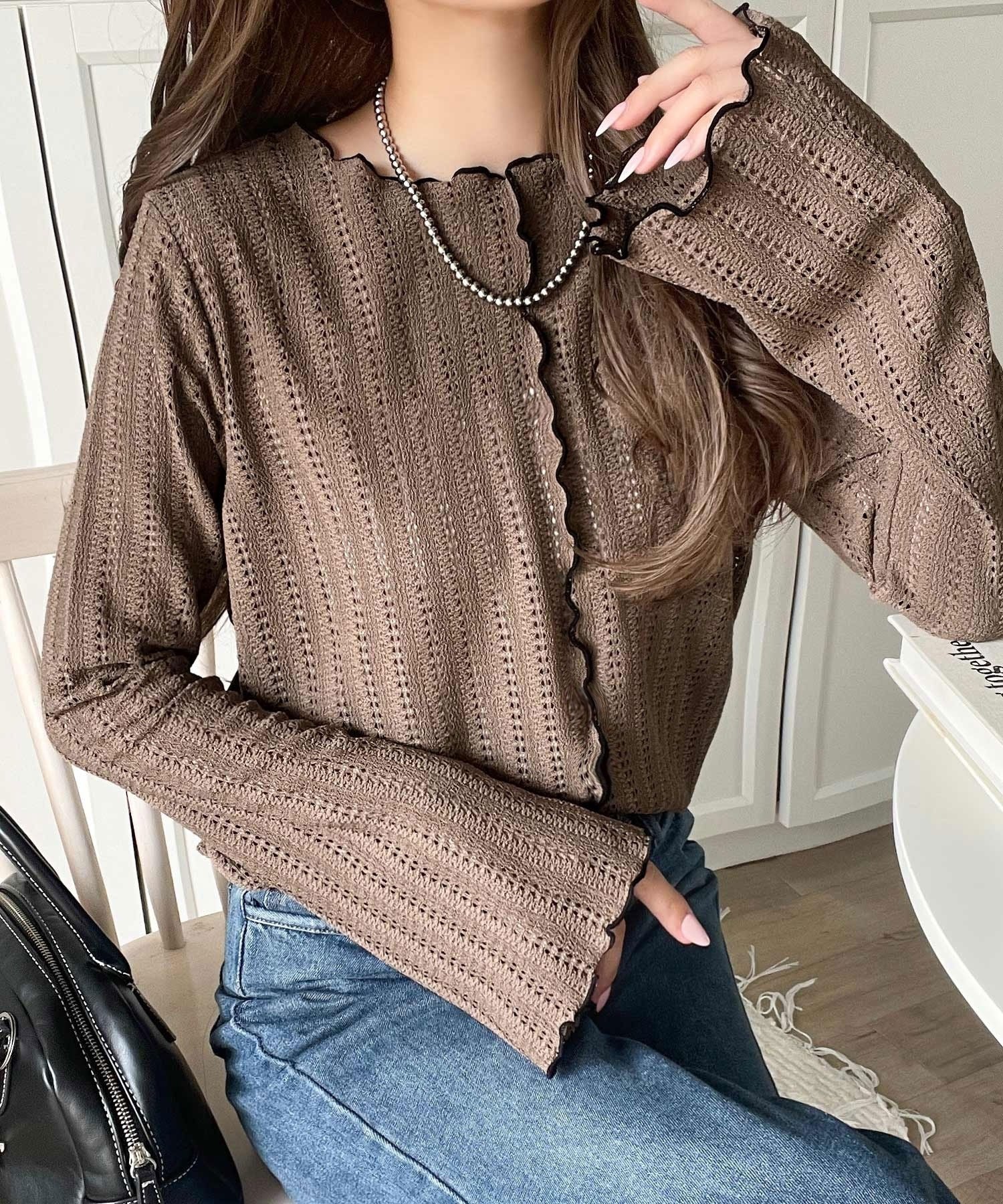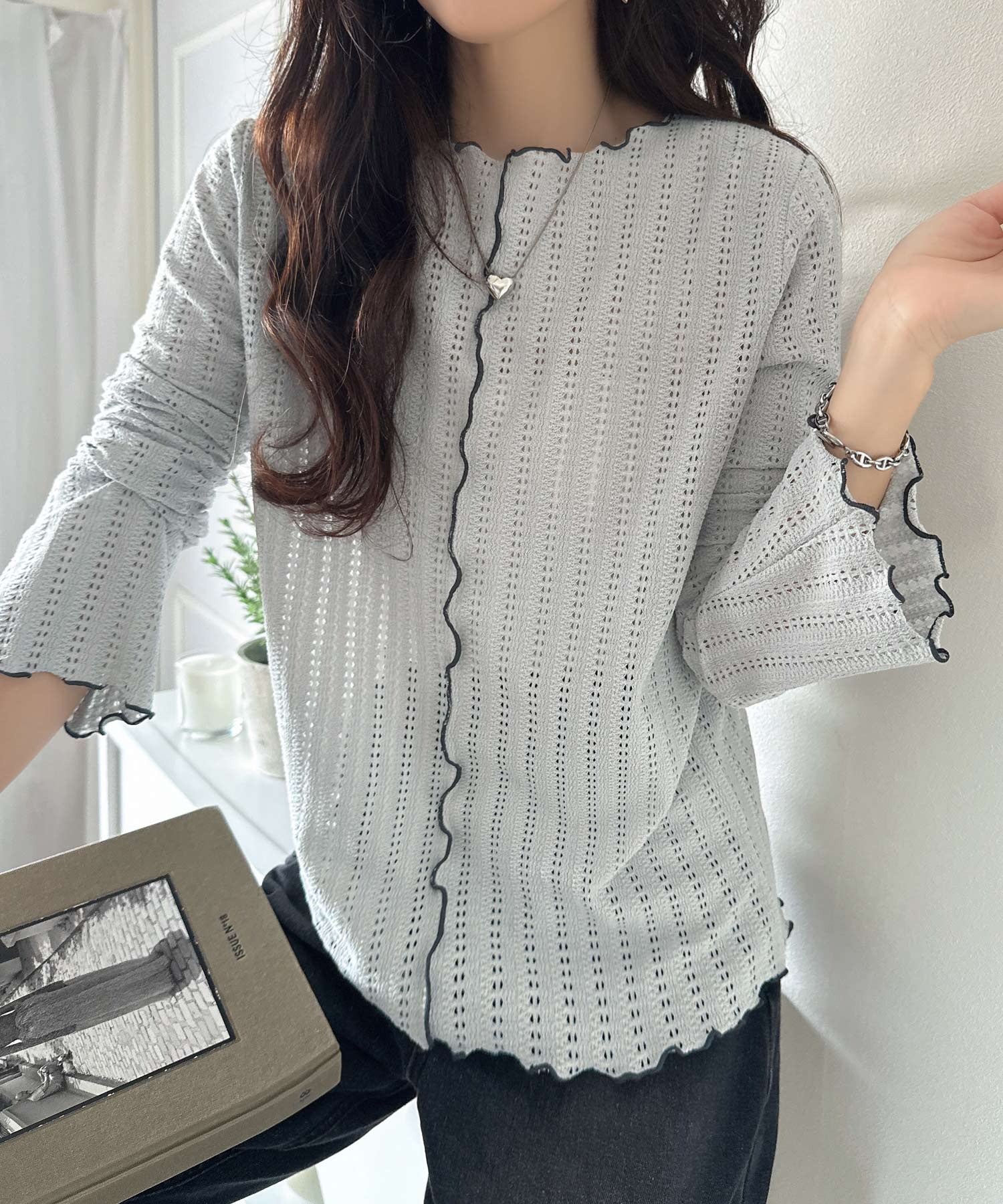 ほんのり色っぽ。透かし編みセンターメロウフレアスリーブトップスカットソー(長袖) ce1010485