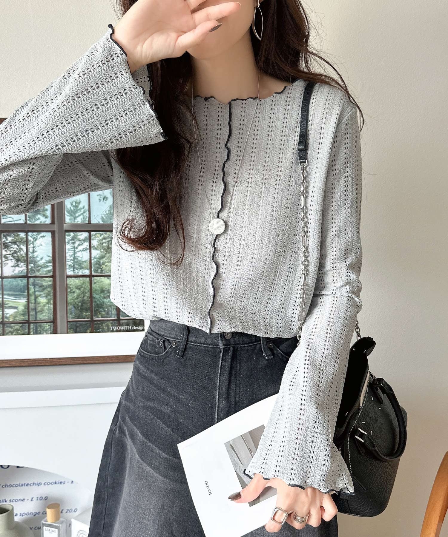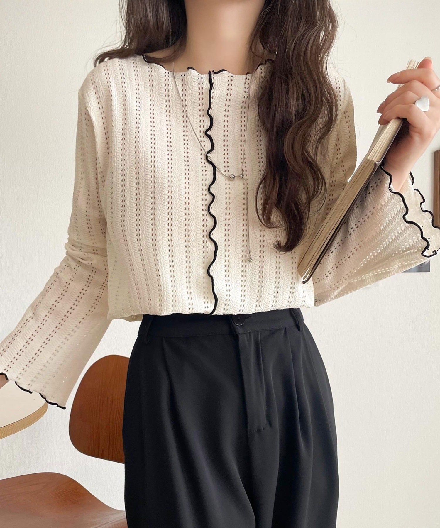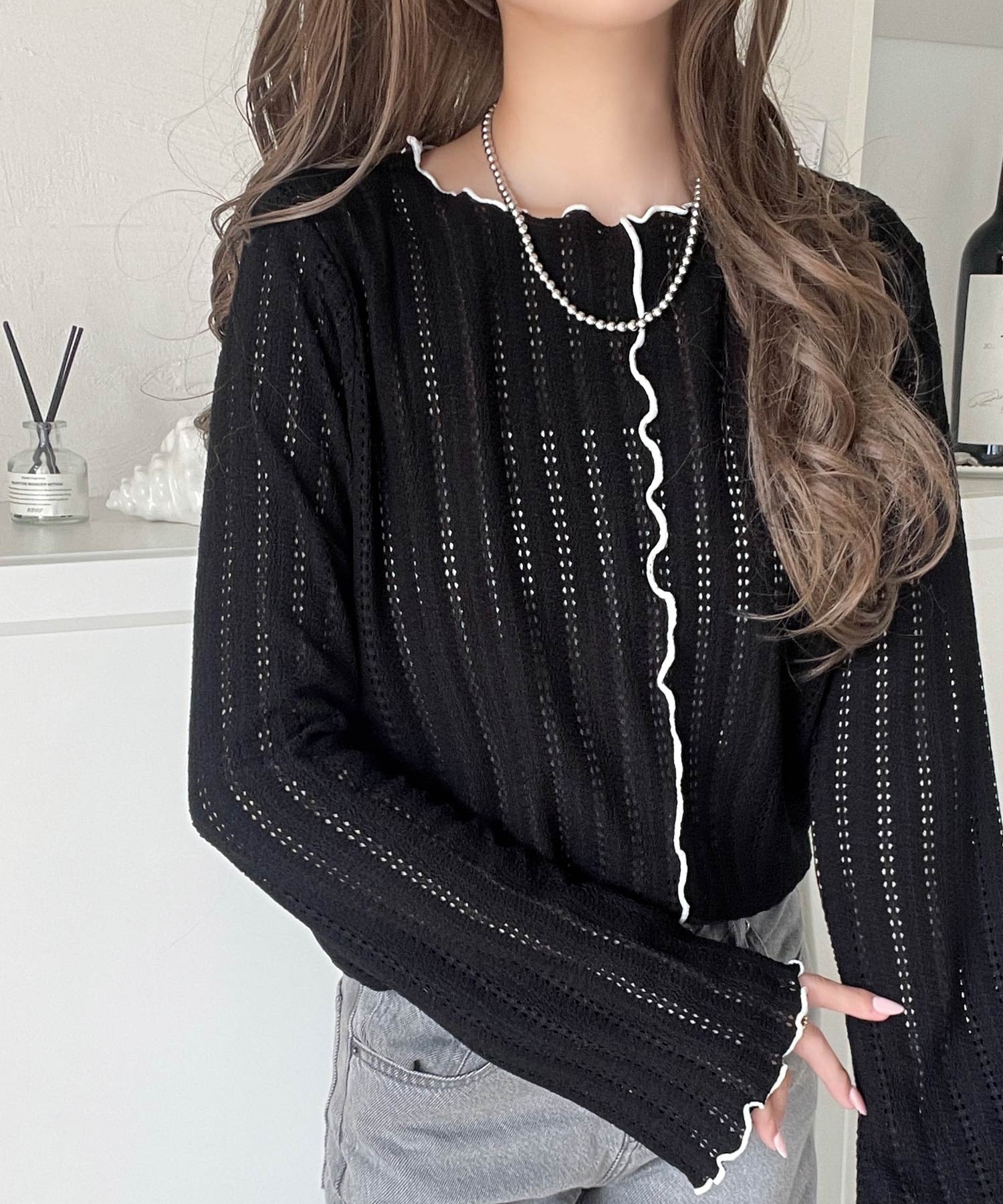 ほんのり色っぽ。透かし編みセンターメロウフレアスリーブトップスカットソー(長袖) ce1010485