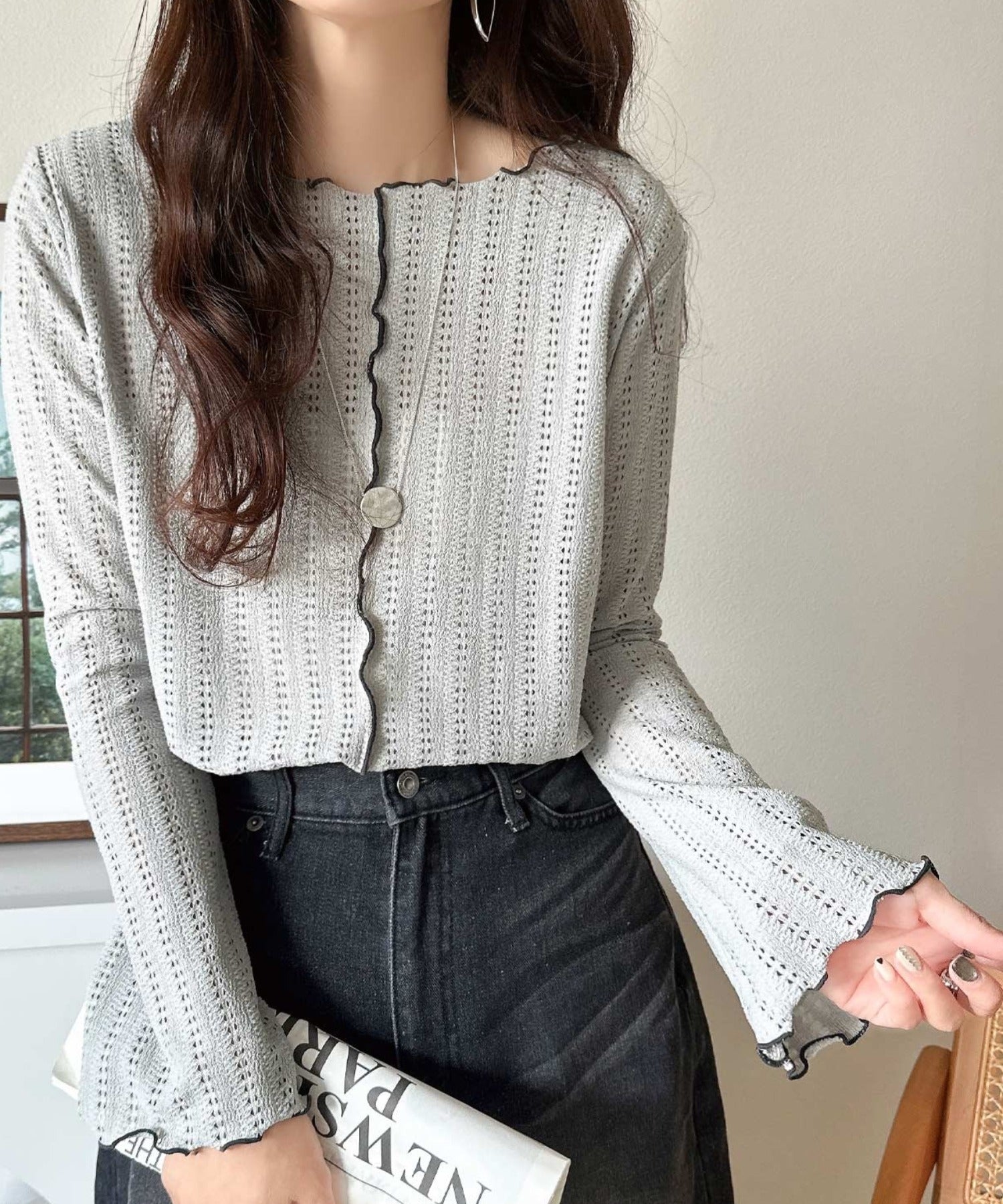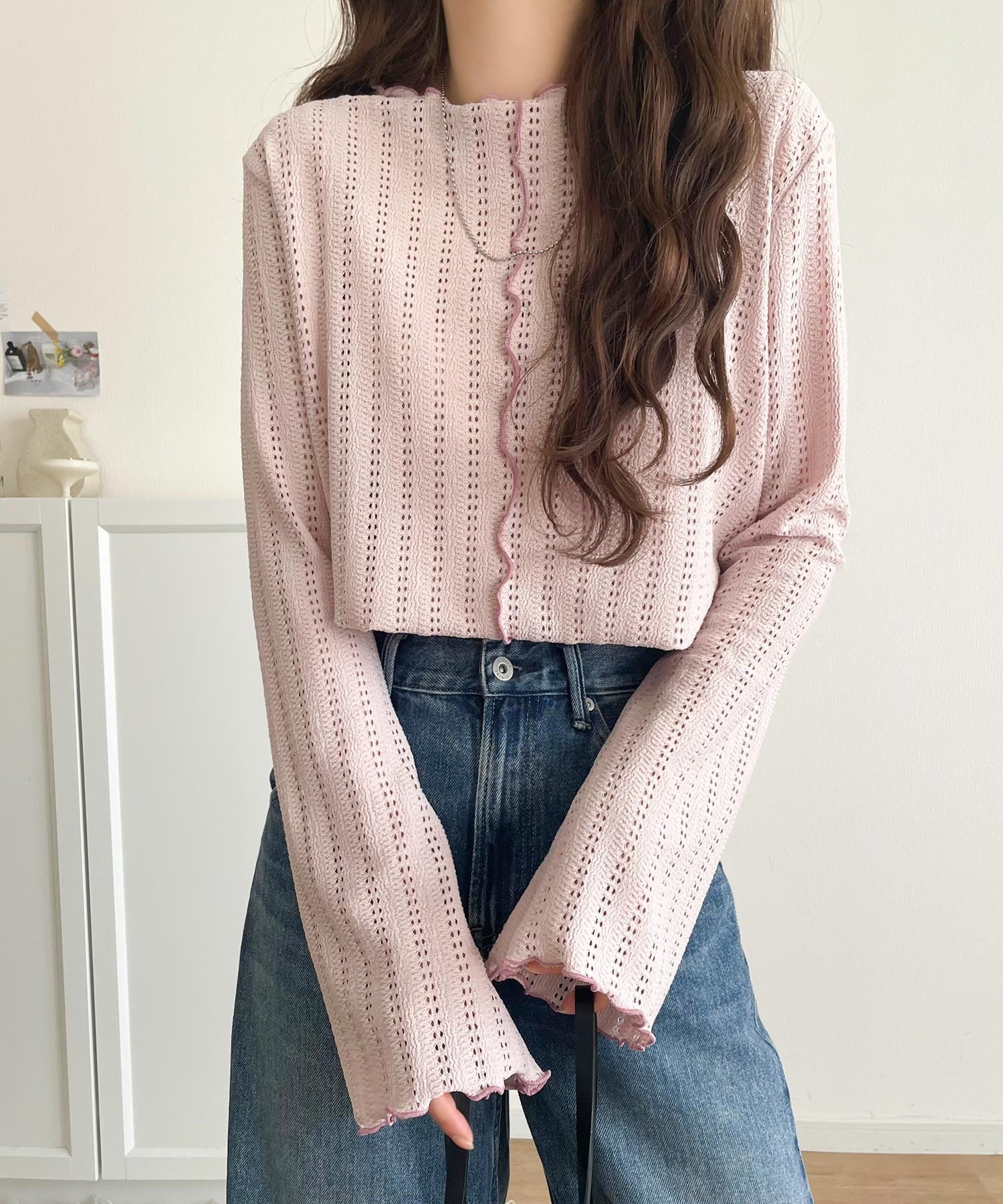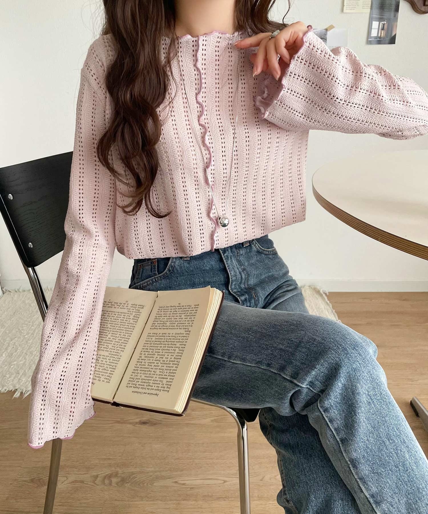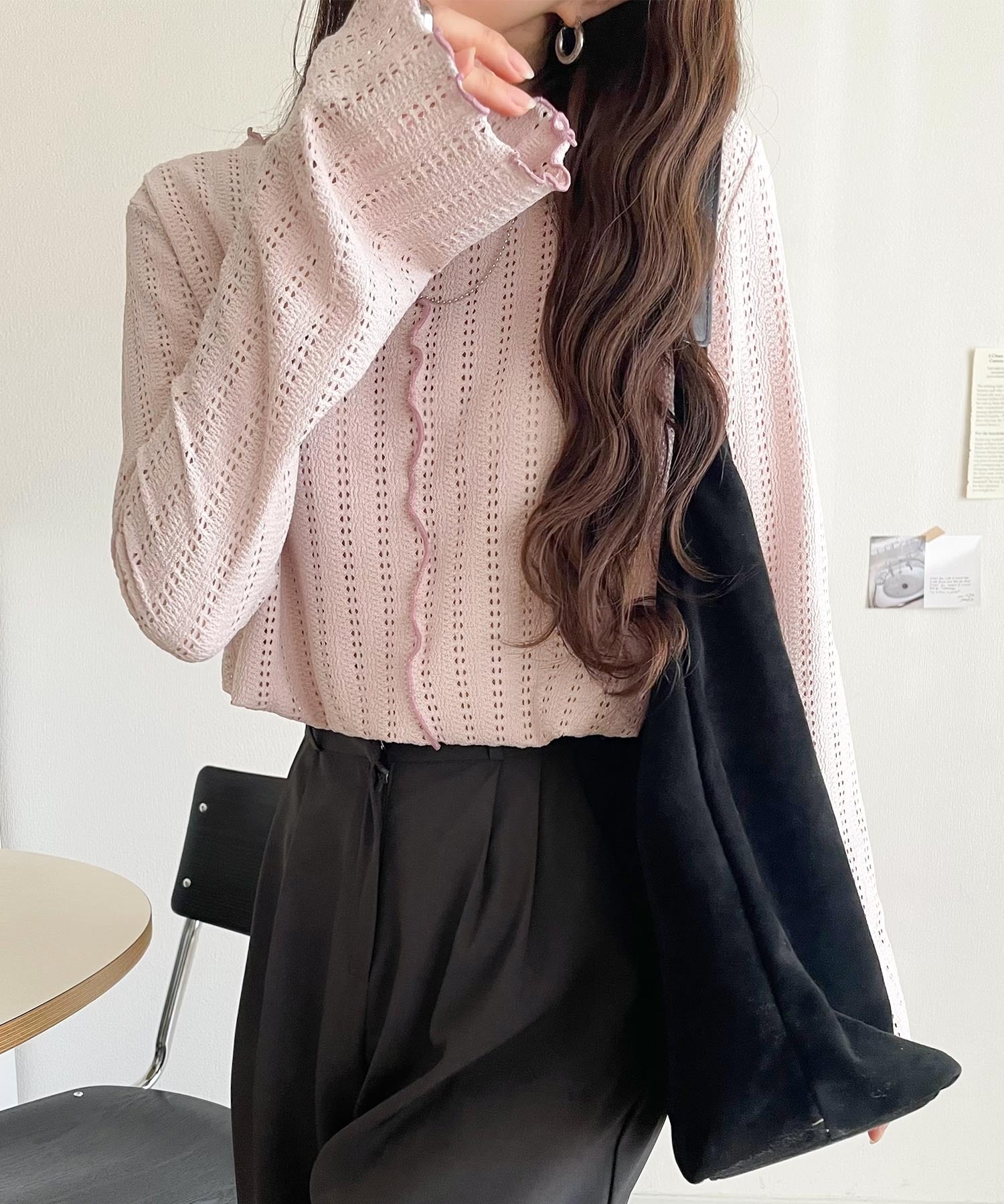 ほんのり色っぽ。透かし編みセンターメロウフレアスリーブトップスカットソー(長袖) ce1010485