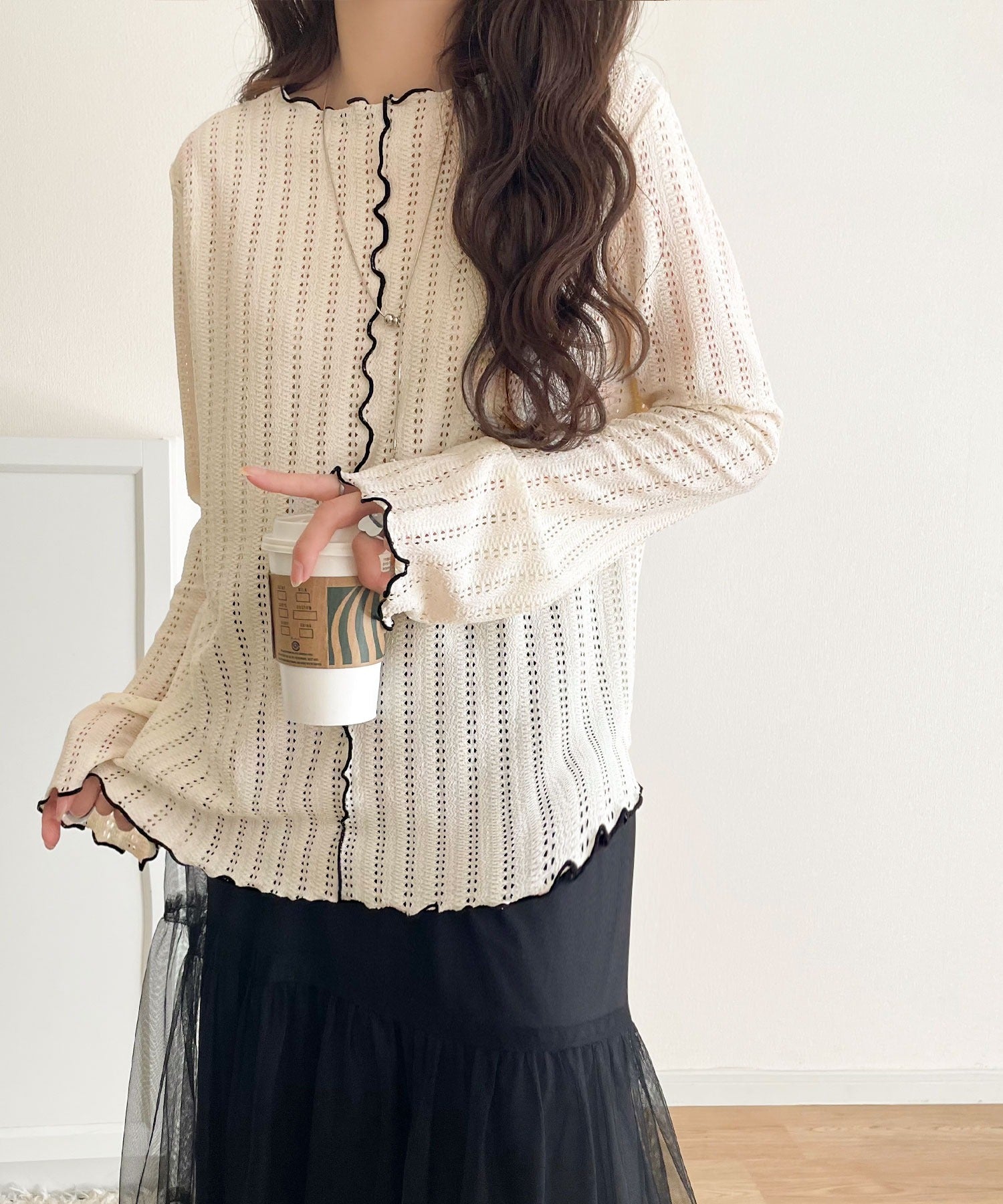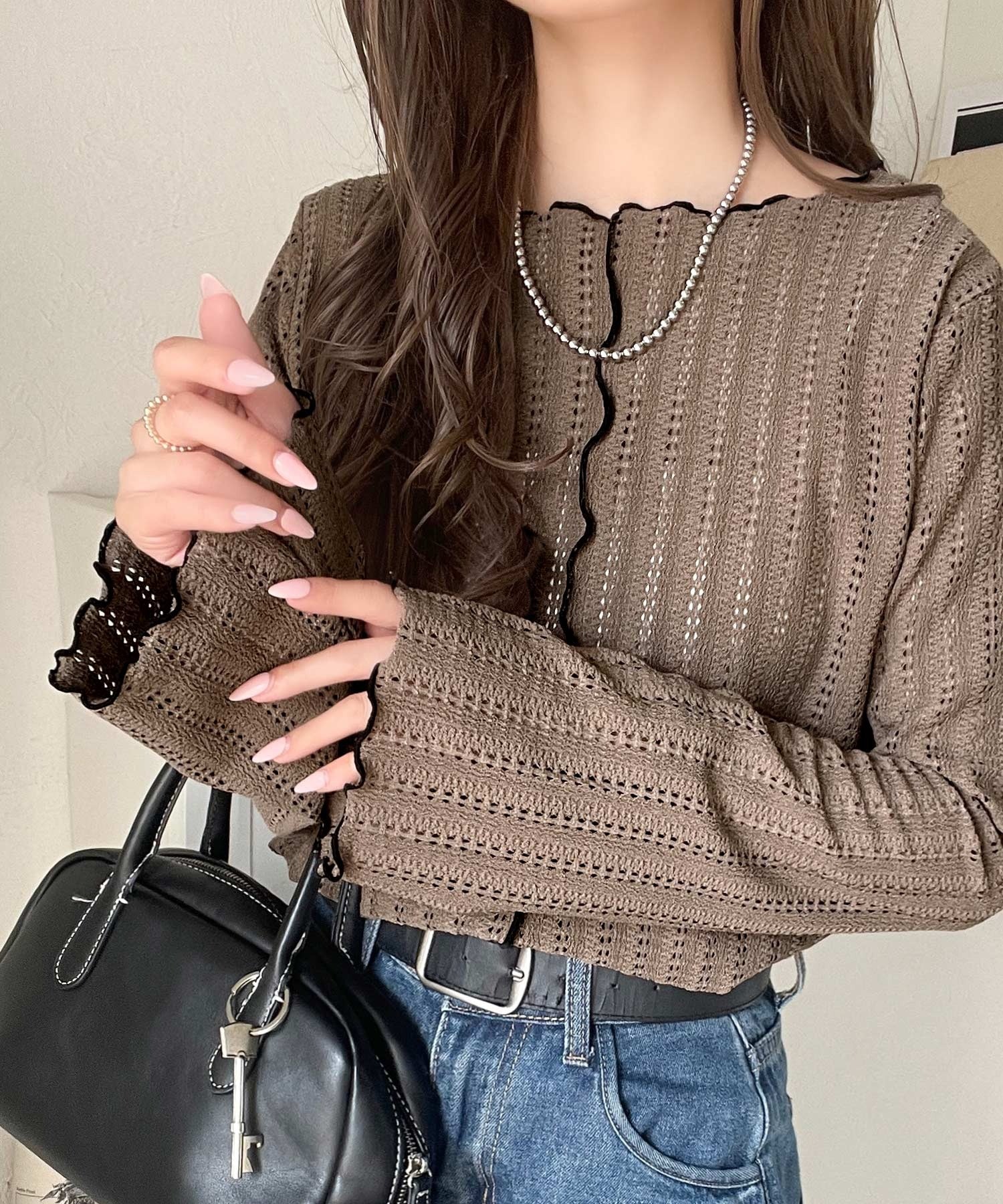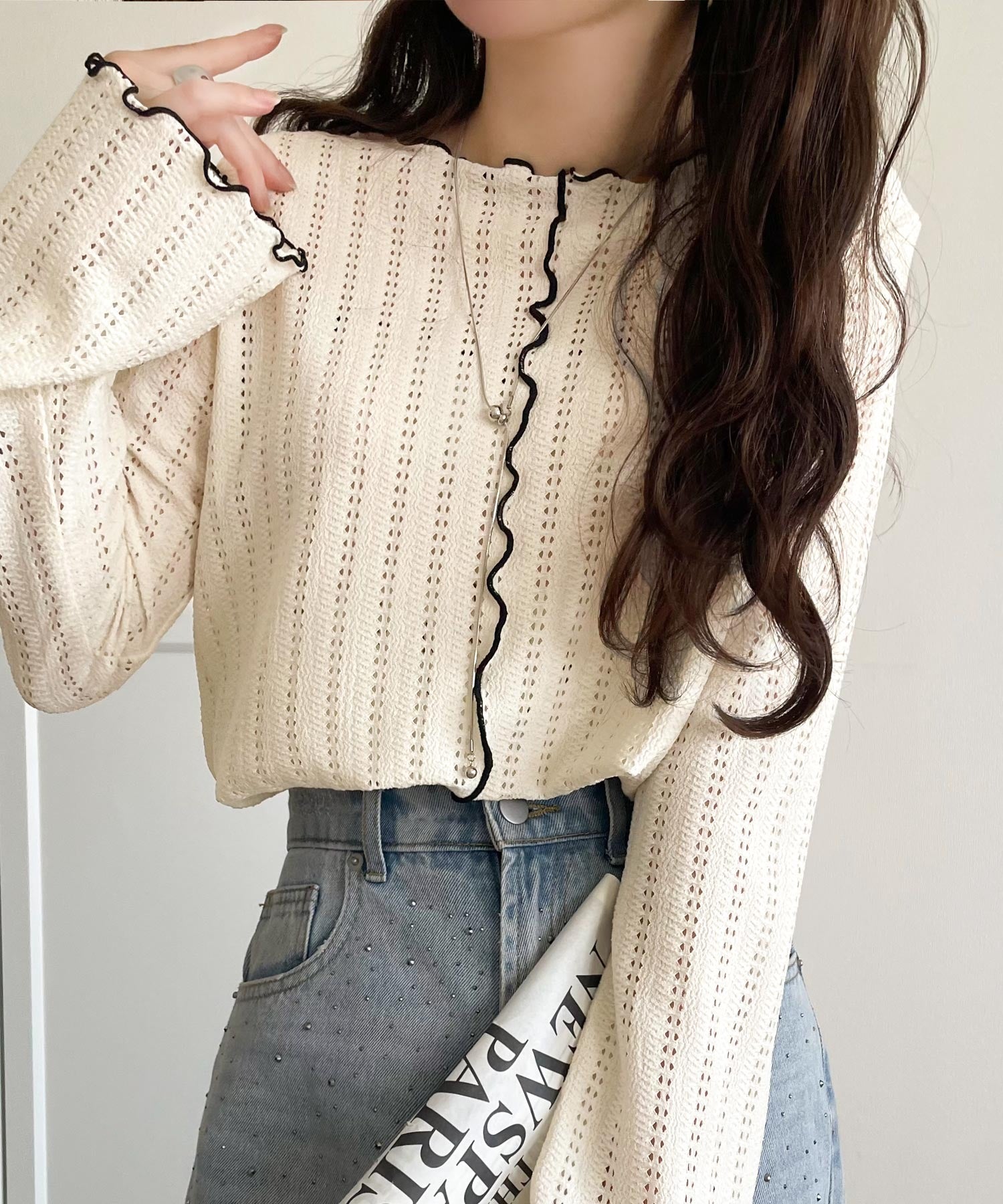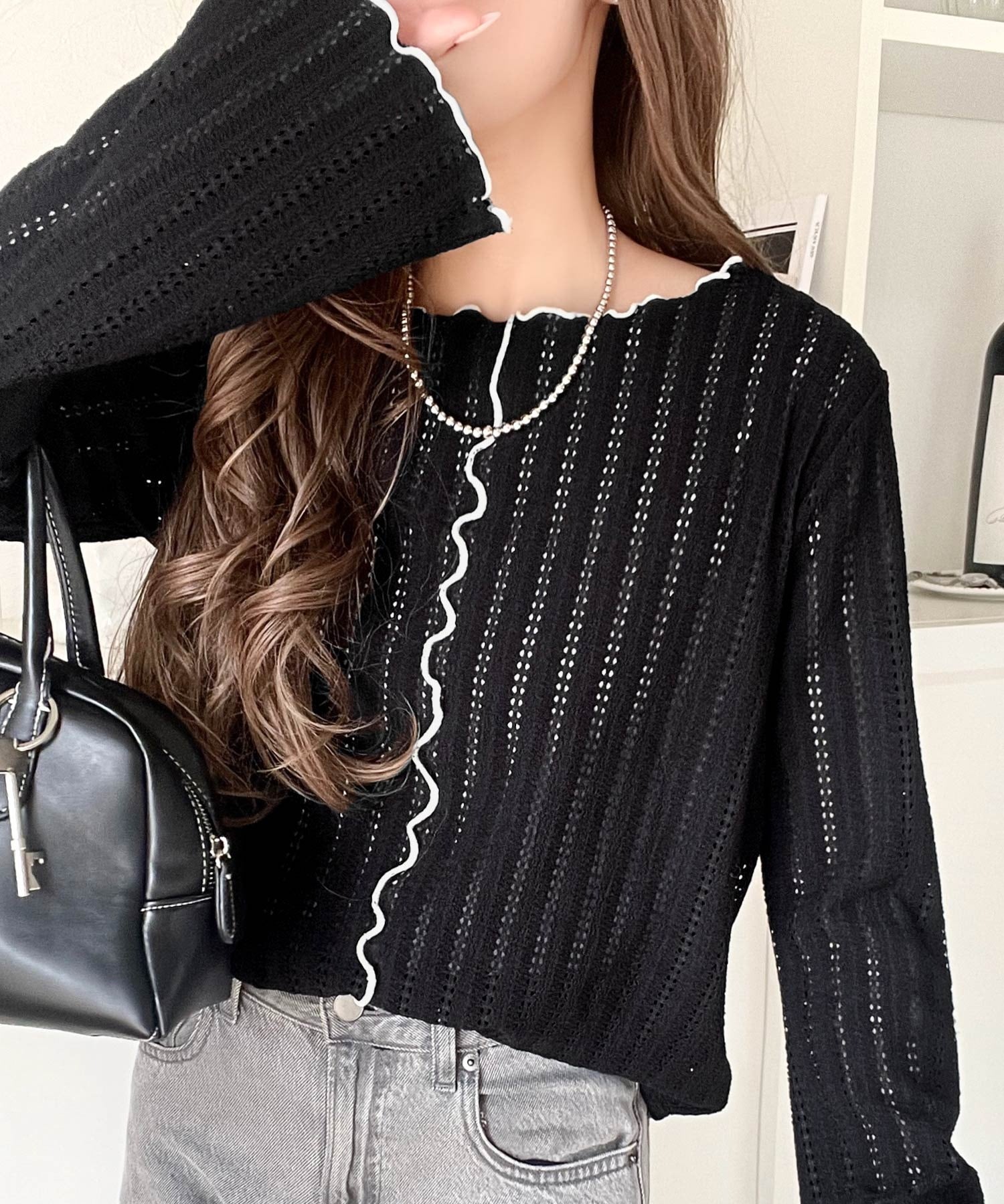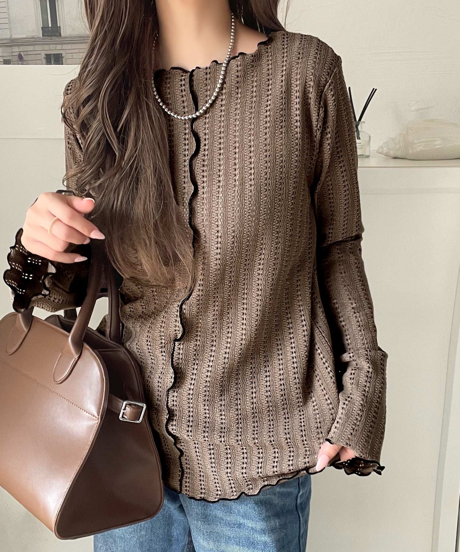 メロウフリルのネックと袖コンシャスデザインが存在感のある1枚に。