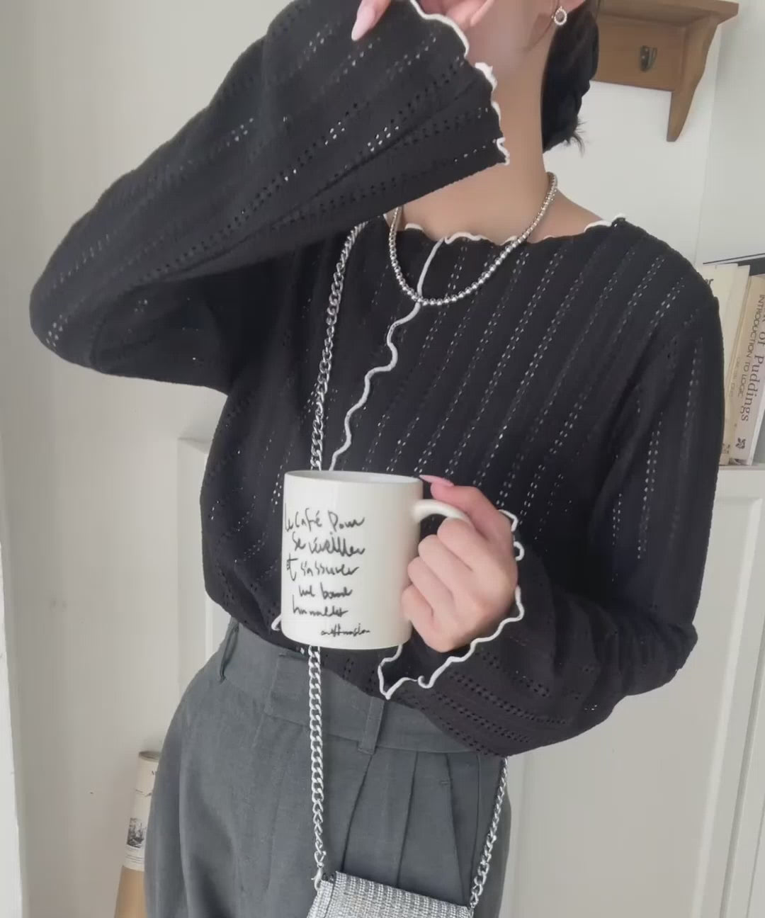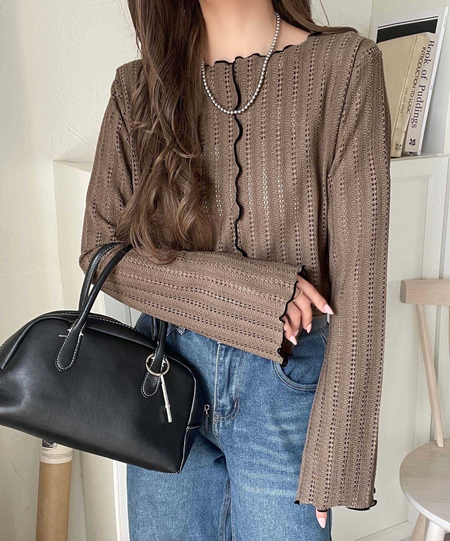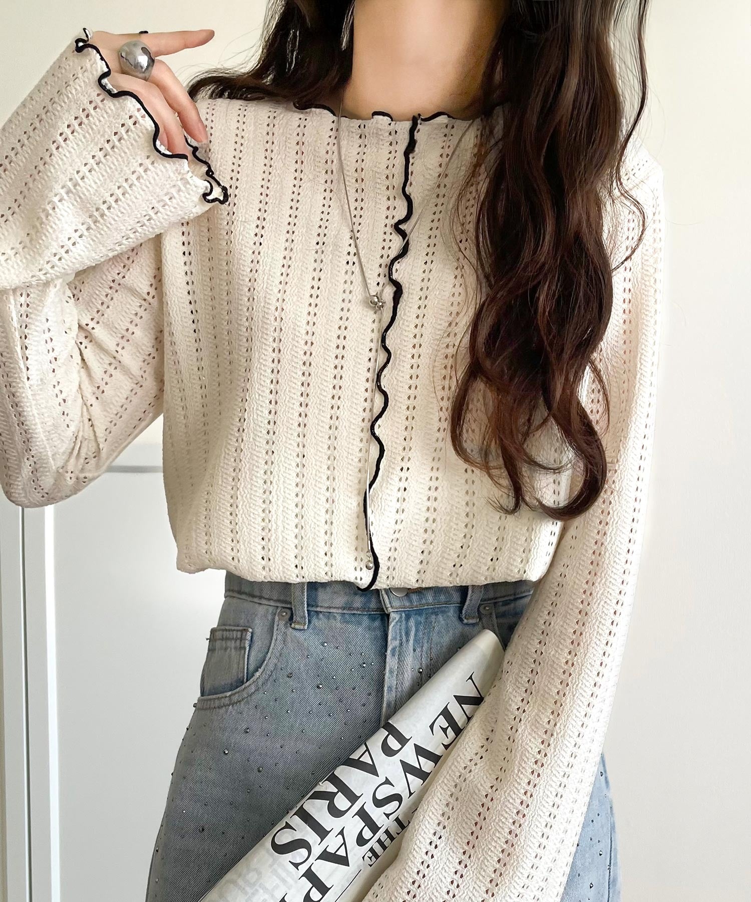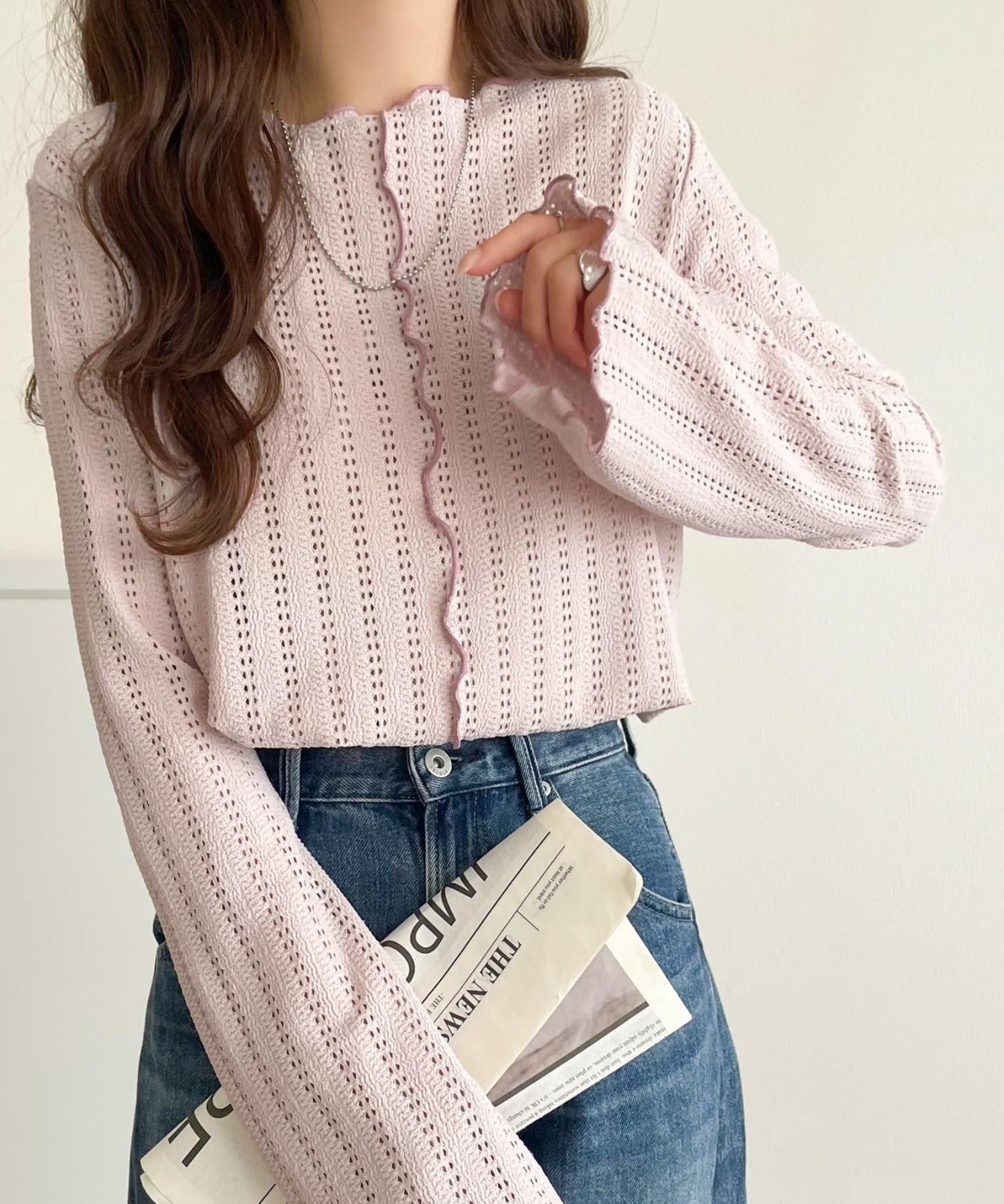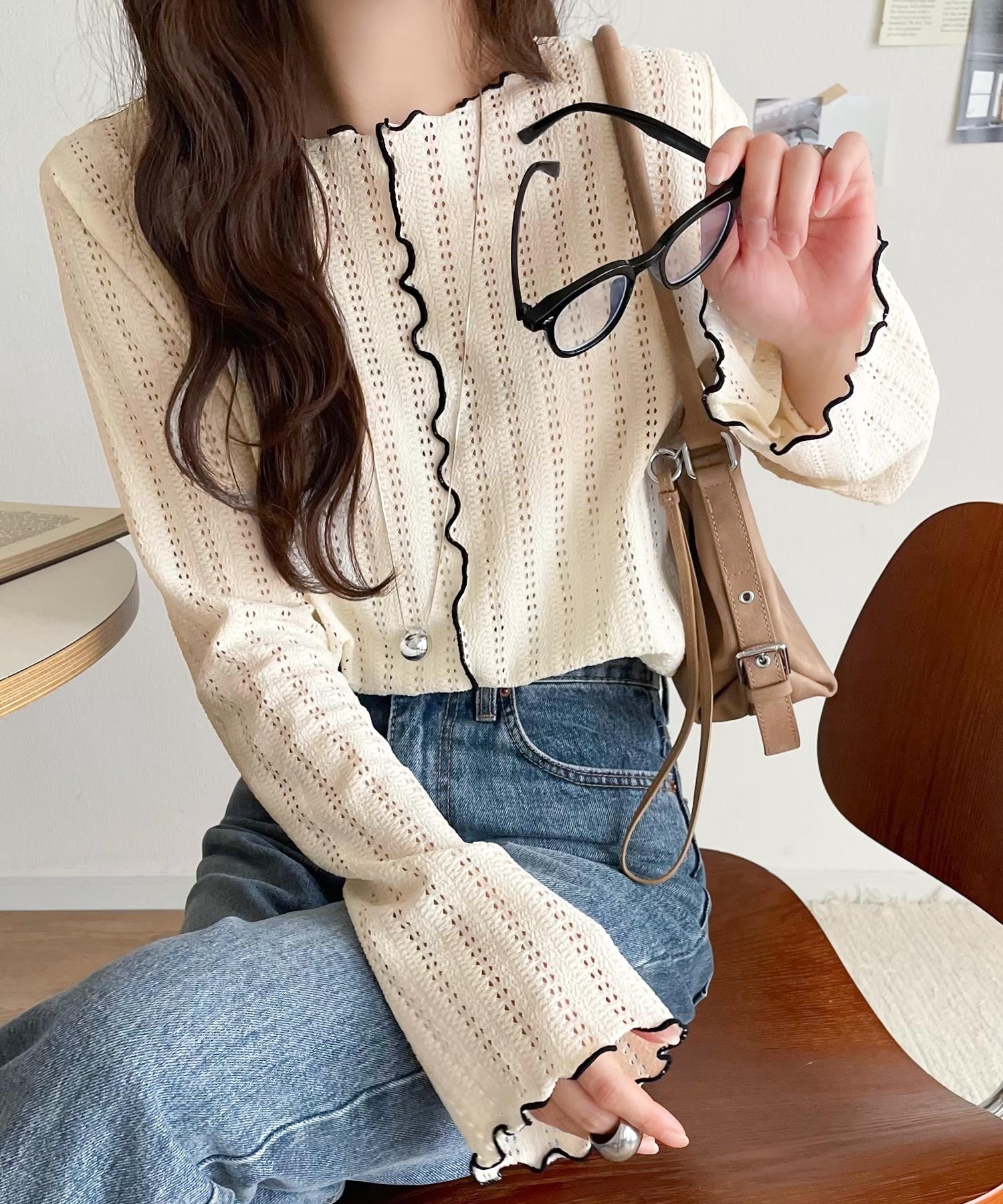 メロウフリルのネックと袖コンシャスデザインが存在感のある1枚に。