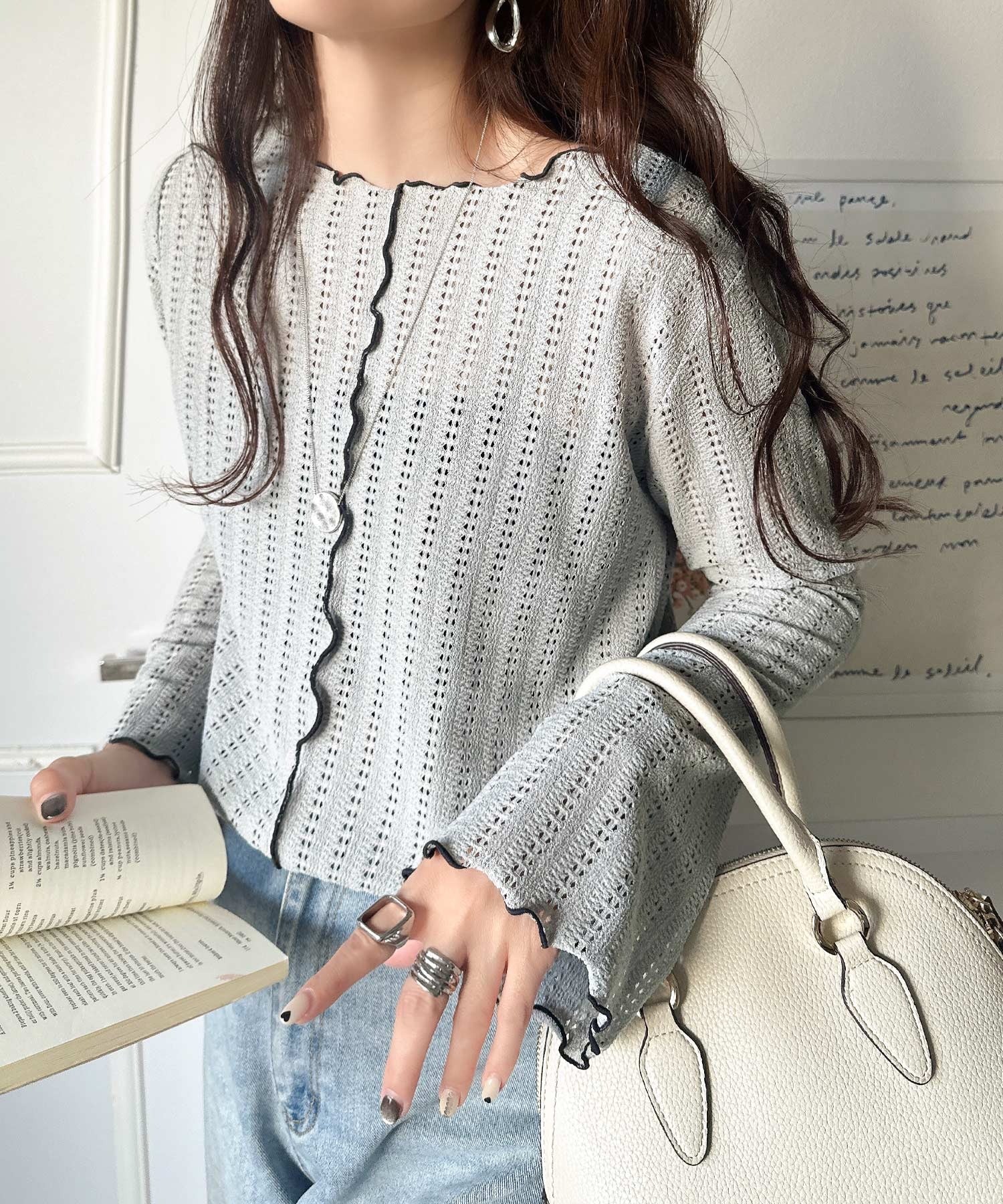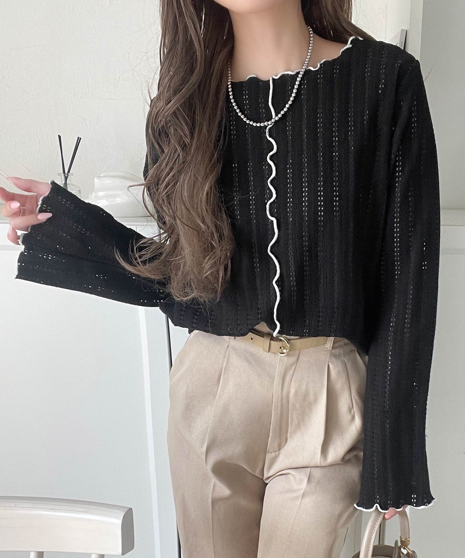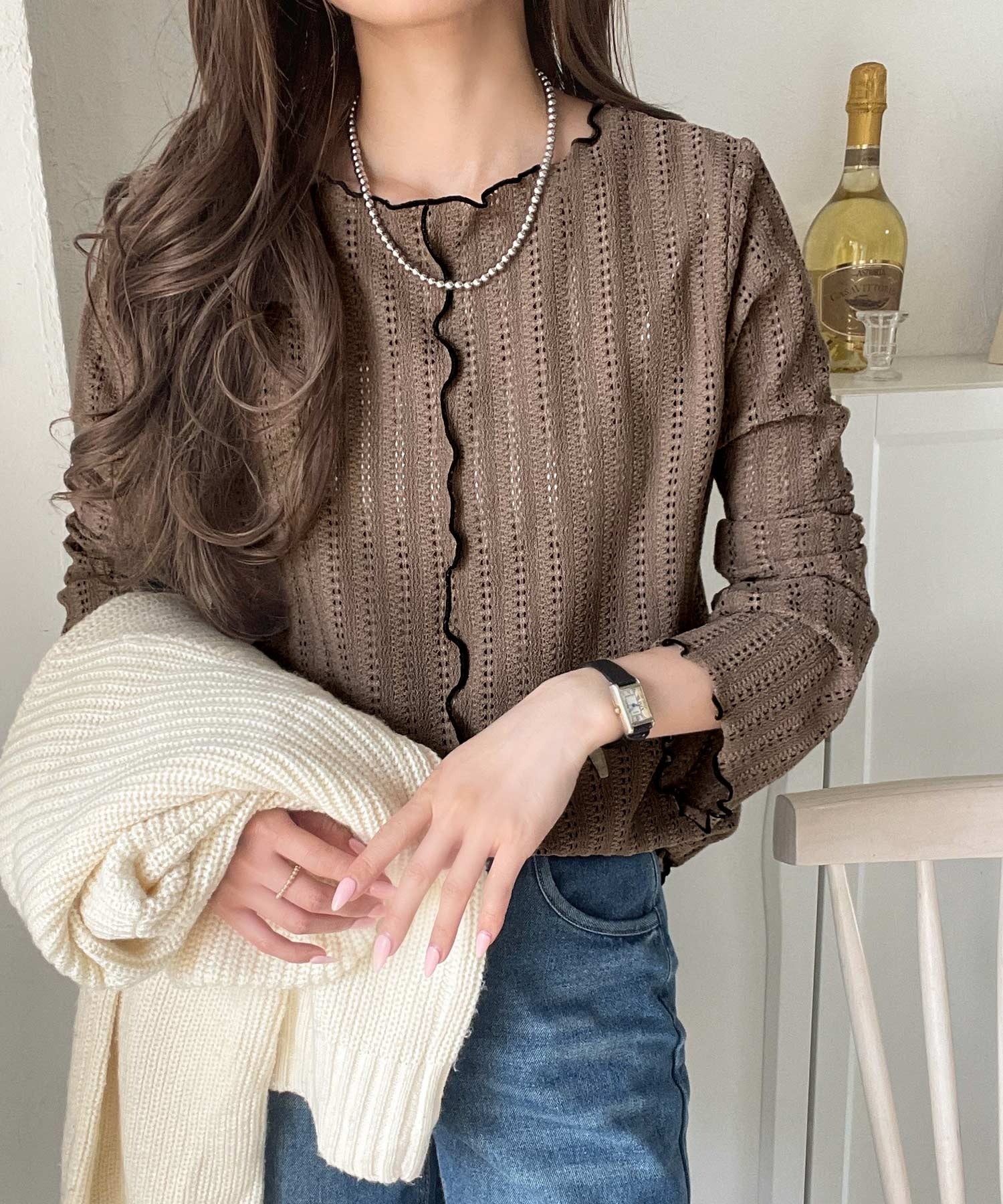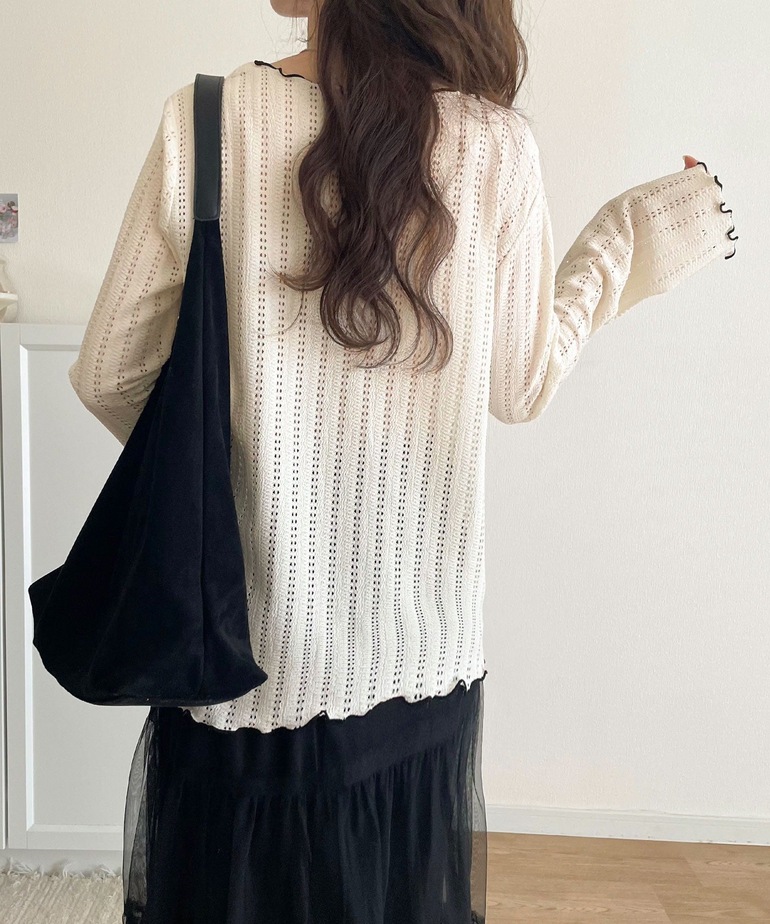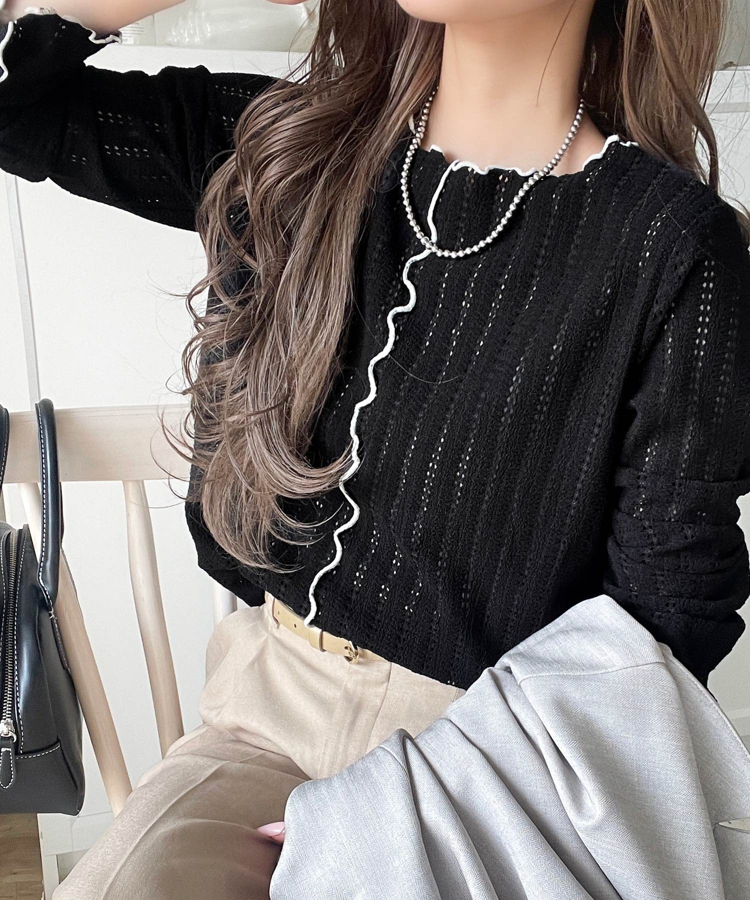 ほどよい透け感と縦ラインの透かし編みで華奢見えが叶う贅沢な1枚♪