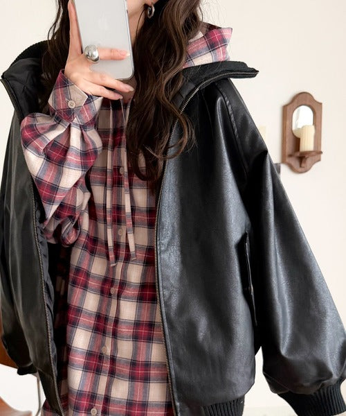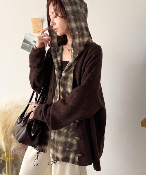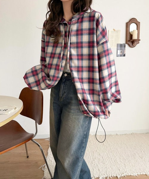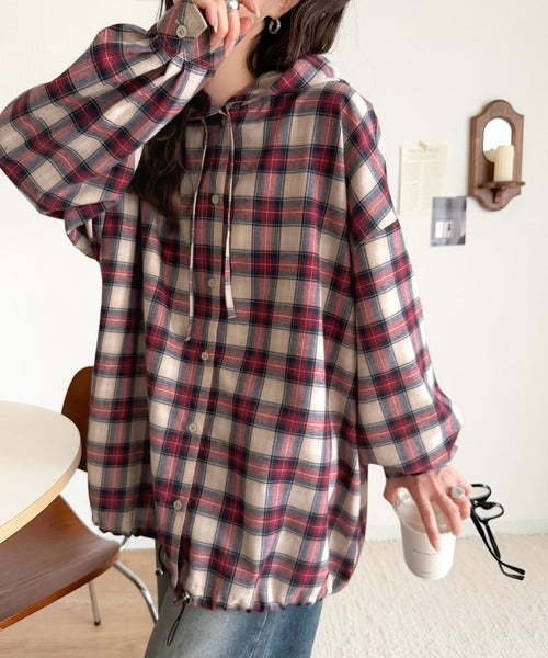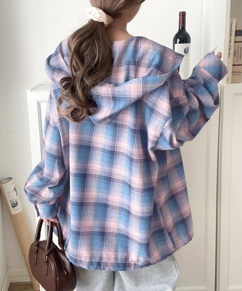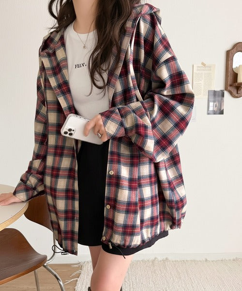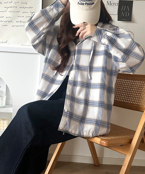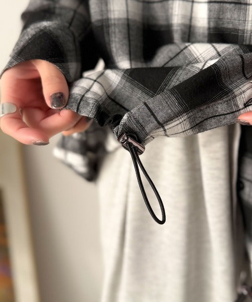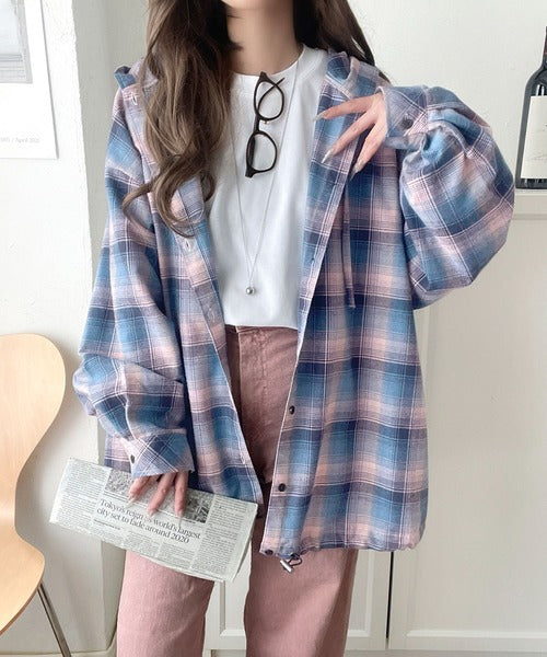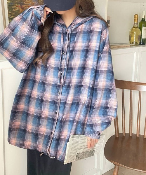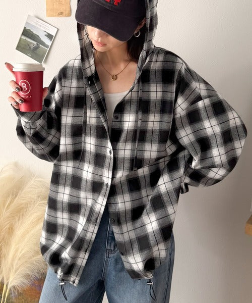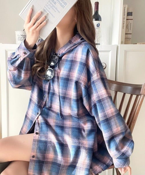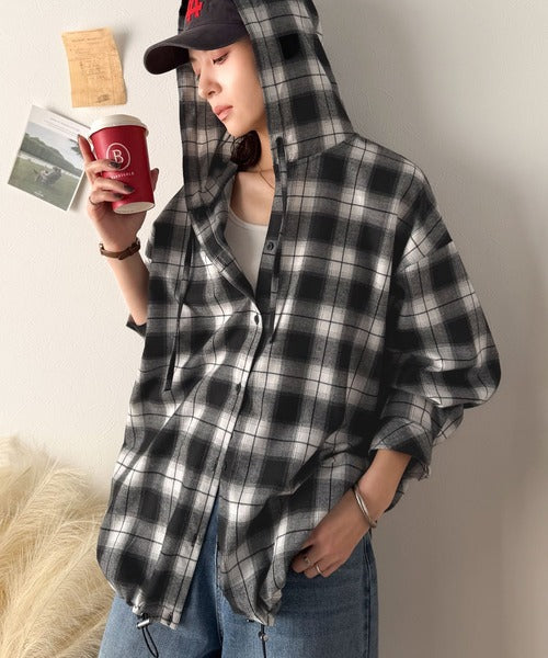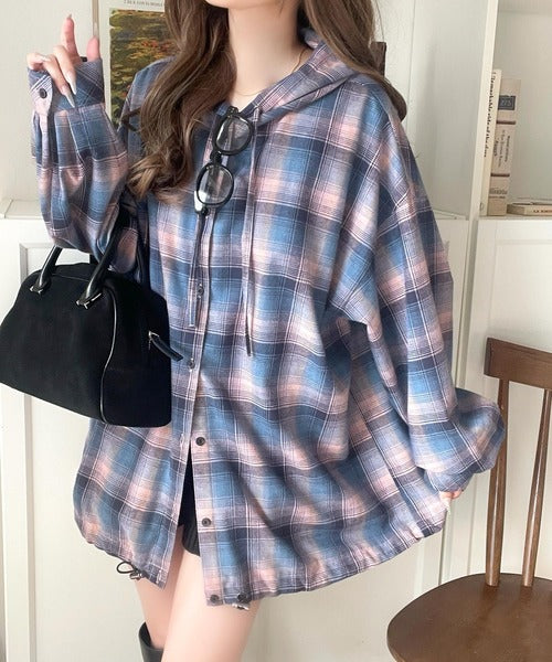 ゆるっと羽織ってかわいくキマる。”旬顔” 裾ドロスト微起毛チェック柄オーバーサイズシャツパーカー ce1010568