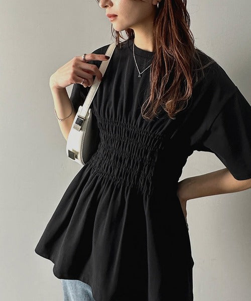 シャーリングデザインで魅せる女性らしいデザインTシャツ。