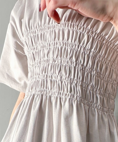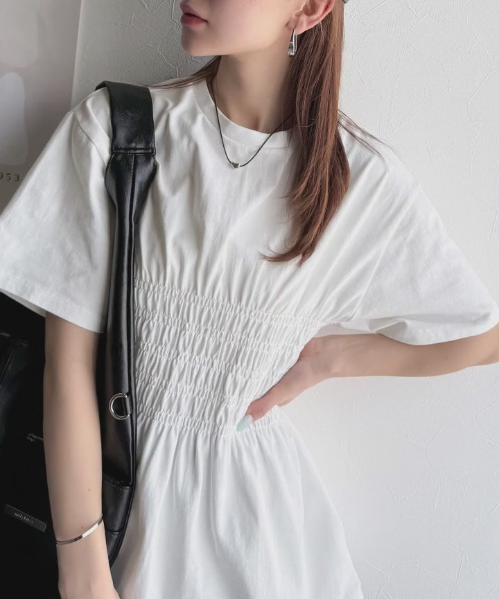 ウエストを高く見せるシャーリングの切り替えが特徴的で、