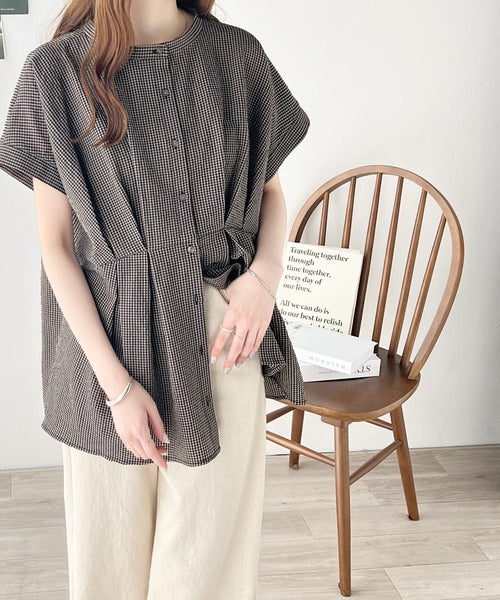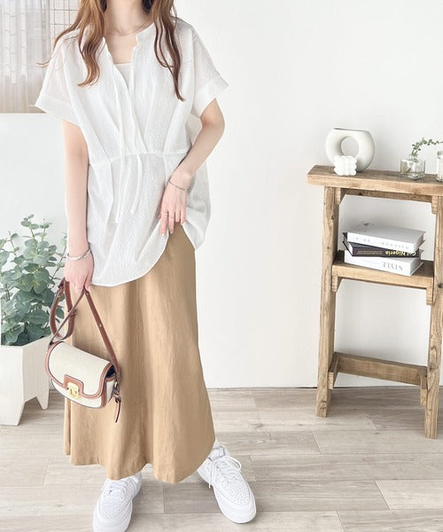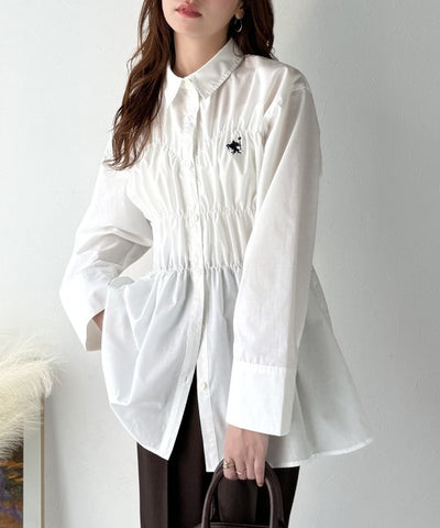 シャツブラウスの上品な印象と、カジュアルさを兼ね備えたデザインが魅力。