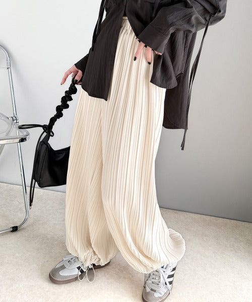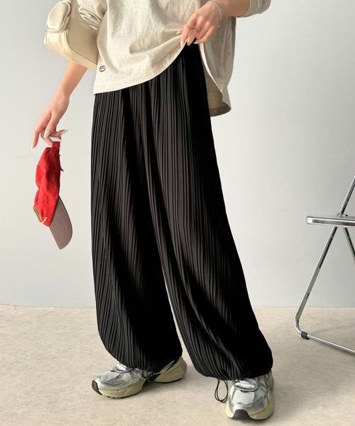 プリーツパンツには珍しく、裾部分にドローコードを施した2wayデザインが特徴!