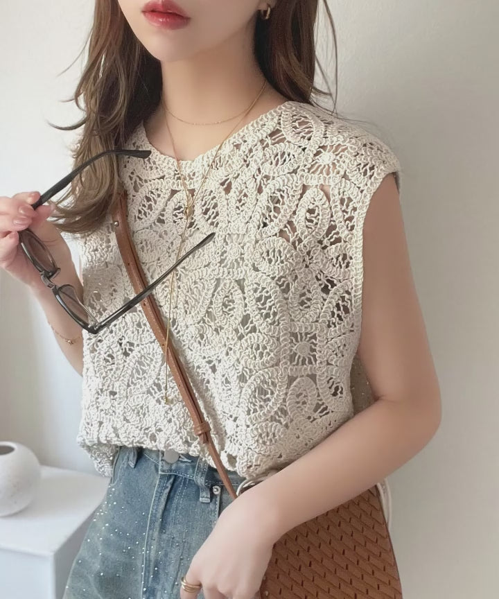 このアイテムは、見え過ぎない程よい透け感の編みデザインが