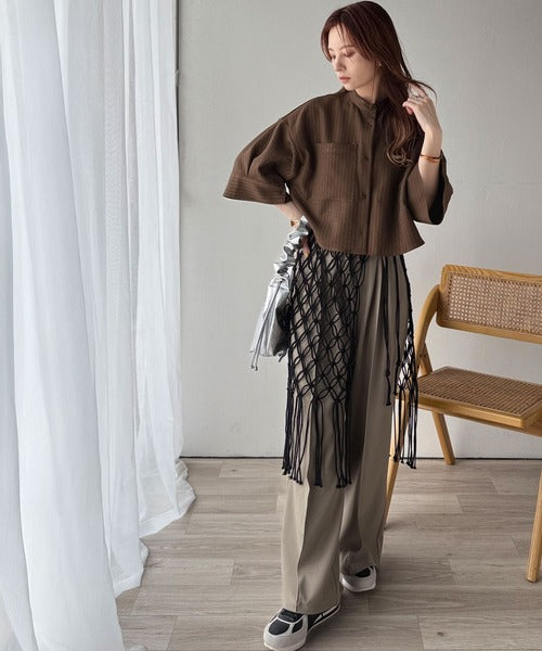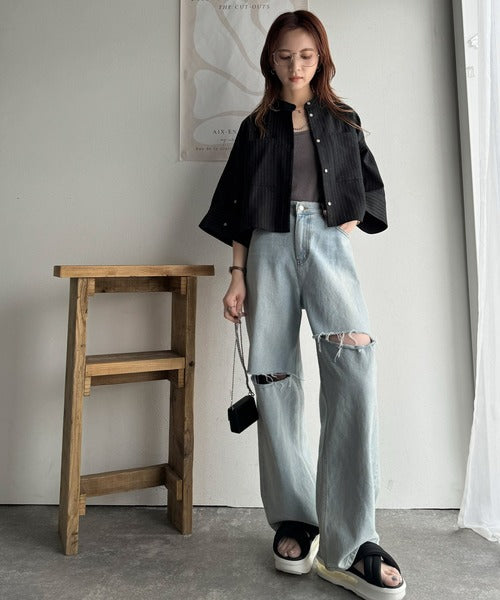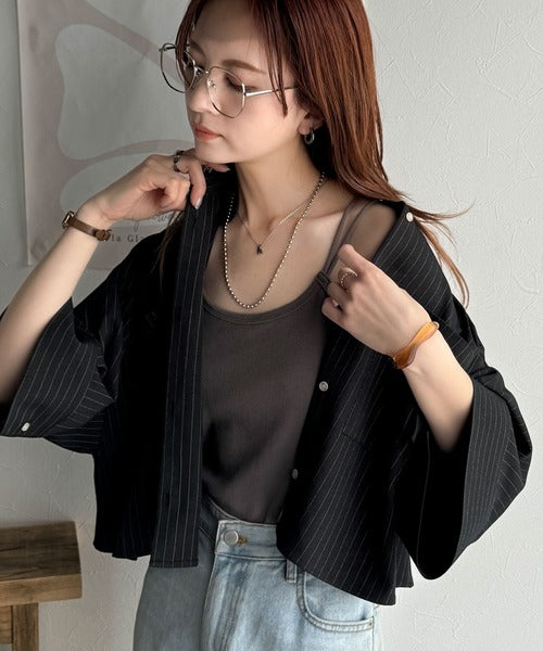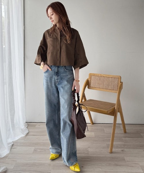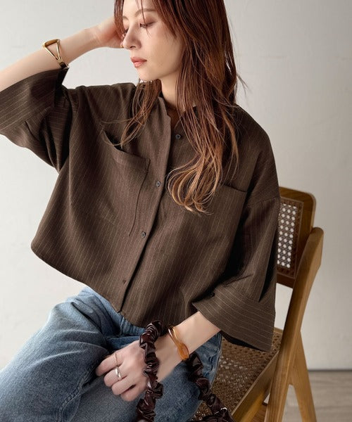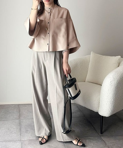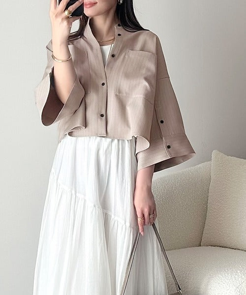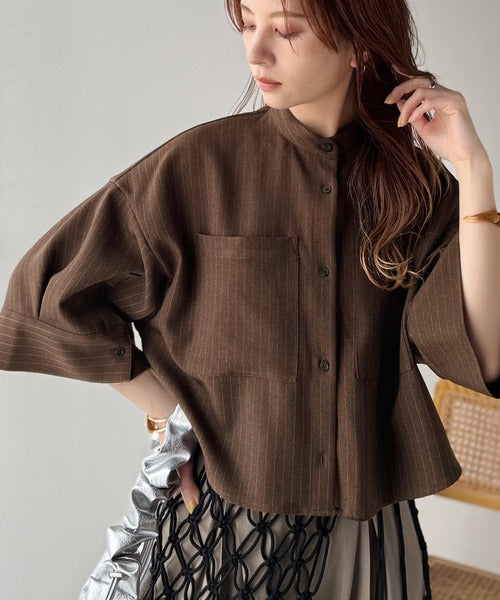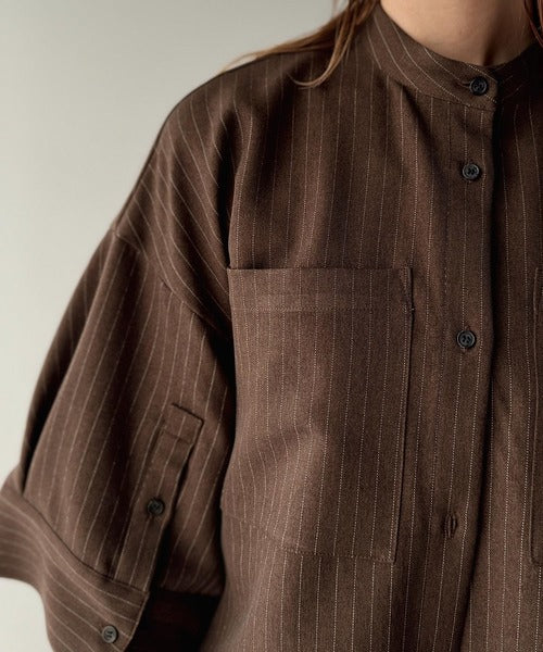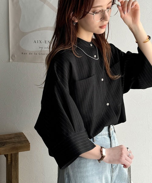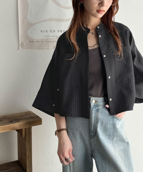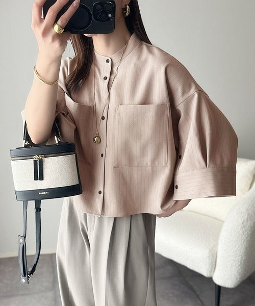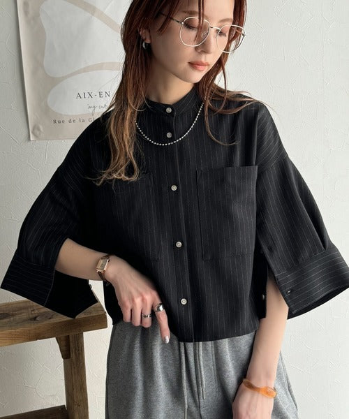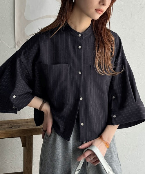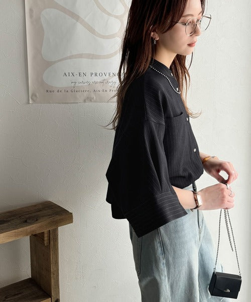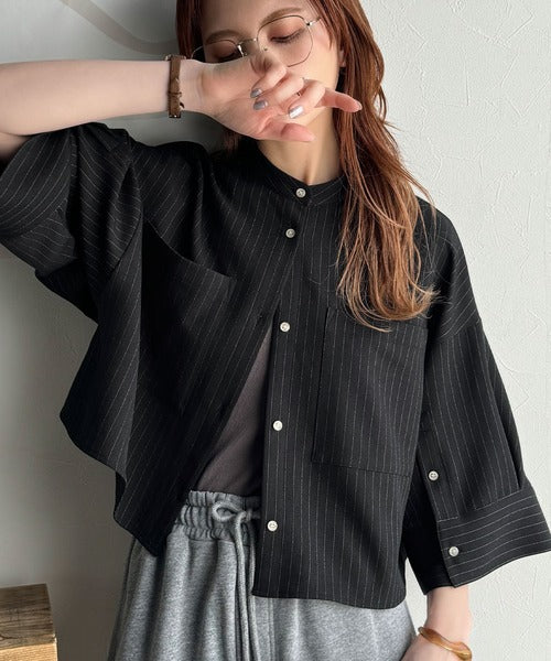 バンドカラーワイドスリーブショート丈ストライプシャツは、様々なスタイルにマッチします。