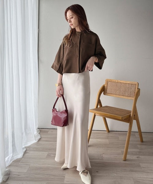 ミディ丈のスカートと組み合わせてフェミニンを引き立てるコーディネートがおすすめ。