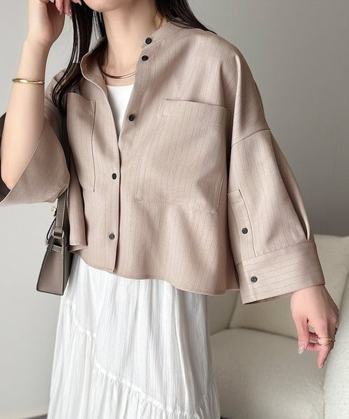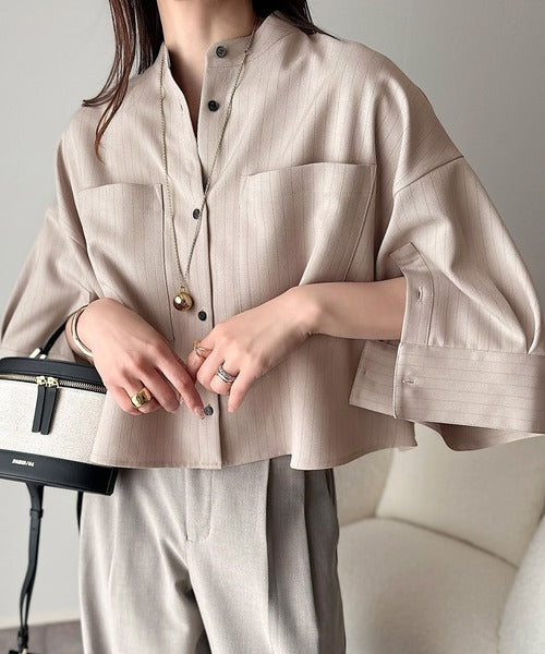 洗練された大人の女性にぴったりな「バンドカラーワイドスリーブショート丈ストライプシャツ」は、