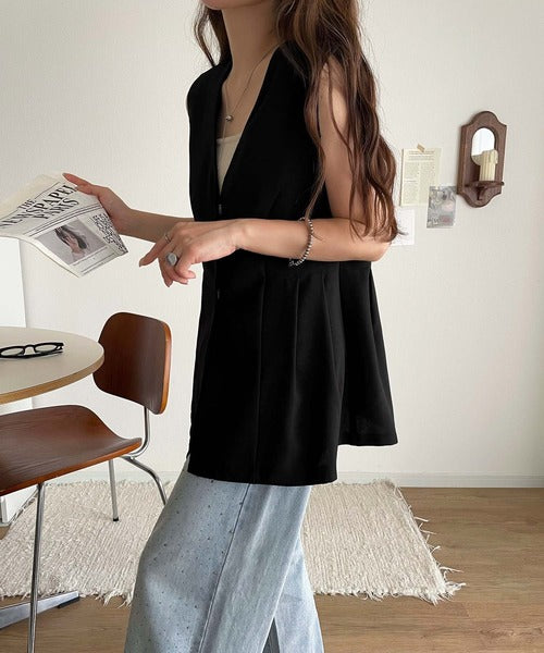 羽織るだけで旬顔に仕上がる「比翼デザインペプラムジレベスト」。