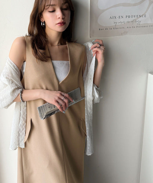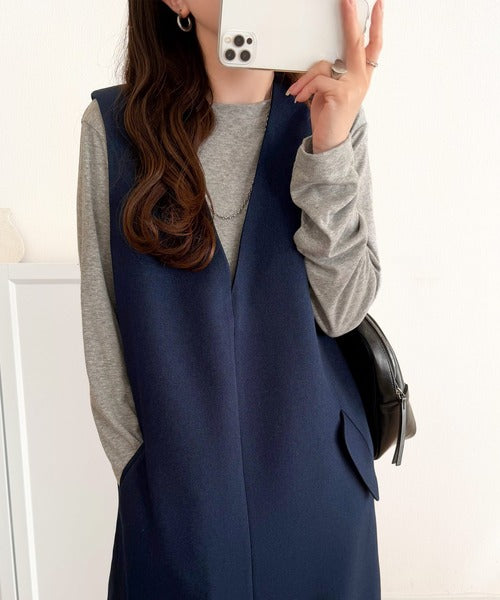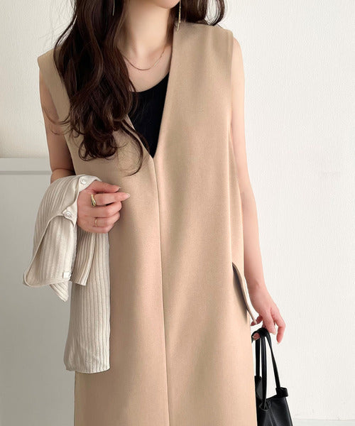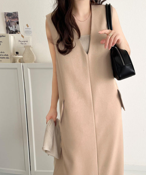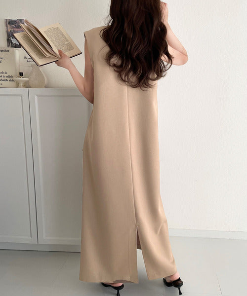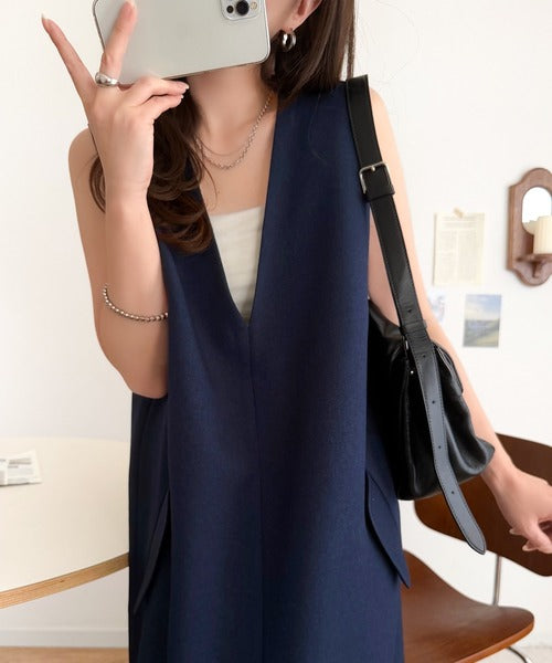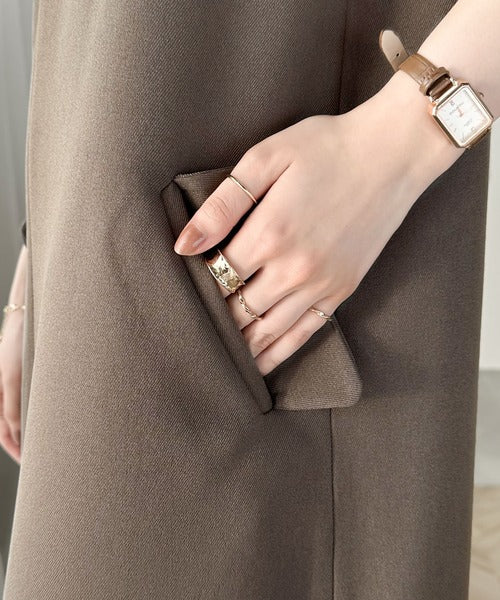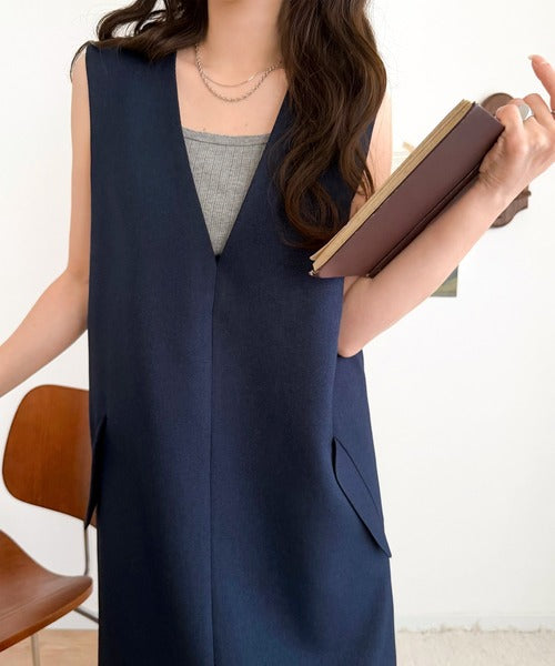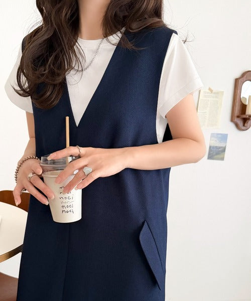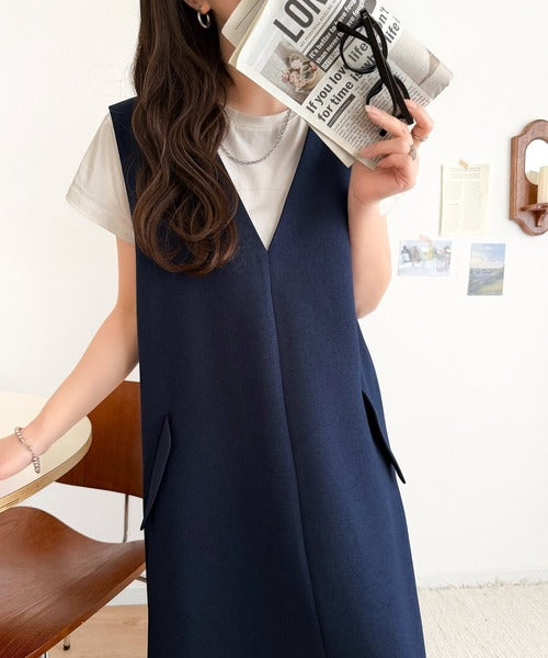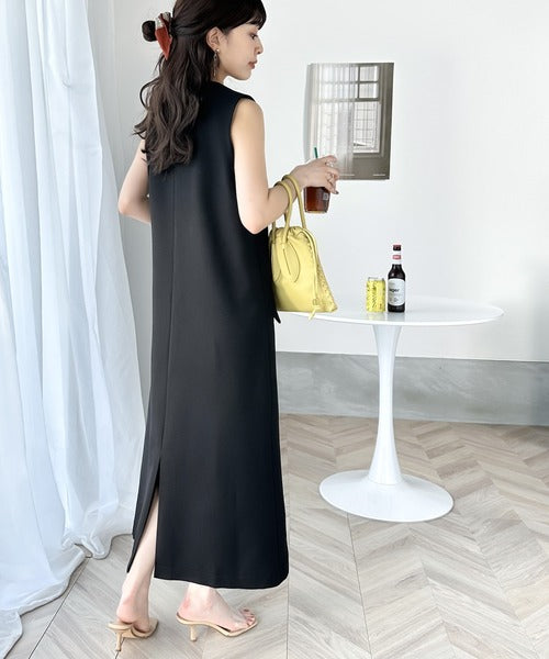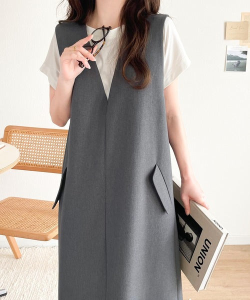 シンプルなデザインながらもフロントのVネックとフラップポケットがアクセントのワンピース。バックにはスリットも入っているので抜け感も抜群◎