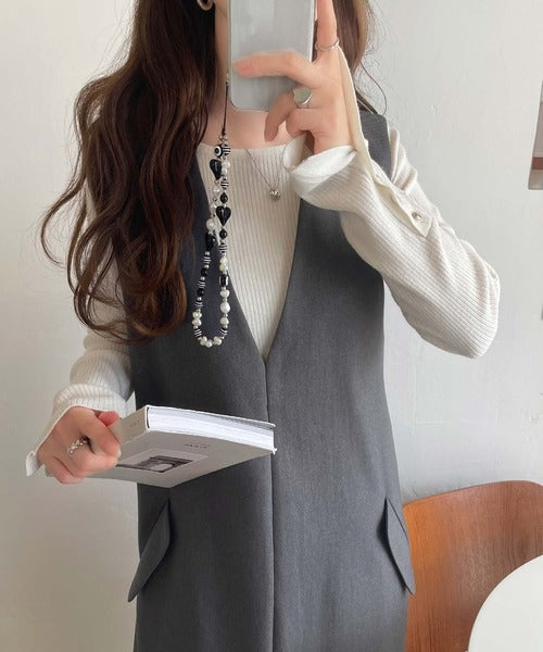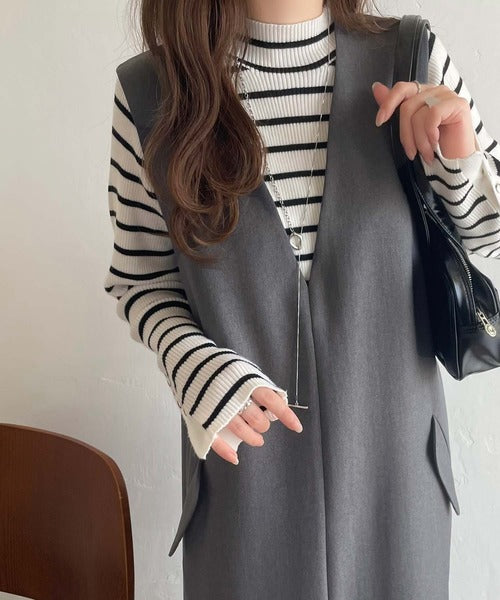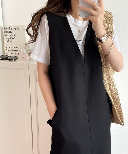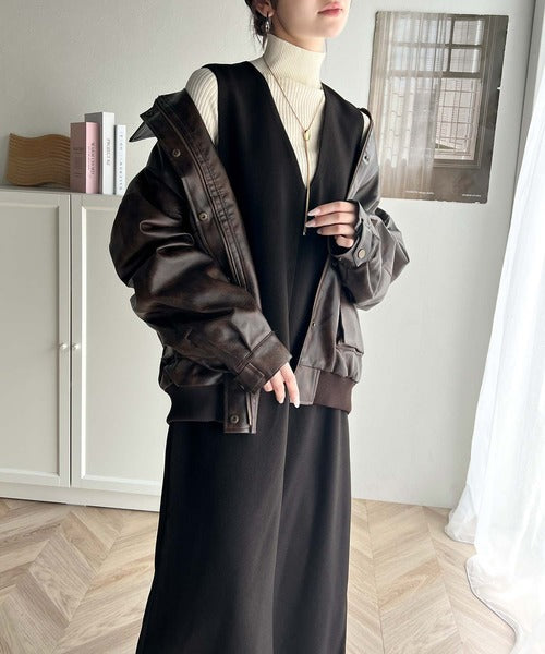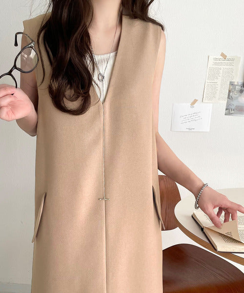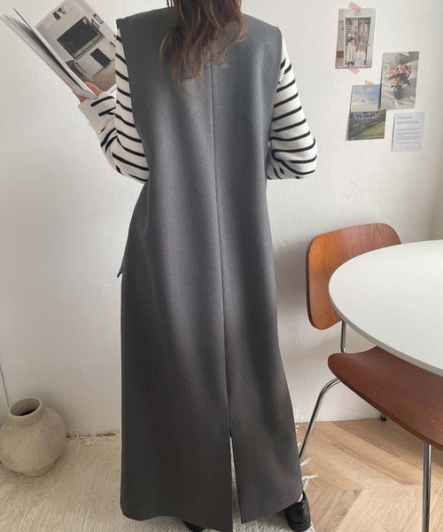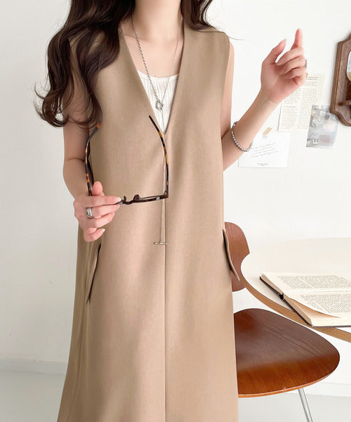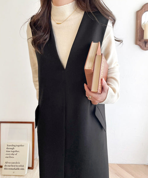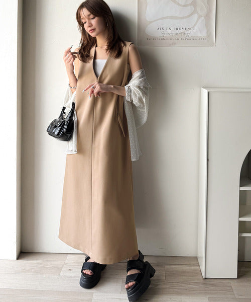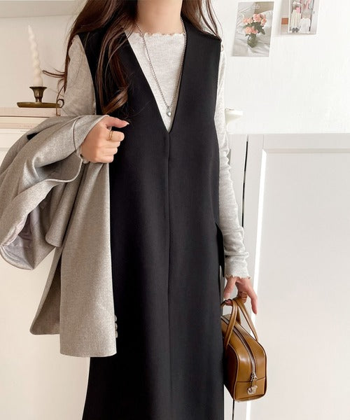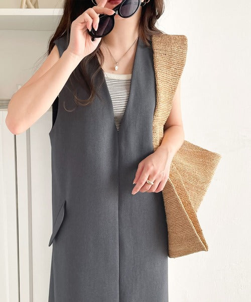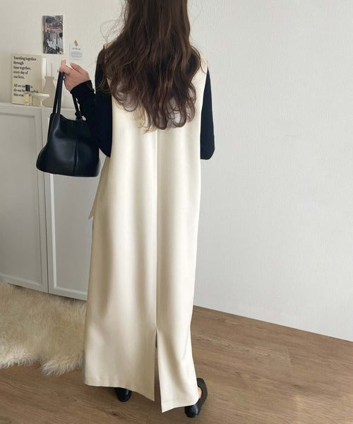 シンプルなデザインながらもフロントのVネックとフラップポケットがアクセントのワンピース。バックにはスリットも入っているので抜け感も抜群◎