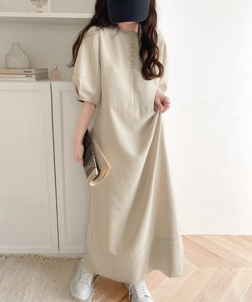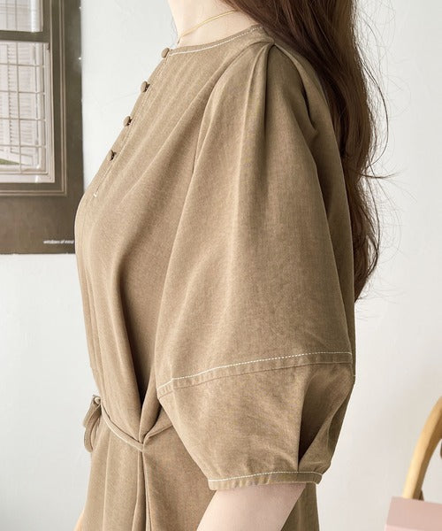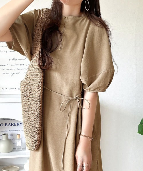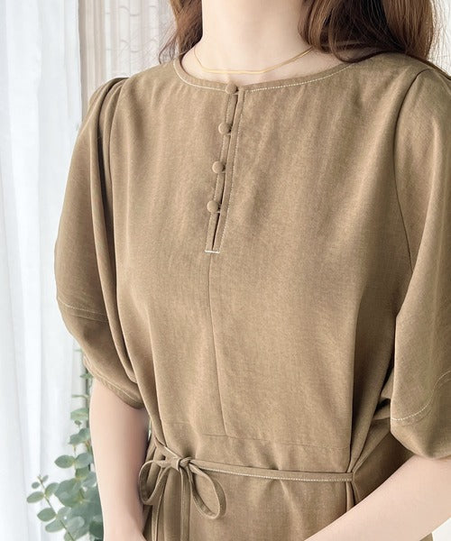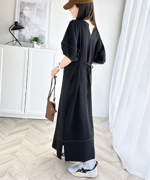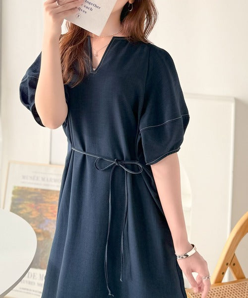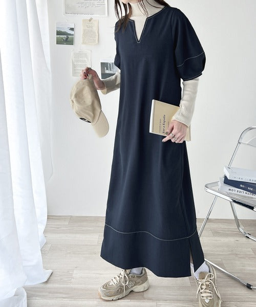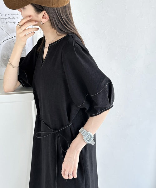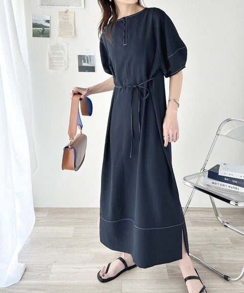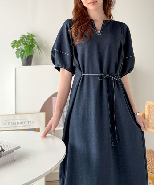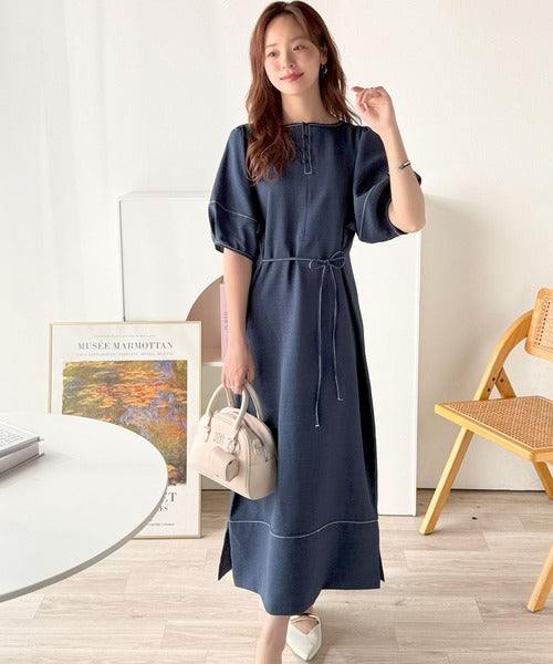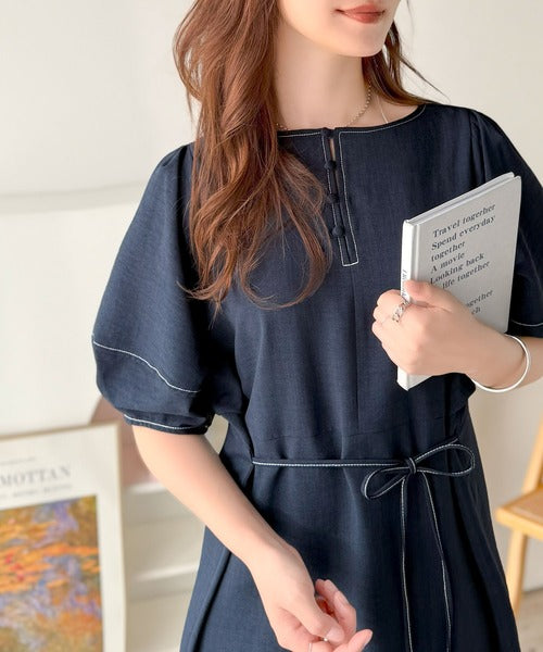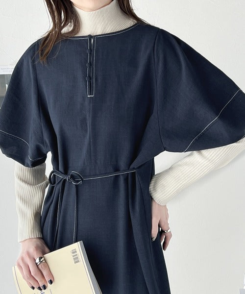 ナチュラル感が魅力。前後2way 配色ステッチランタンスリーブワンピース ce1260161