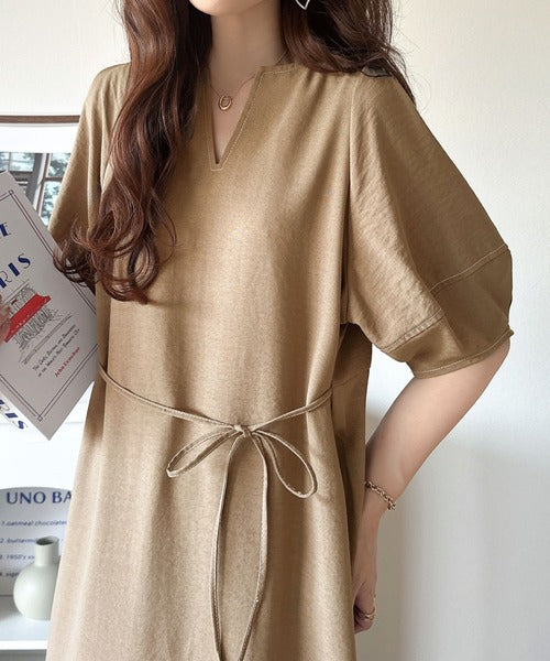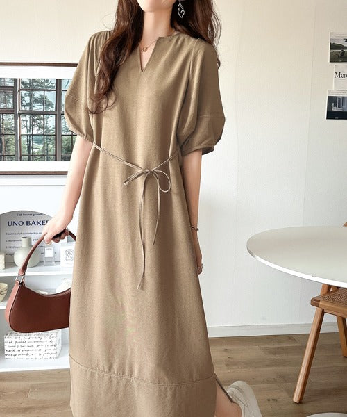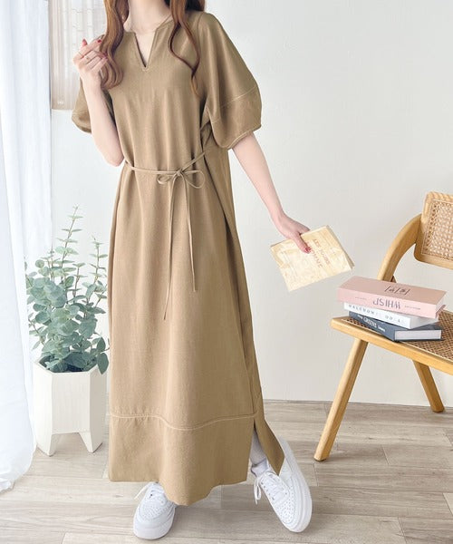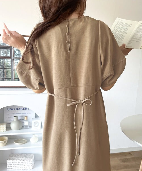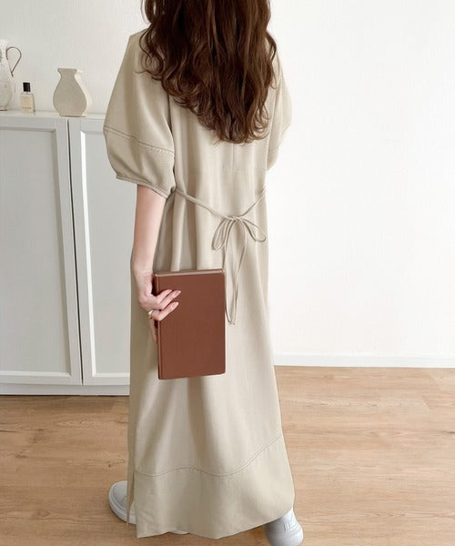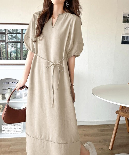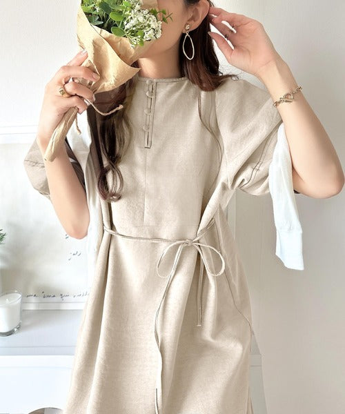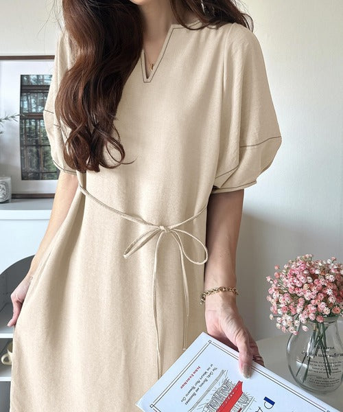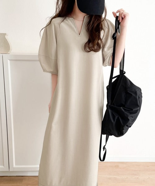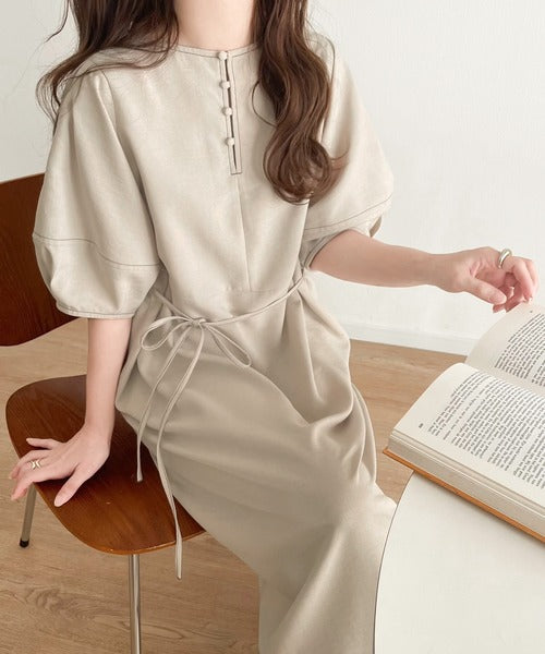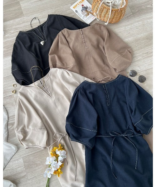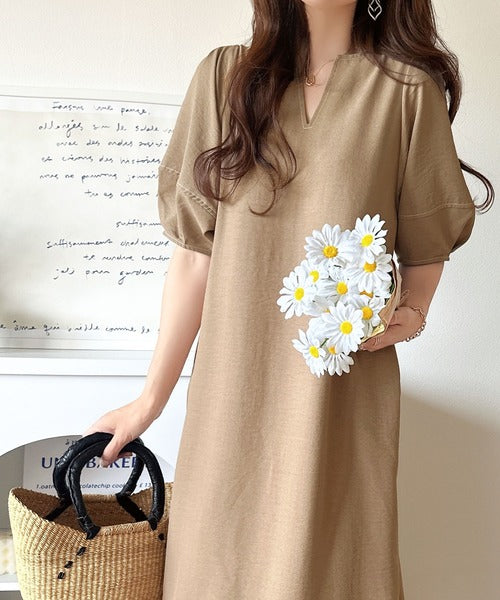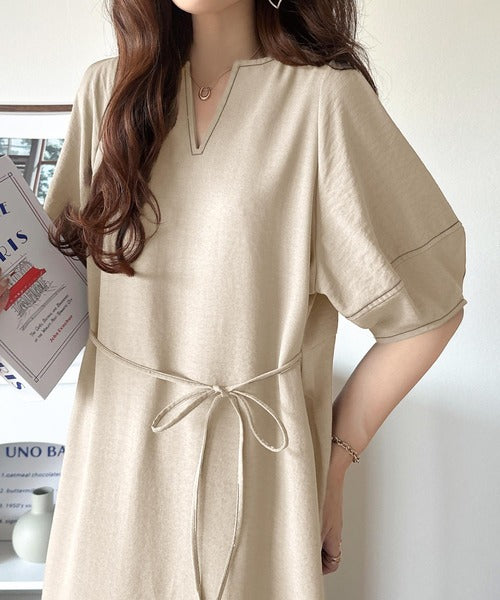 ナチュラル感が魅力。前後2way 配色ステッチランタンスリーブワンピース ce1260161