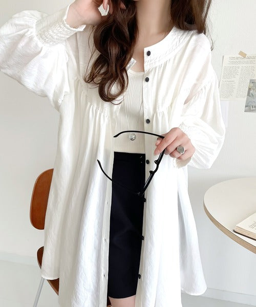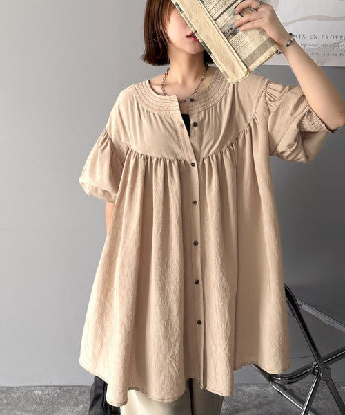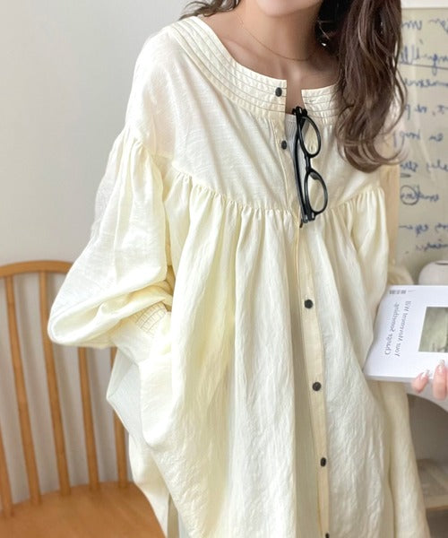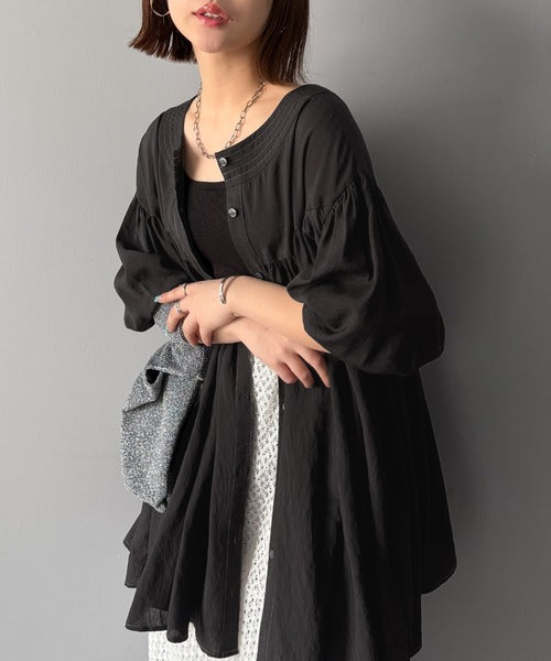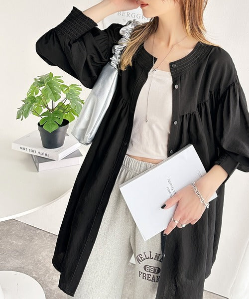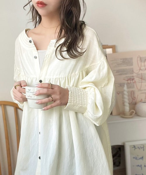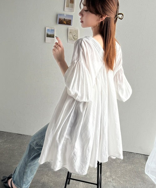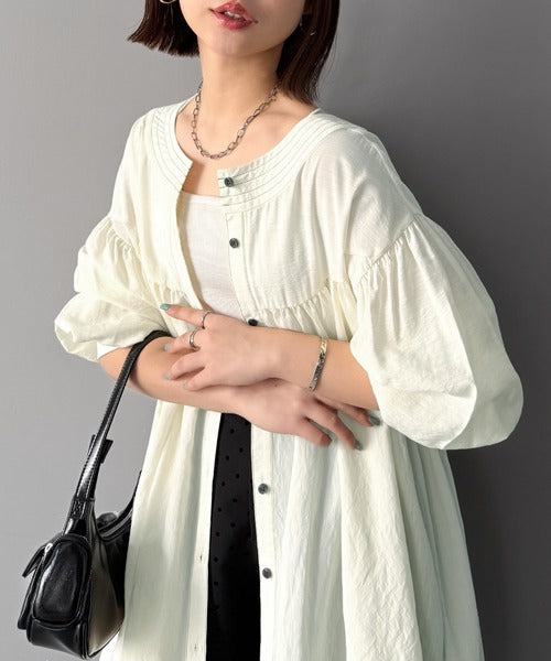 ふんわりとしたボリューム袖が施され、フェミニンな印象を引き立てます。