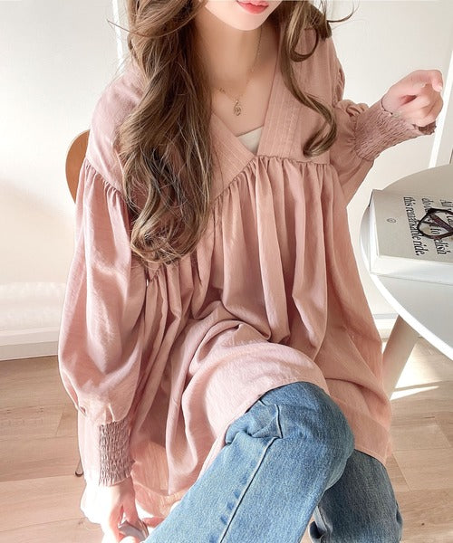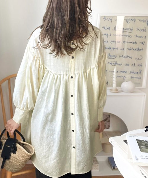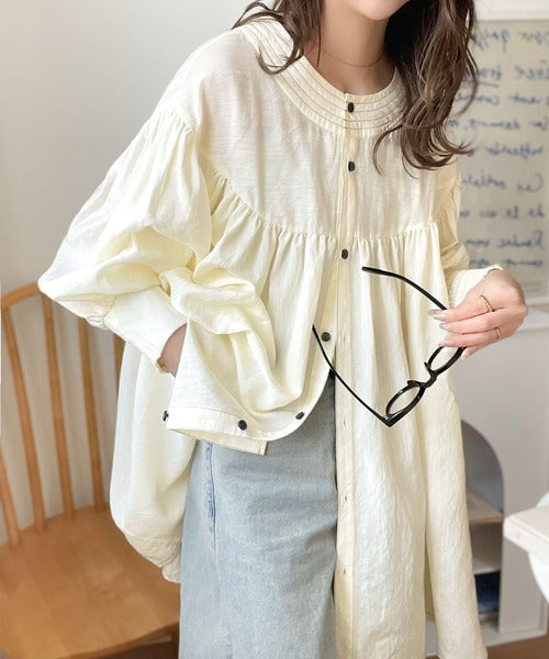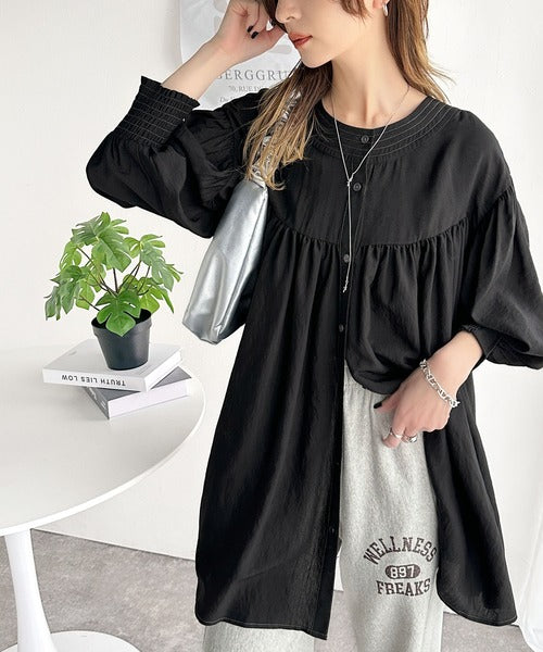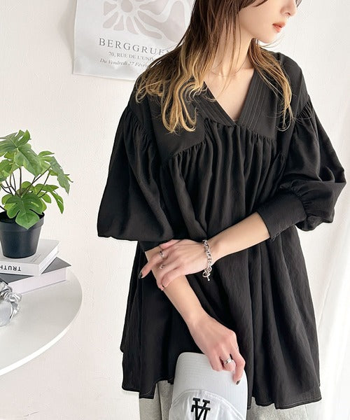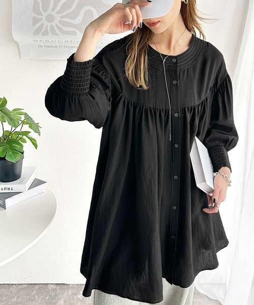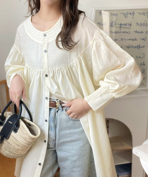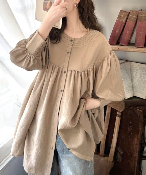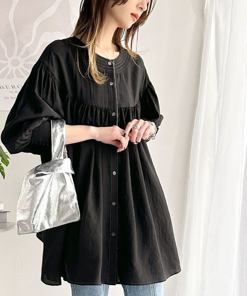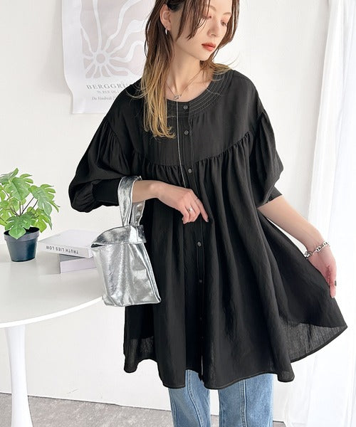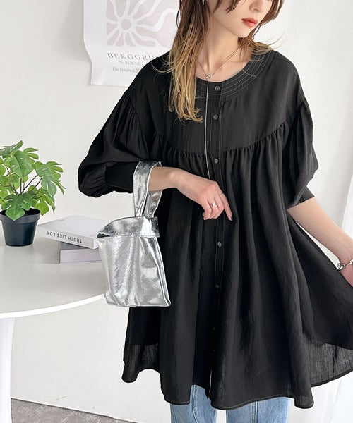 可愛さとトレンド感の両立。前後2WAY配色ステッチボリュームギャザーチュニックブラウス(長袖) ce1260376