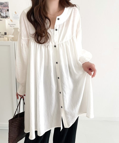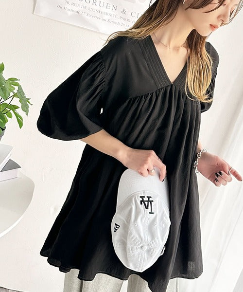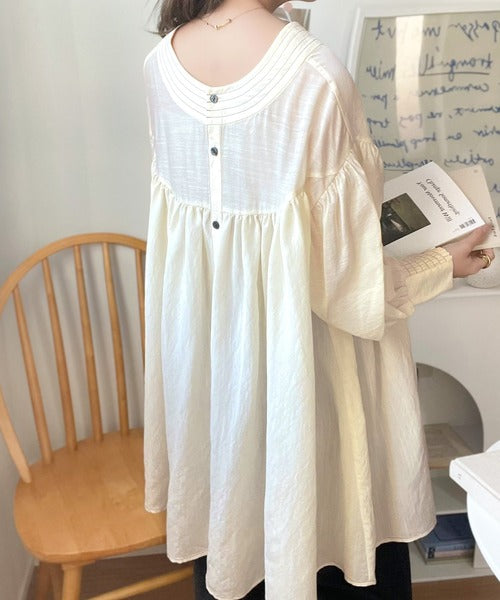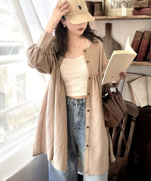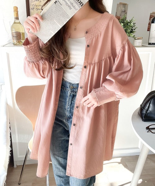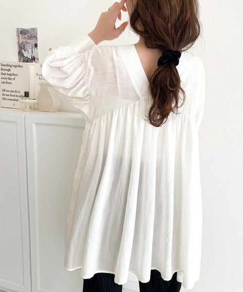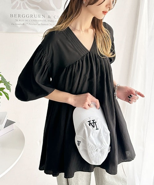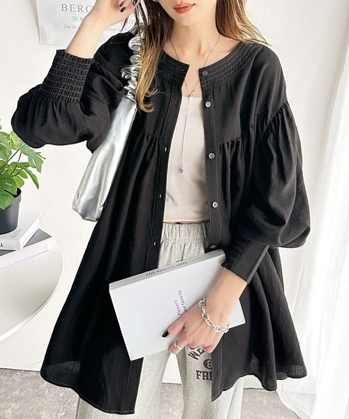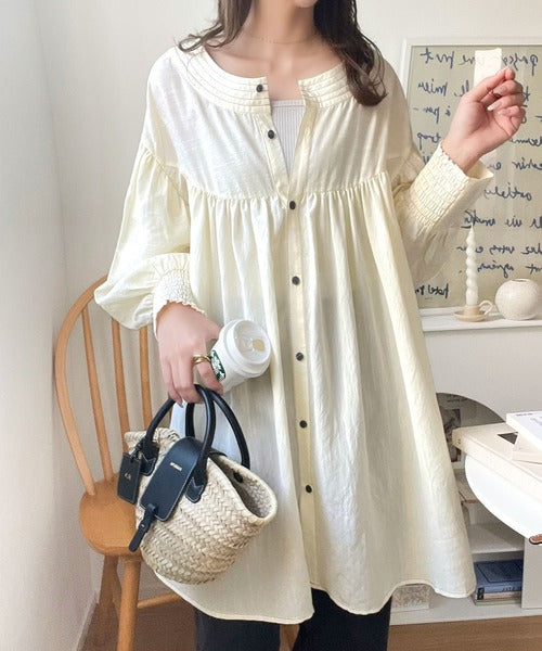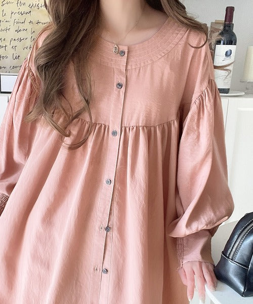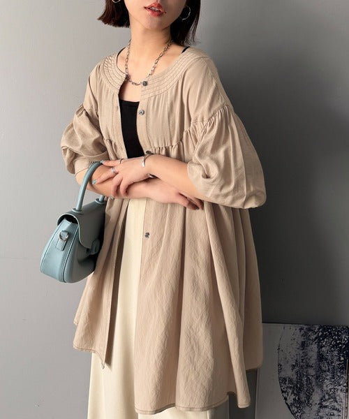 可愛さとトレンド感の両立。前後2WAY配色ステッチボリュームギャザーチュニックブラウス(長袖) ce1260376