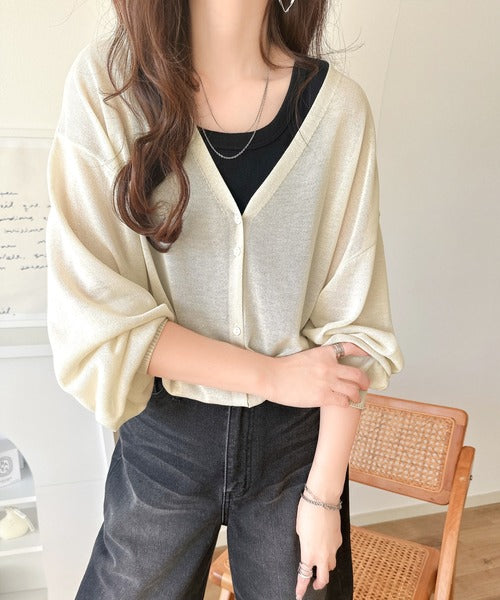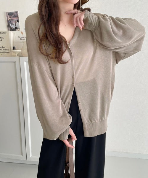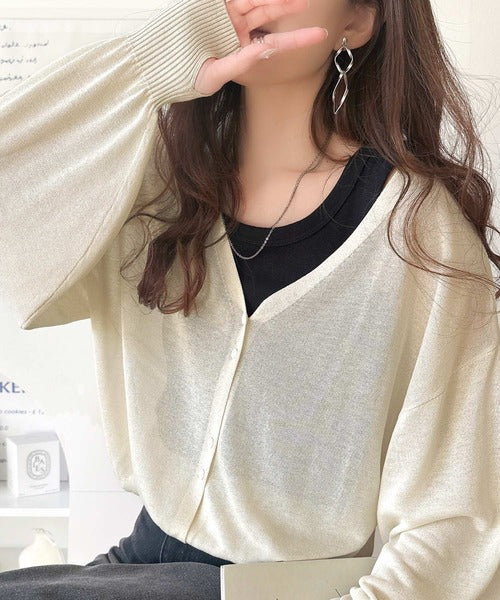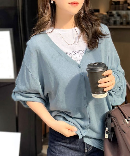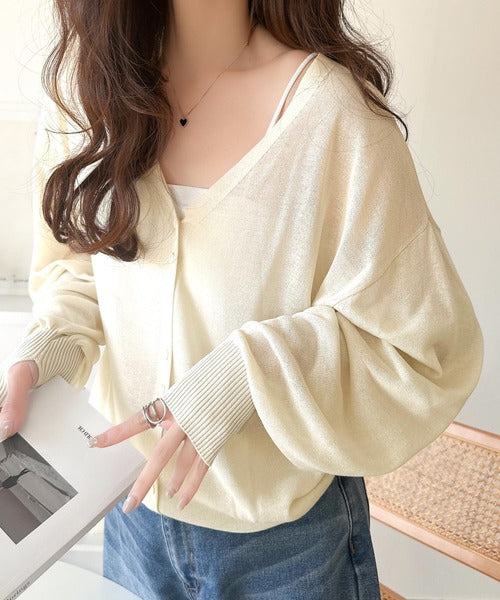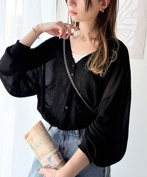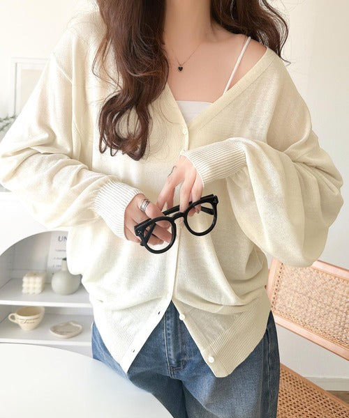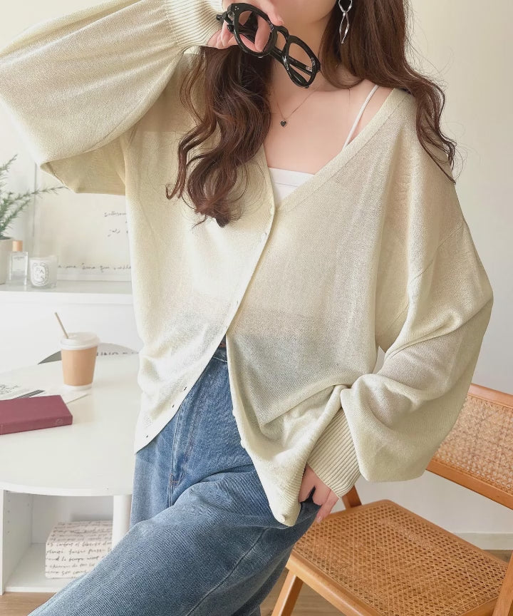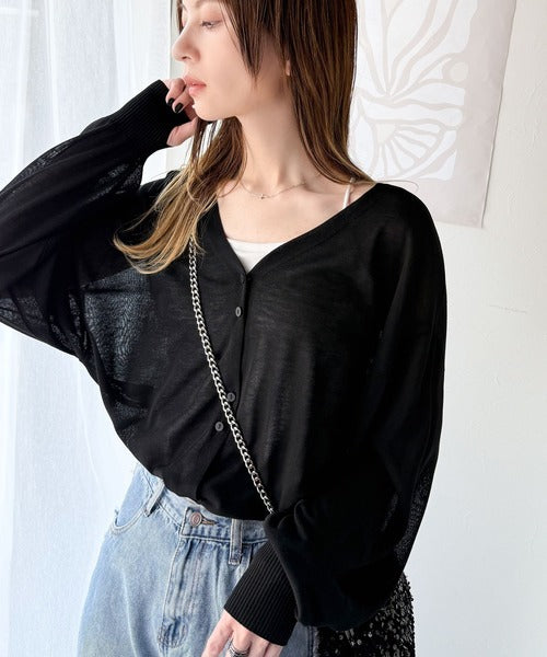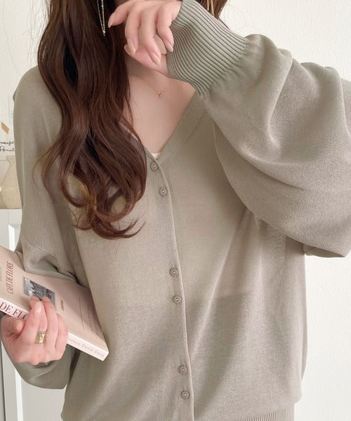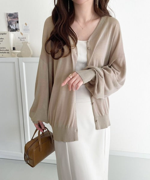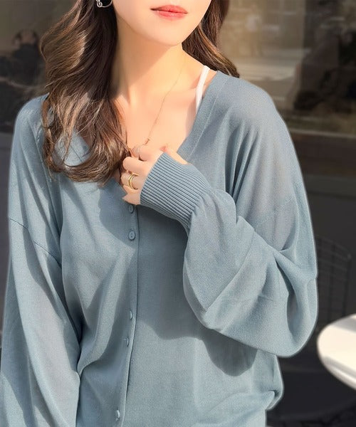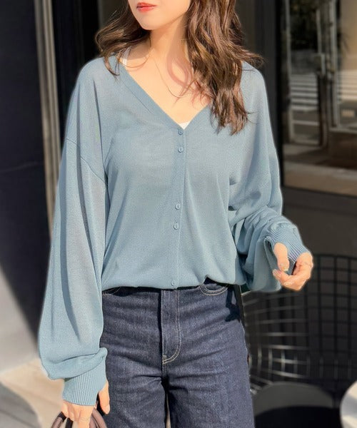 涼しげなシアー素材が魅力。シアーパフスリーブサムホールVネックニットカーディガン(長袖) ce1260417