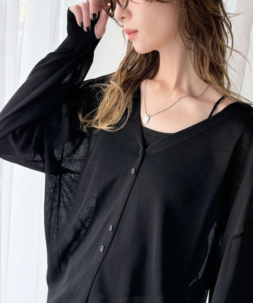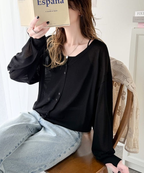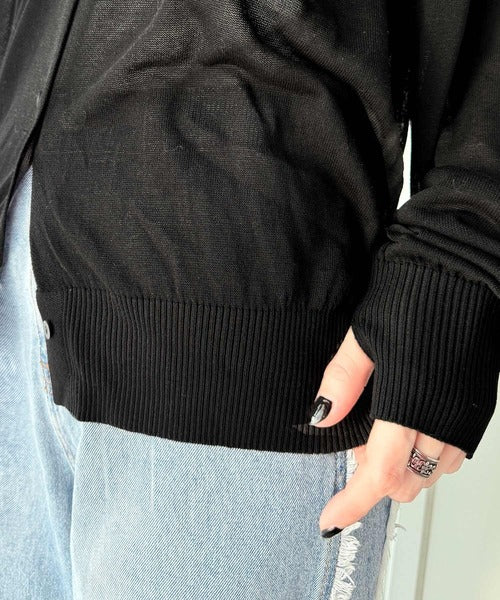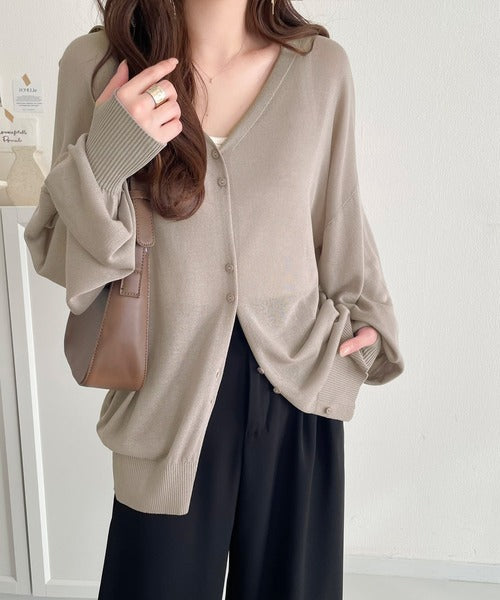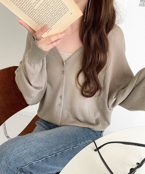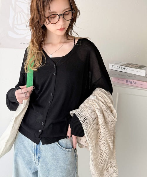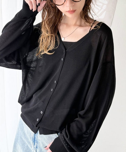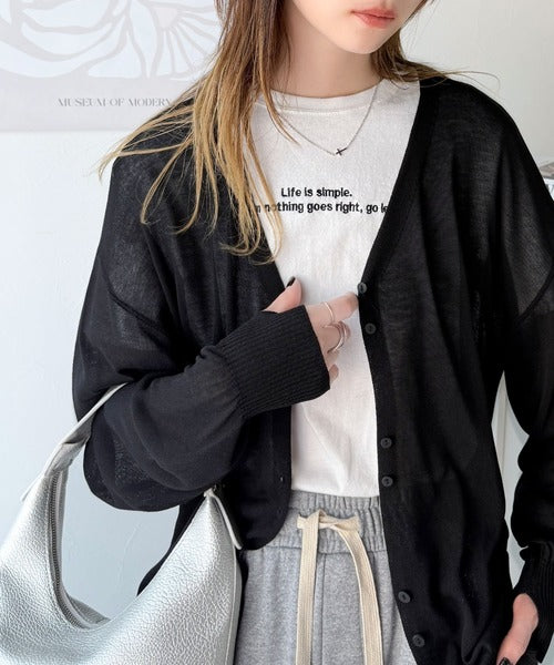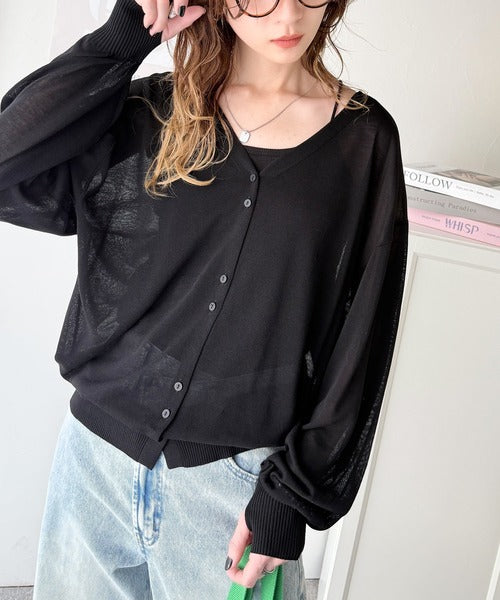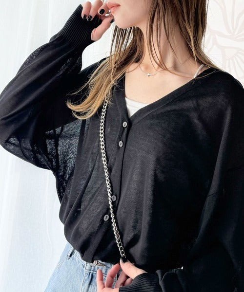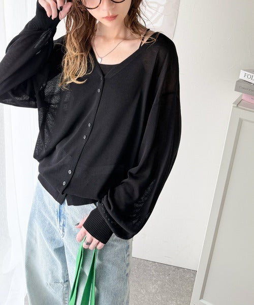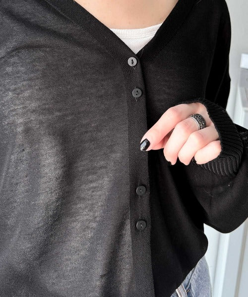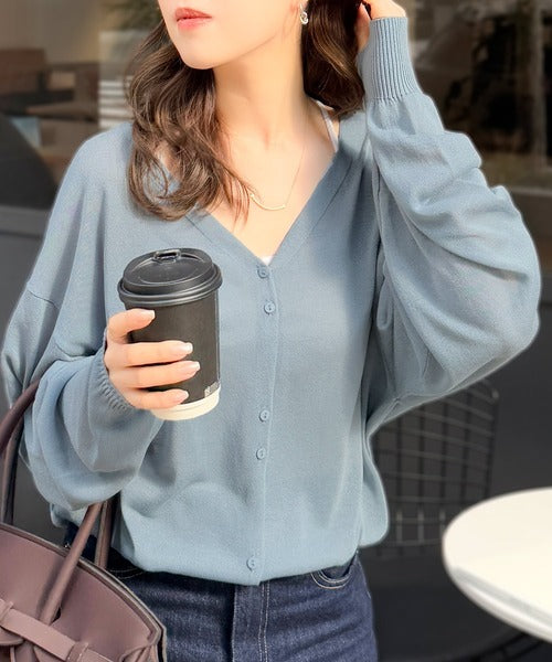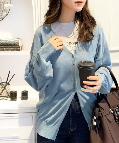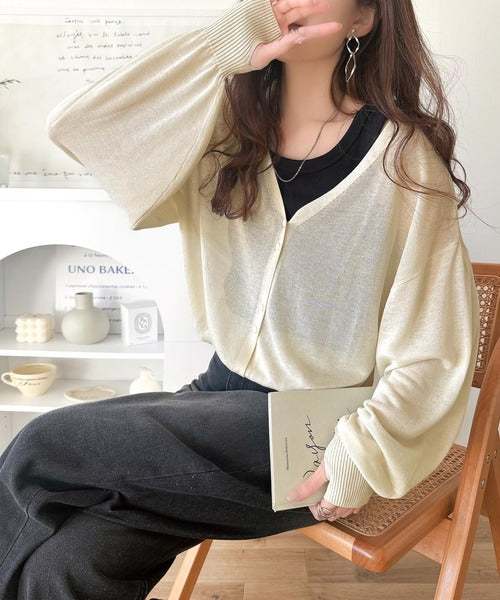 涼しげなシアー素材が魅力。シアーパフスリーブサムホールVネックニットカーディガン(長袖) ce1260417