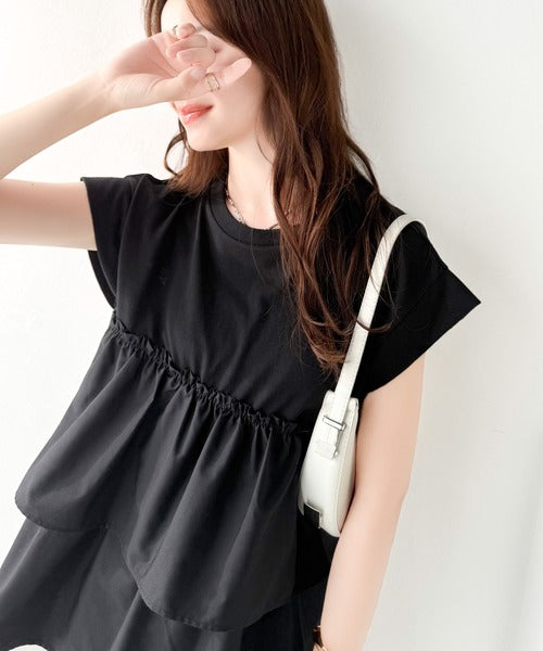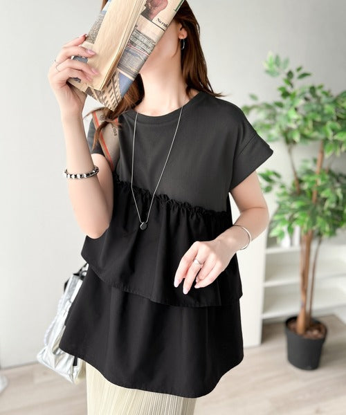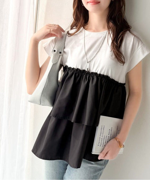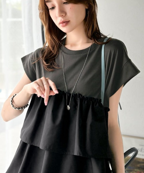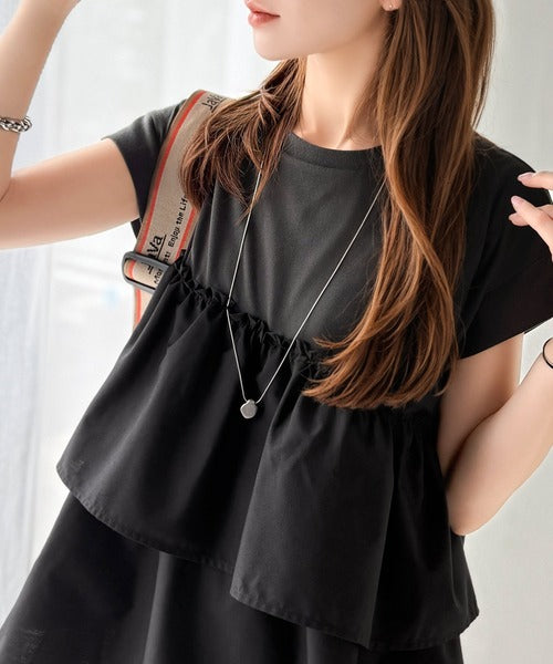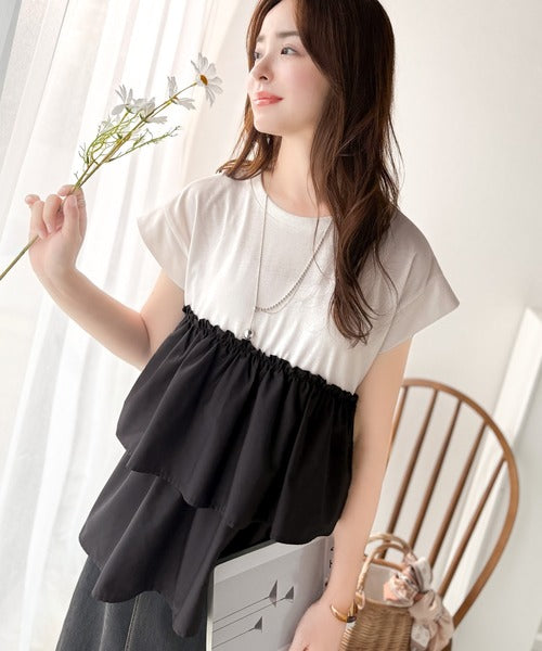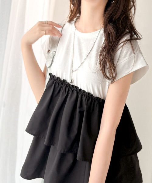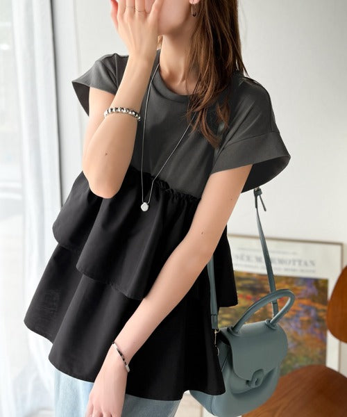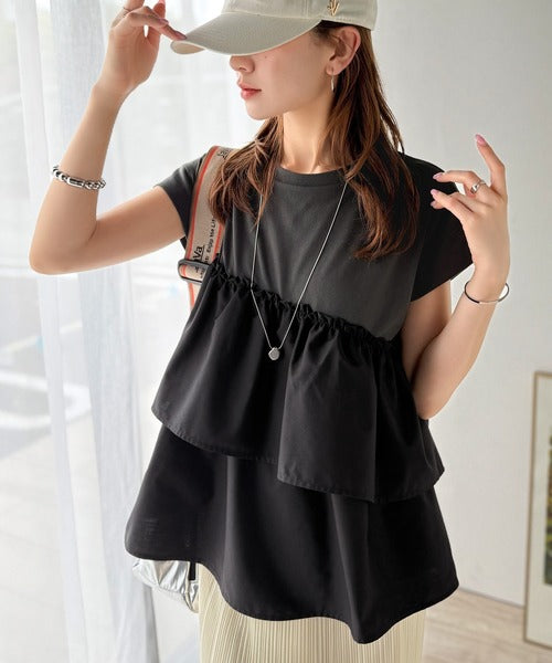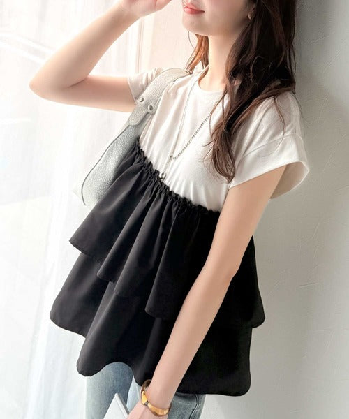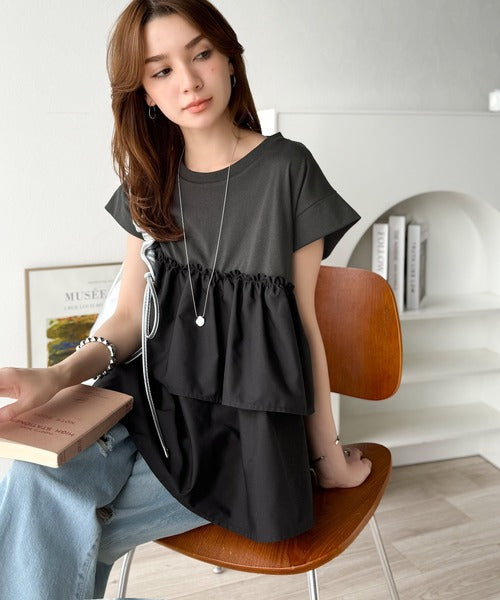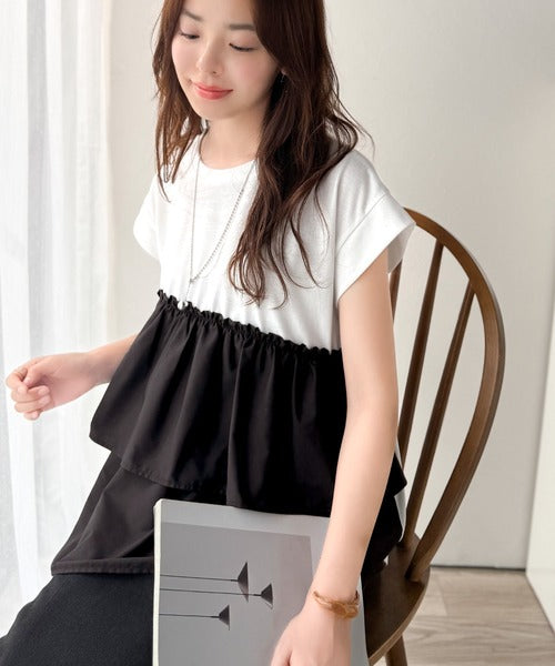 さらっとしたカットソーとふんわりフリルの切り替えデザインが特徴。
