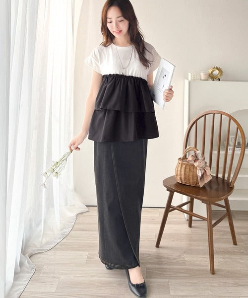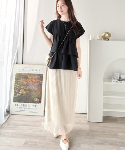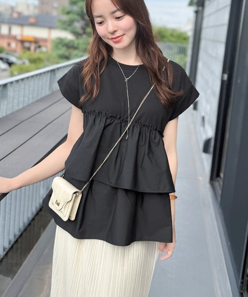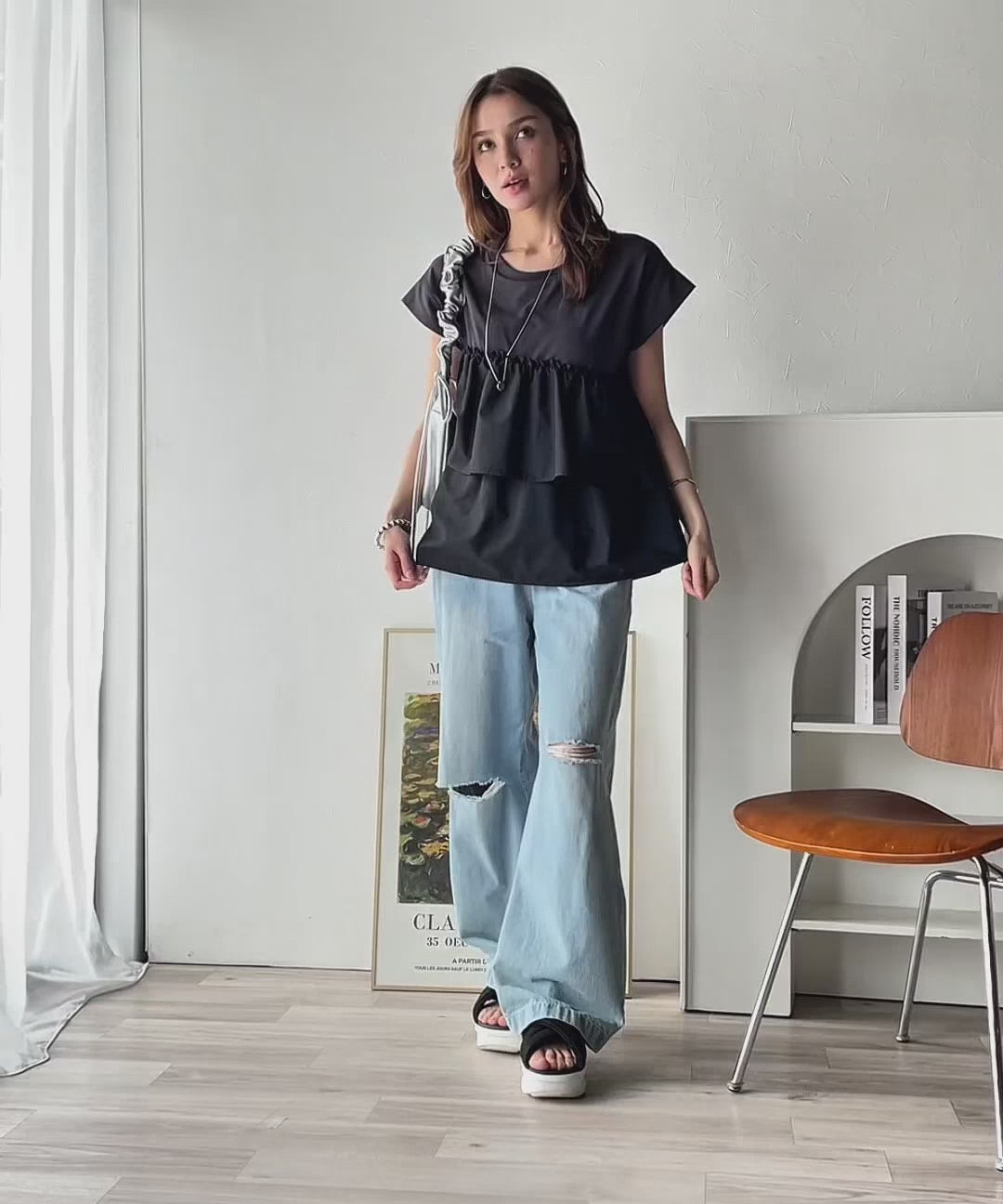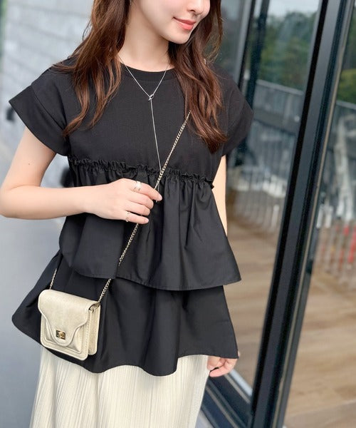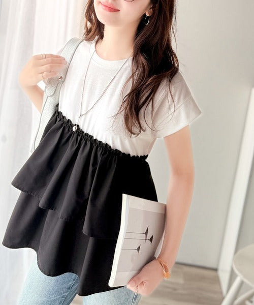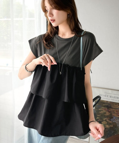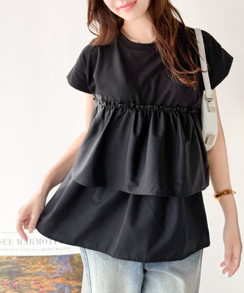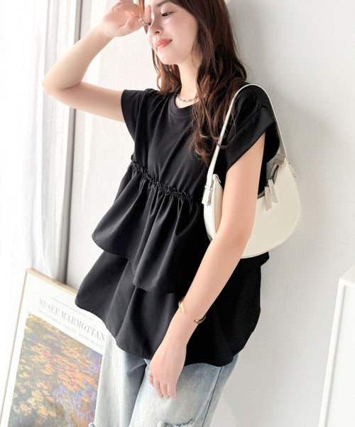 さらっとしたカットソーとふんわりフリルの切り替えデザインが特徴。