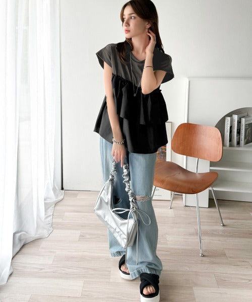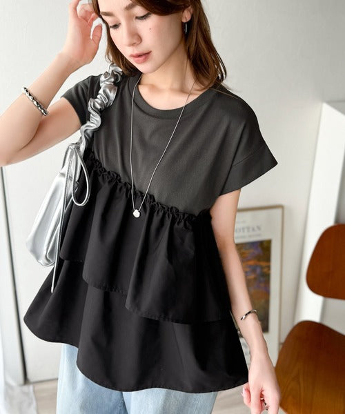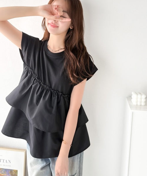 計算された、アンバランス。 アシンメトリーティアードフリル切り替えトップス(半袖) ce1260481