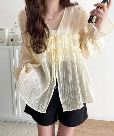 シアーシャツやニットカーディガンを合わせれば、お出かけにもピッタリ◎