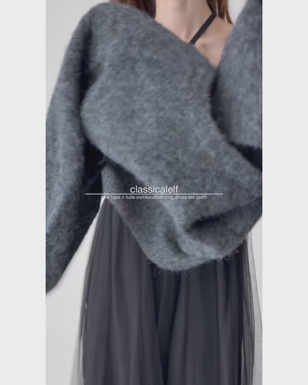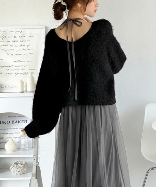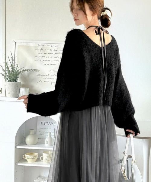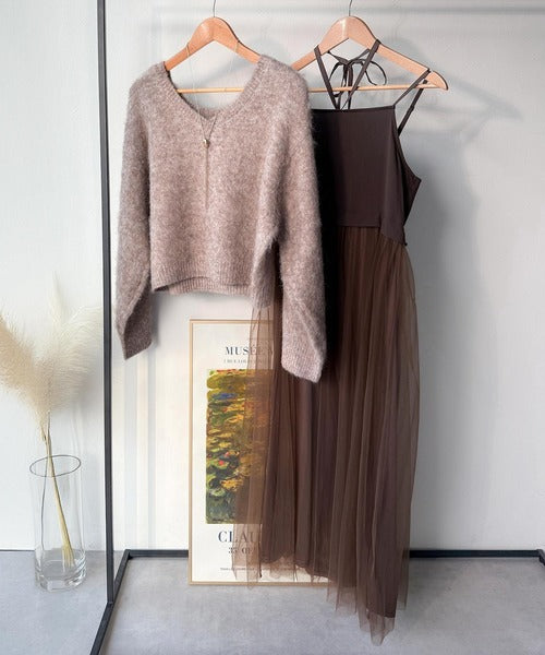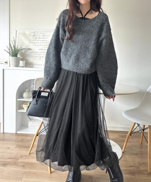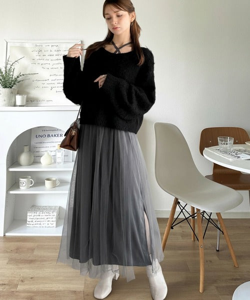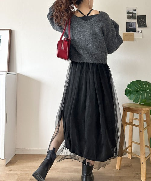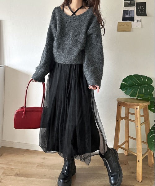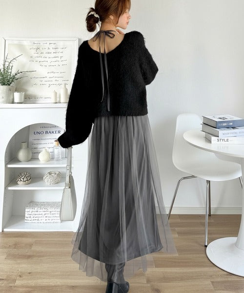 贅沢なニットトップス×チュールコンビワンピースセット。