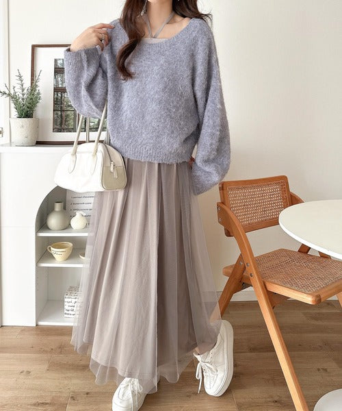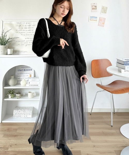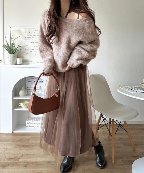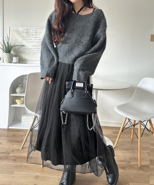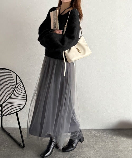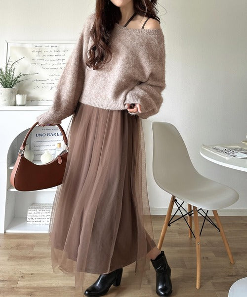 ニットは軽くて暖かみがあり、チュールは繊細で落ち感あり◎
