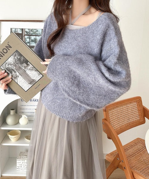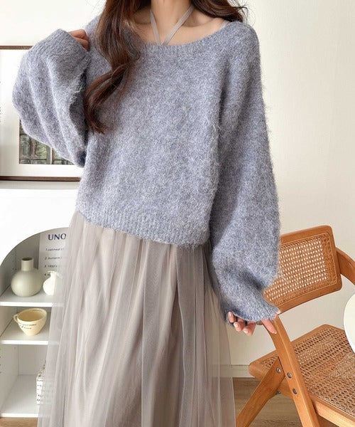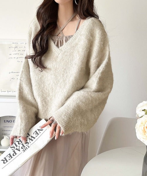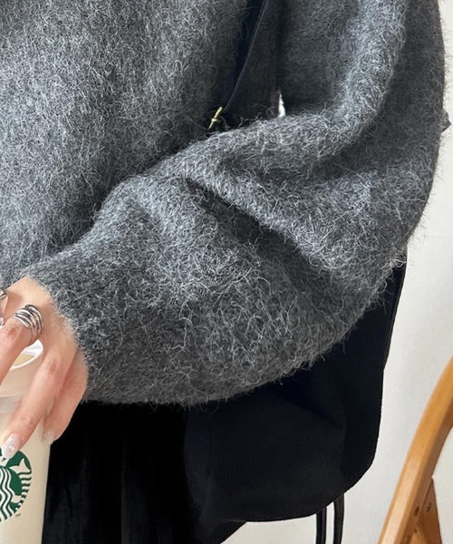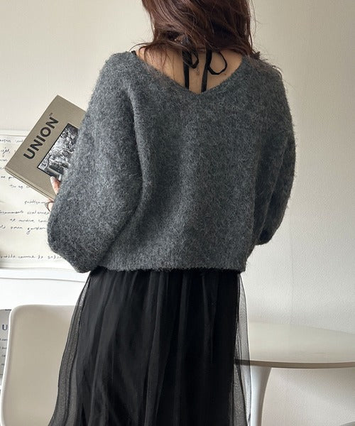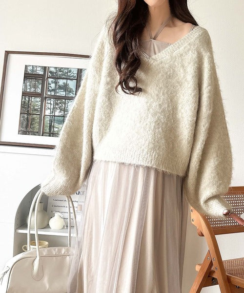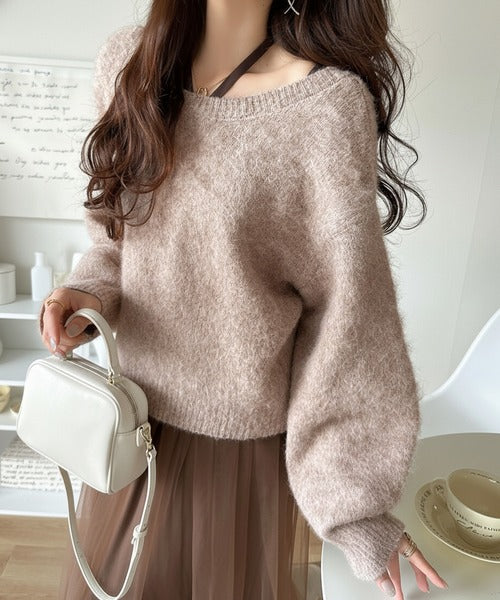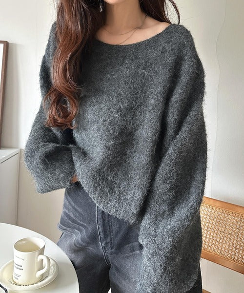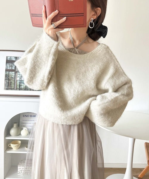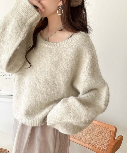 ・トップスは、ぽわん袖デザインの毛足のあるニット素材のプルオーバー