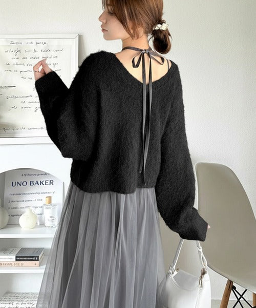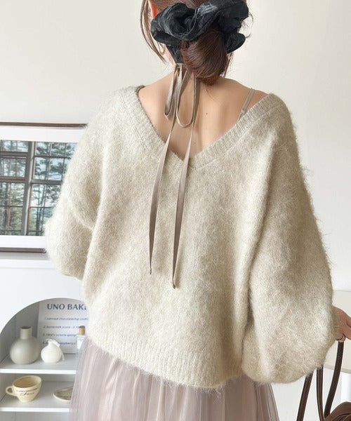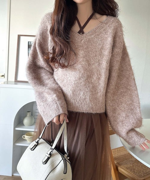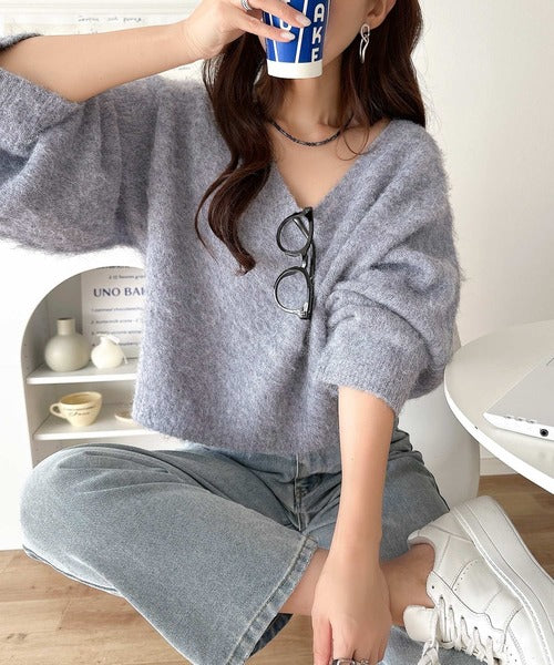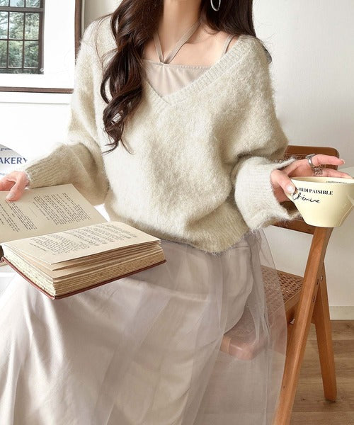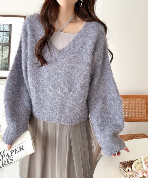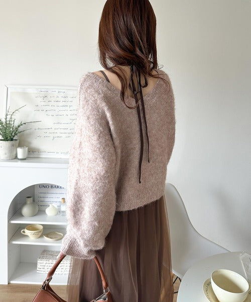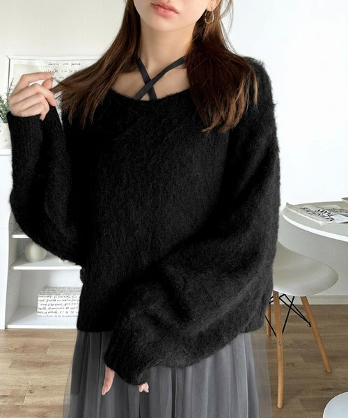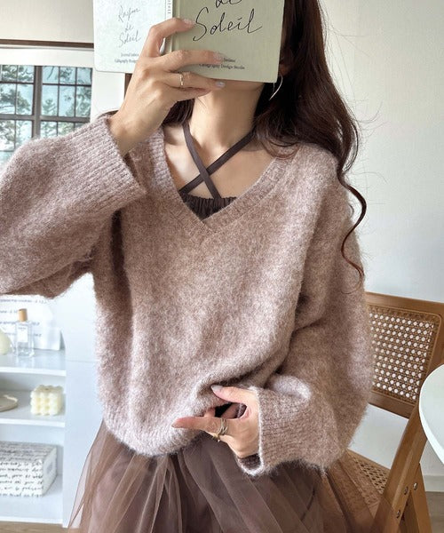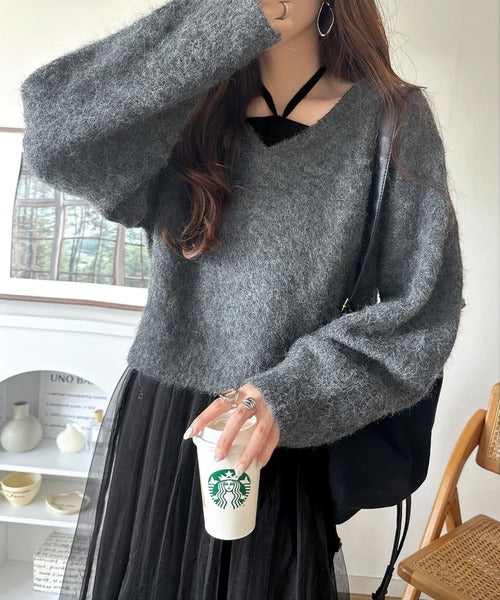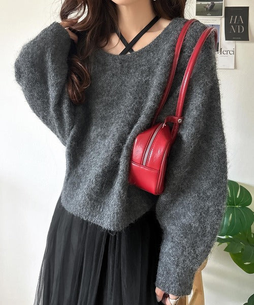・トップスは、ぽわん袖デザインの毛足のあるニット素材のプルオーバー