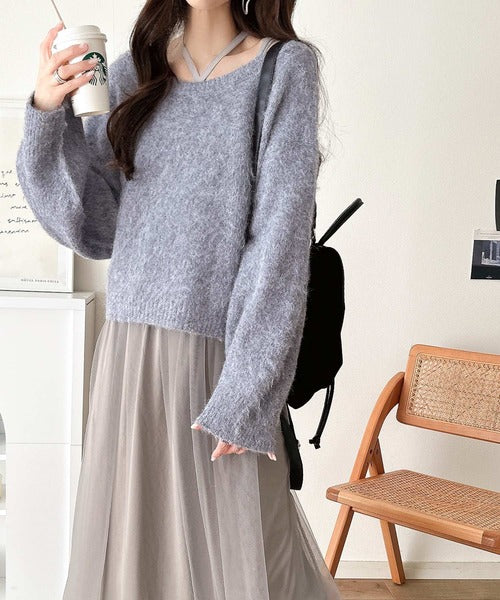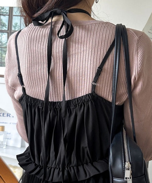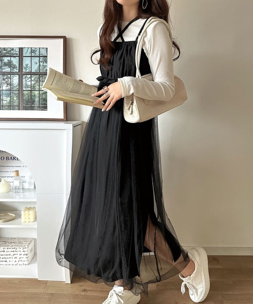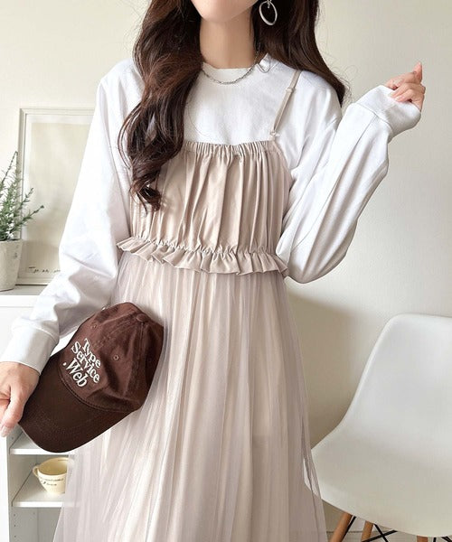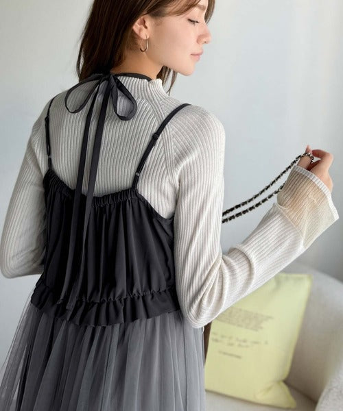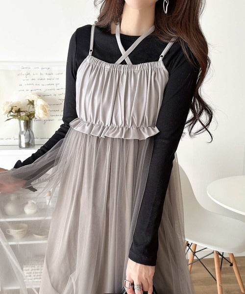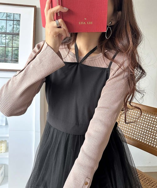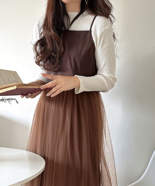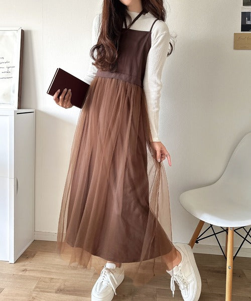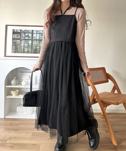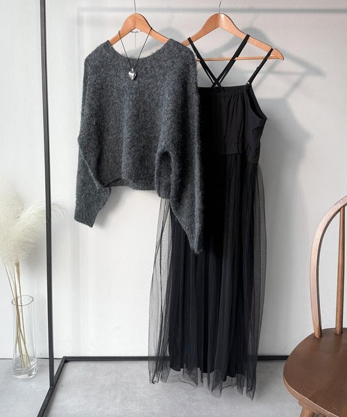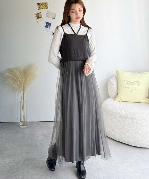 ニットとチュールのコンビネーションが特徴的なワンピースセット。