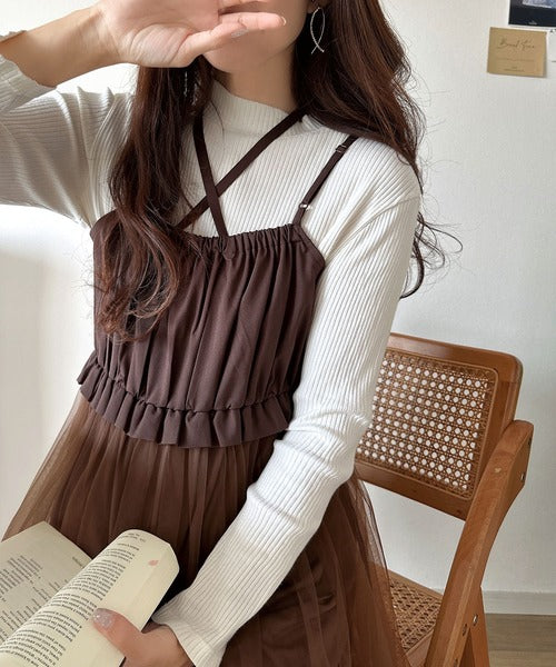 キャミワンピースの中にリブニットやシアートップスと合わせたレイヤードコーデもおすすめ♪