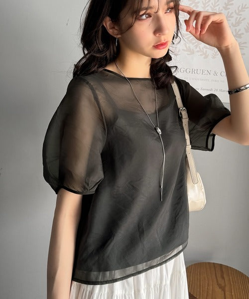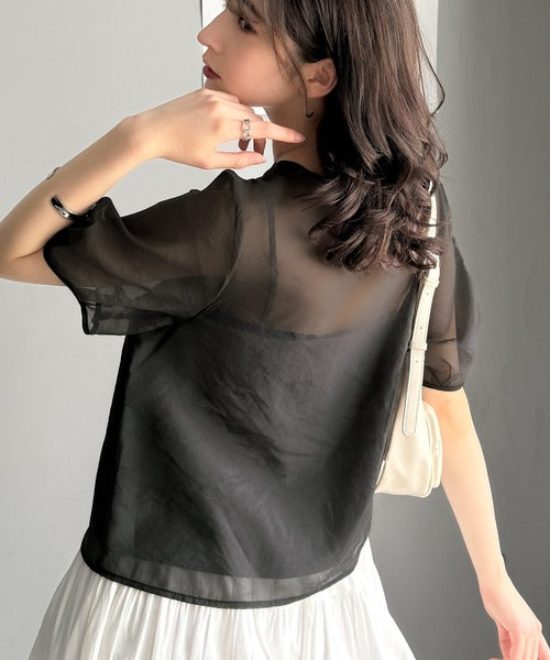 キャミドッキングのブラウスは、シアー素材を使用し洗練されたデザインが魅力の一枚。