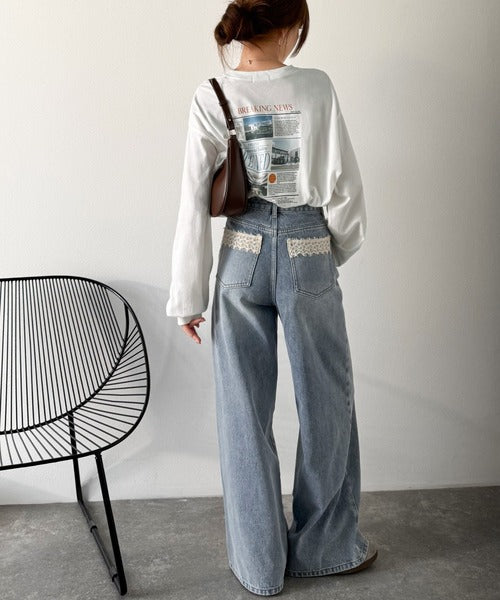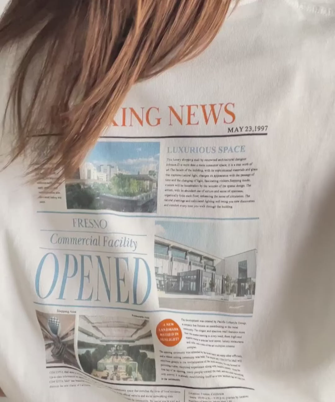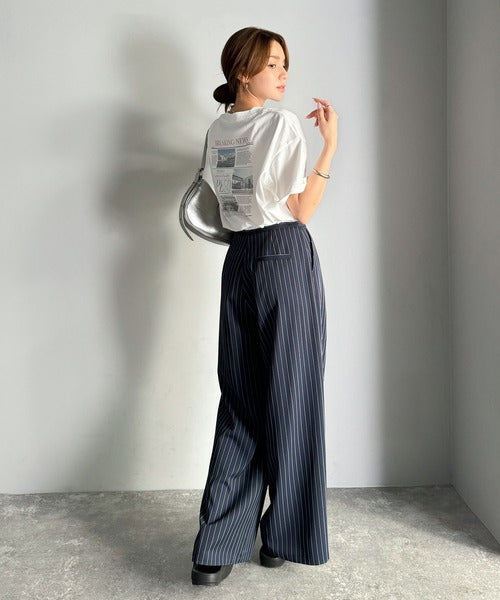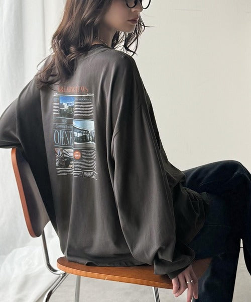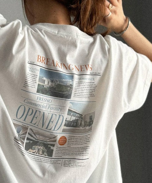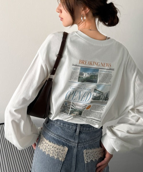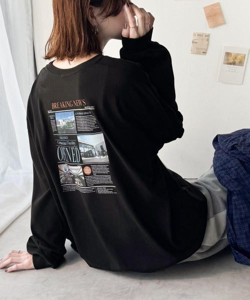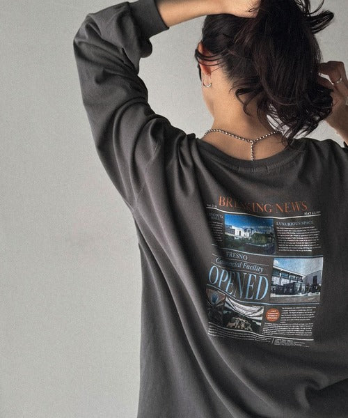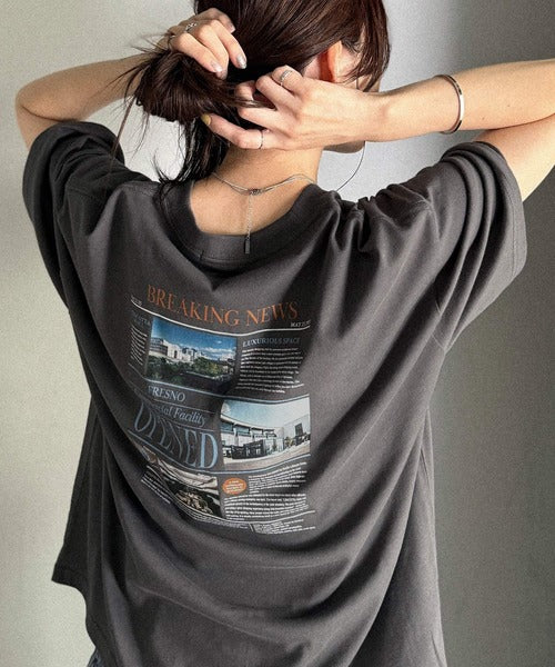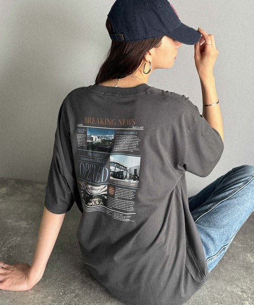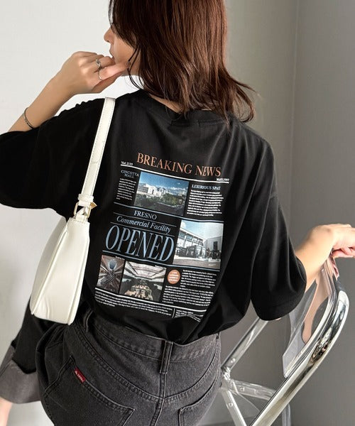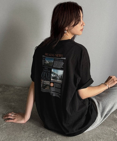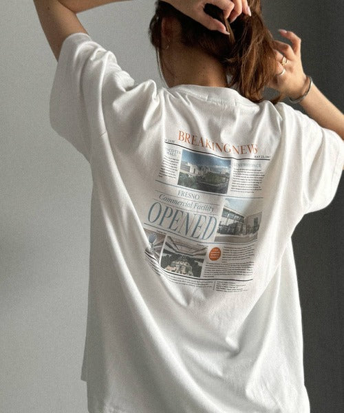 ニュースペーパー風のバックプリントが目を引く、こだわりの1枚です。