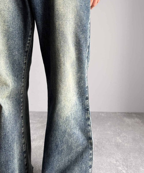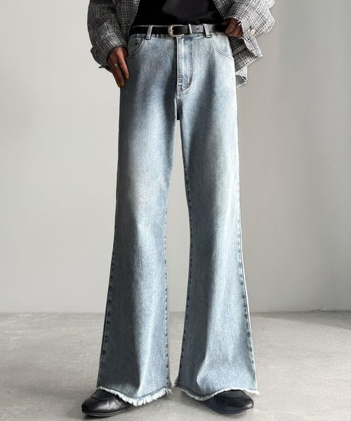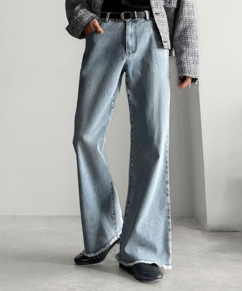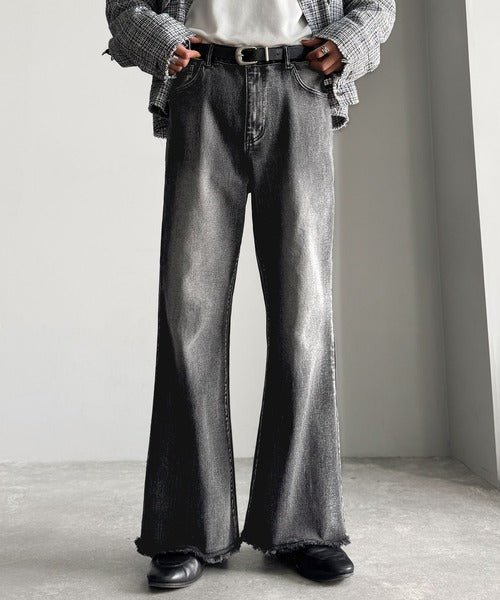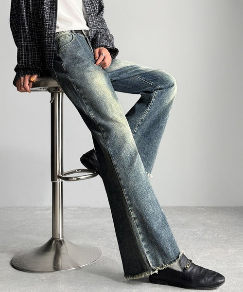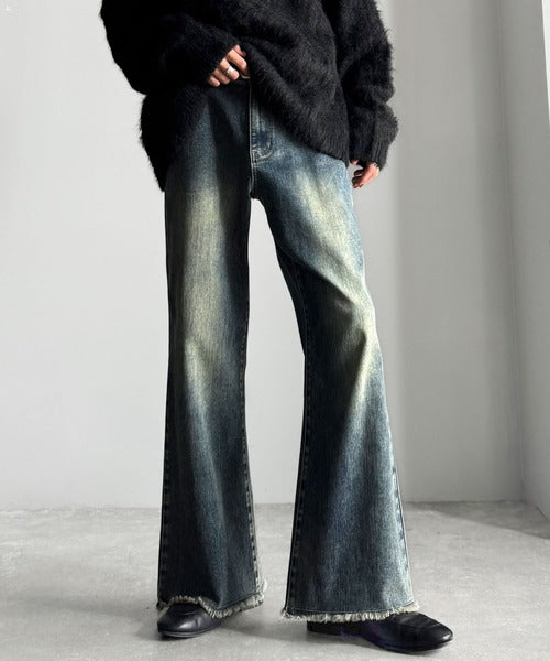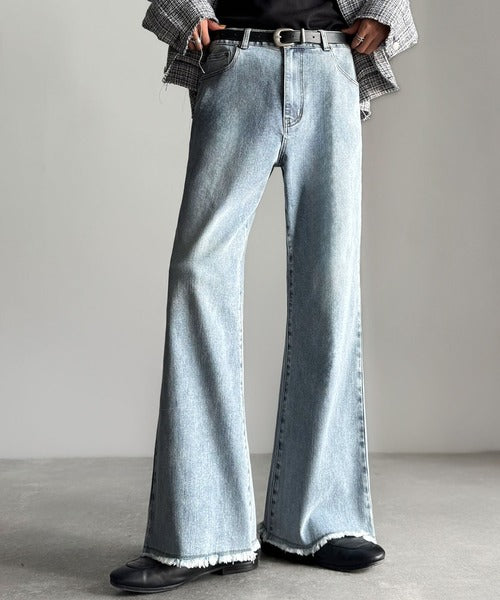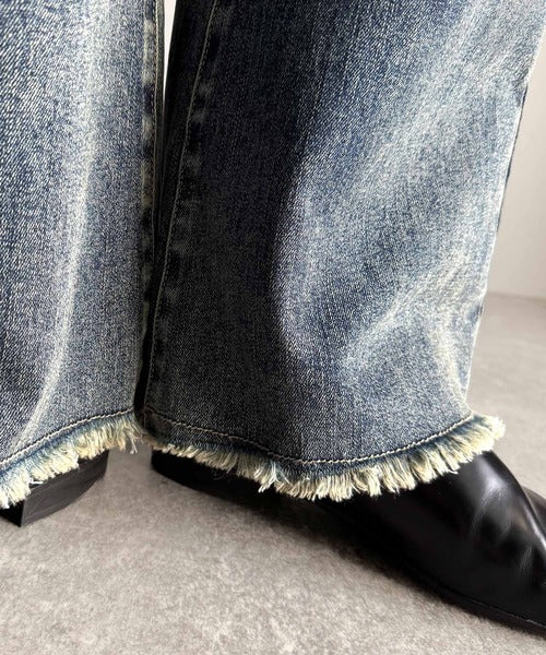【Classical Origin】「スタイル盛れる。」ブラスト&裾フリンジ加工ストレッチ素材スリムフレアデニムパンツ/Blasted & Fringed Stretch Slim Flare Denim Pants co0900008