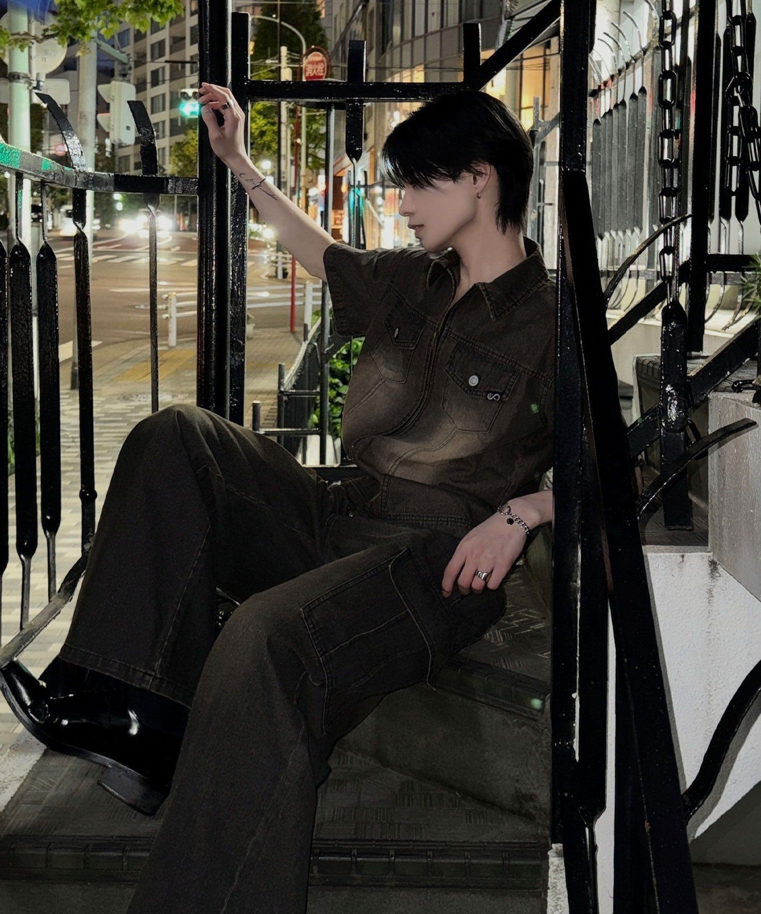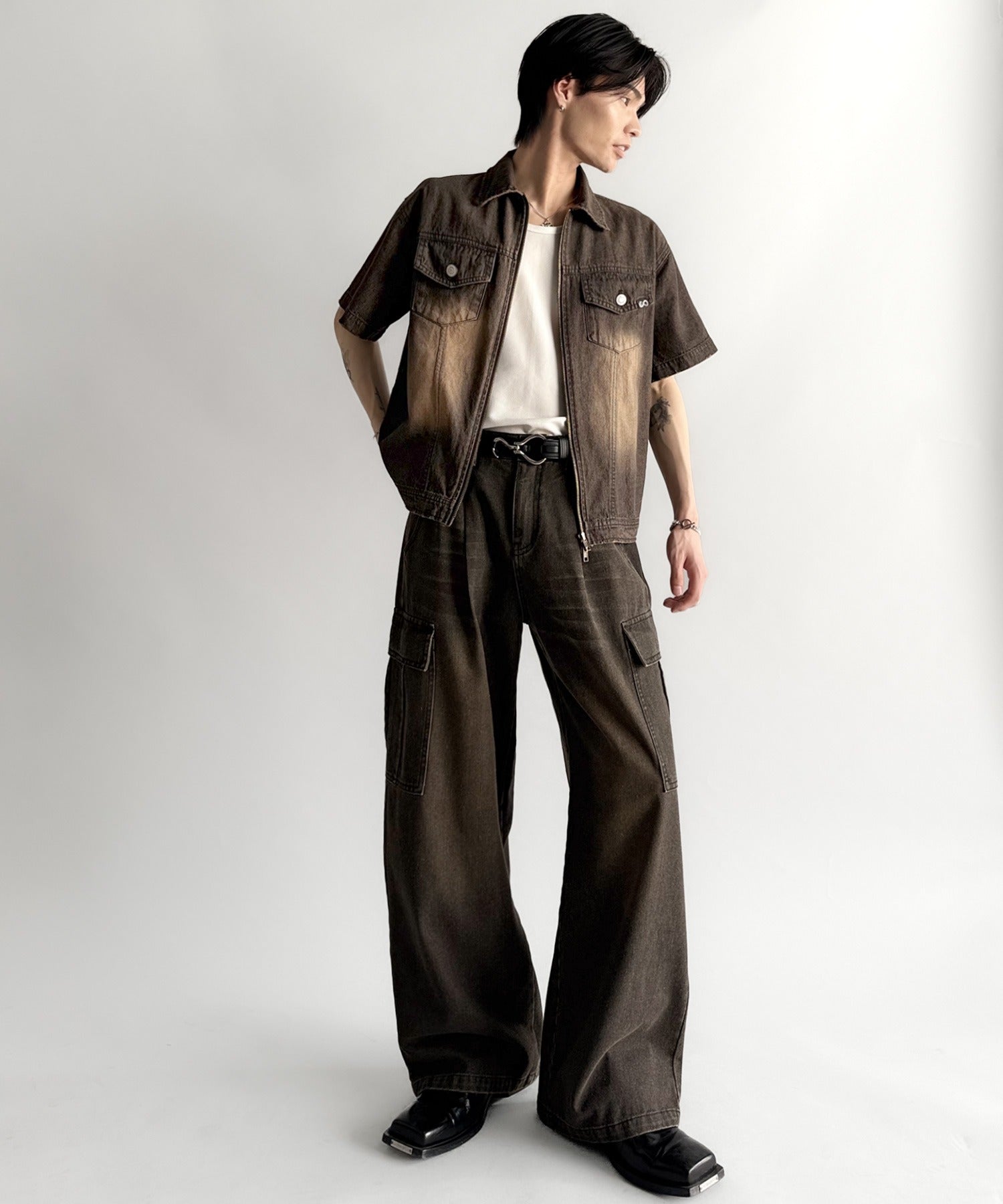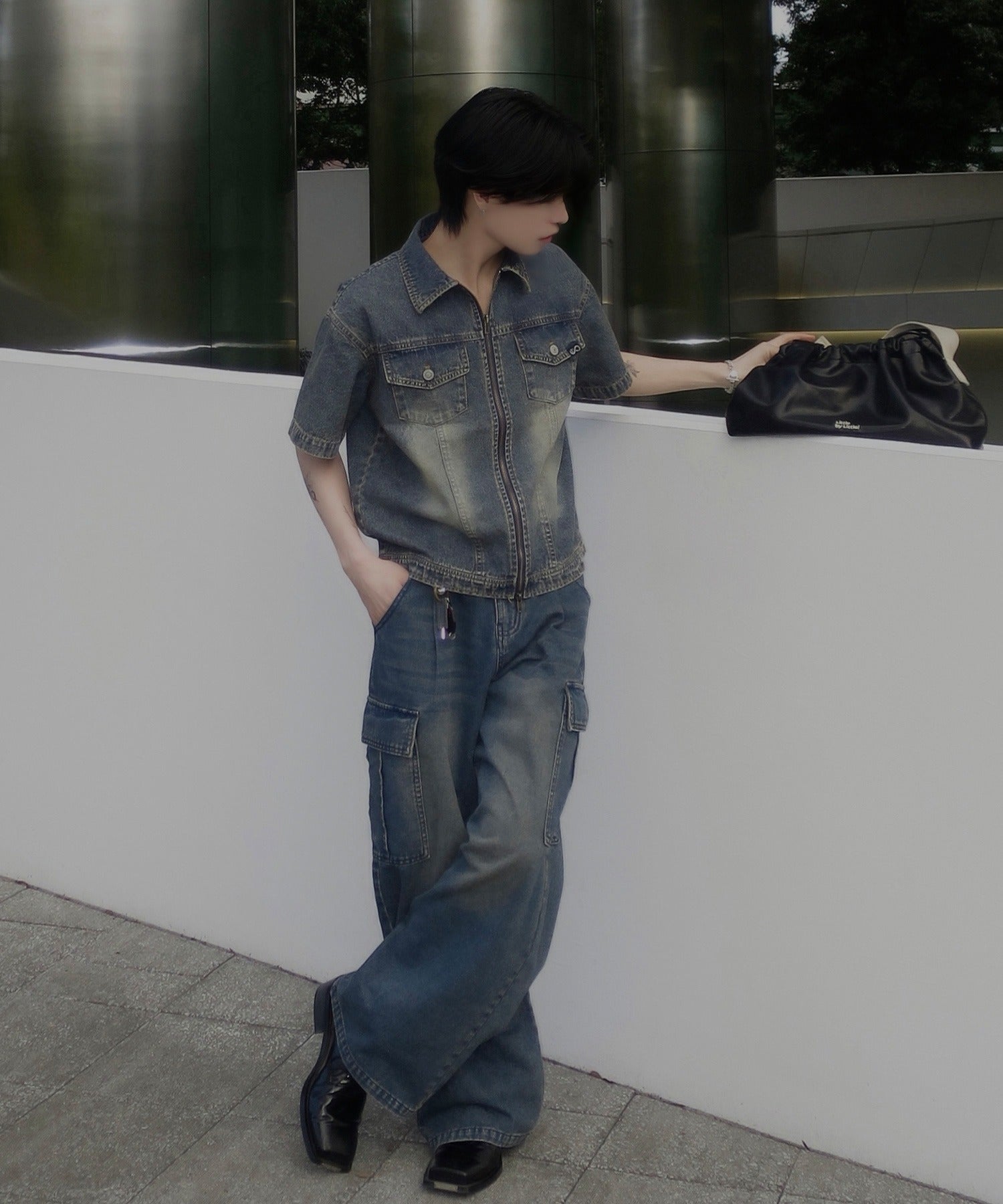 ・ヴィンテージウォッシュダブルジップショートデニムシャツ(品番:co1010014)とセットアップ風