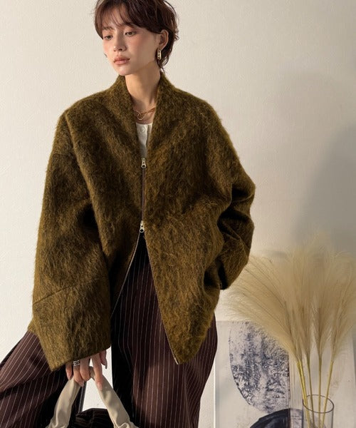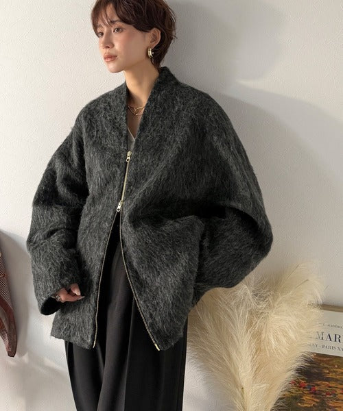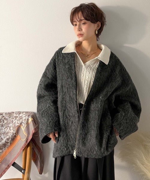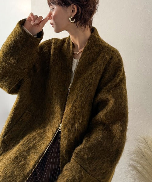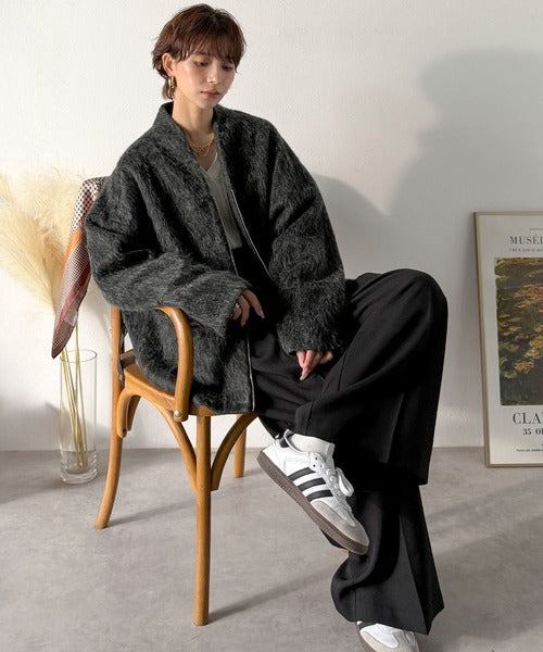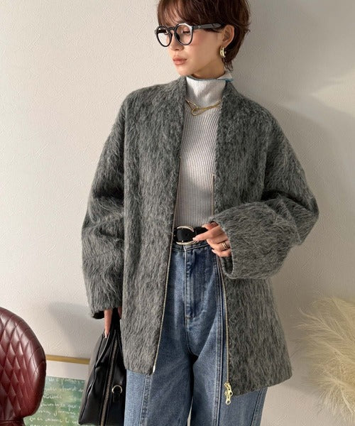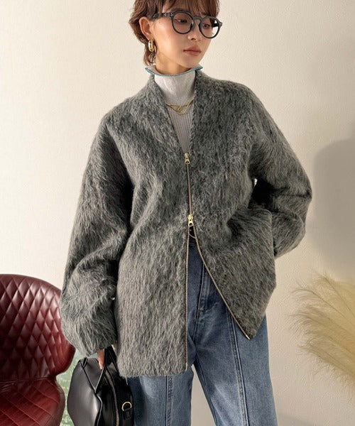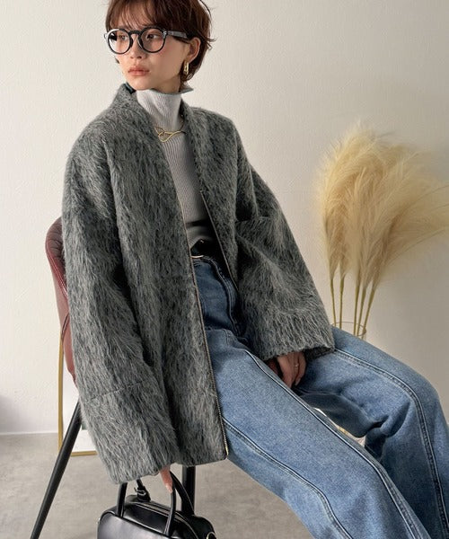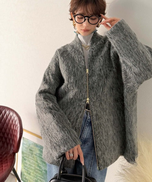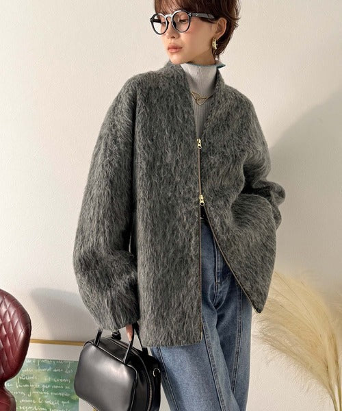 柔らかな毛足が高級感と保温性を兼ね備え、上下から開くダブルジップが抜け感を演出。